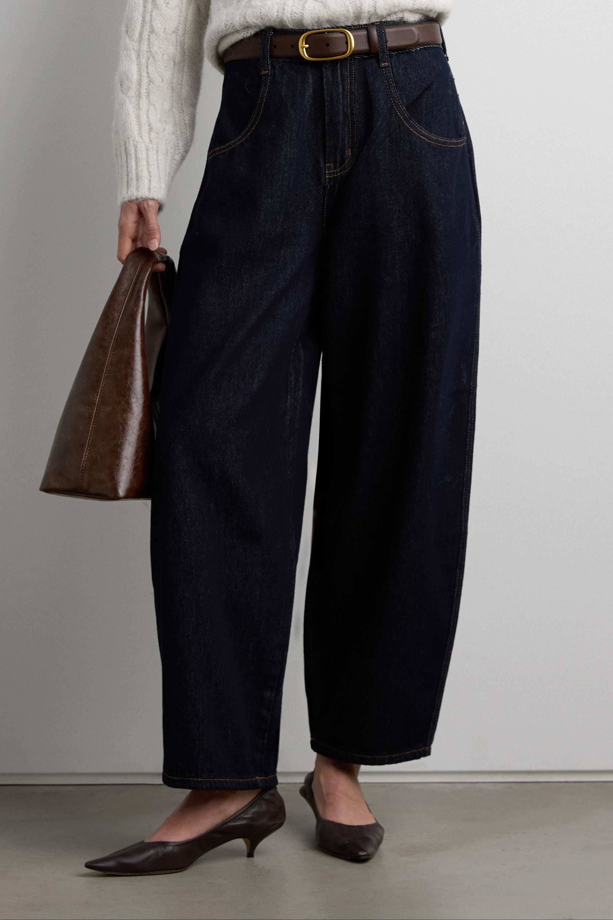 These barrel jeans are cut from a mid-weight, non-stretch dark wash denim and sits high on the waist. It's made for a relaxed fit and is complete with front and back patch pockets and contrast stitch details.