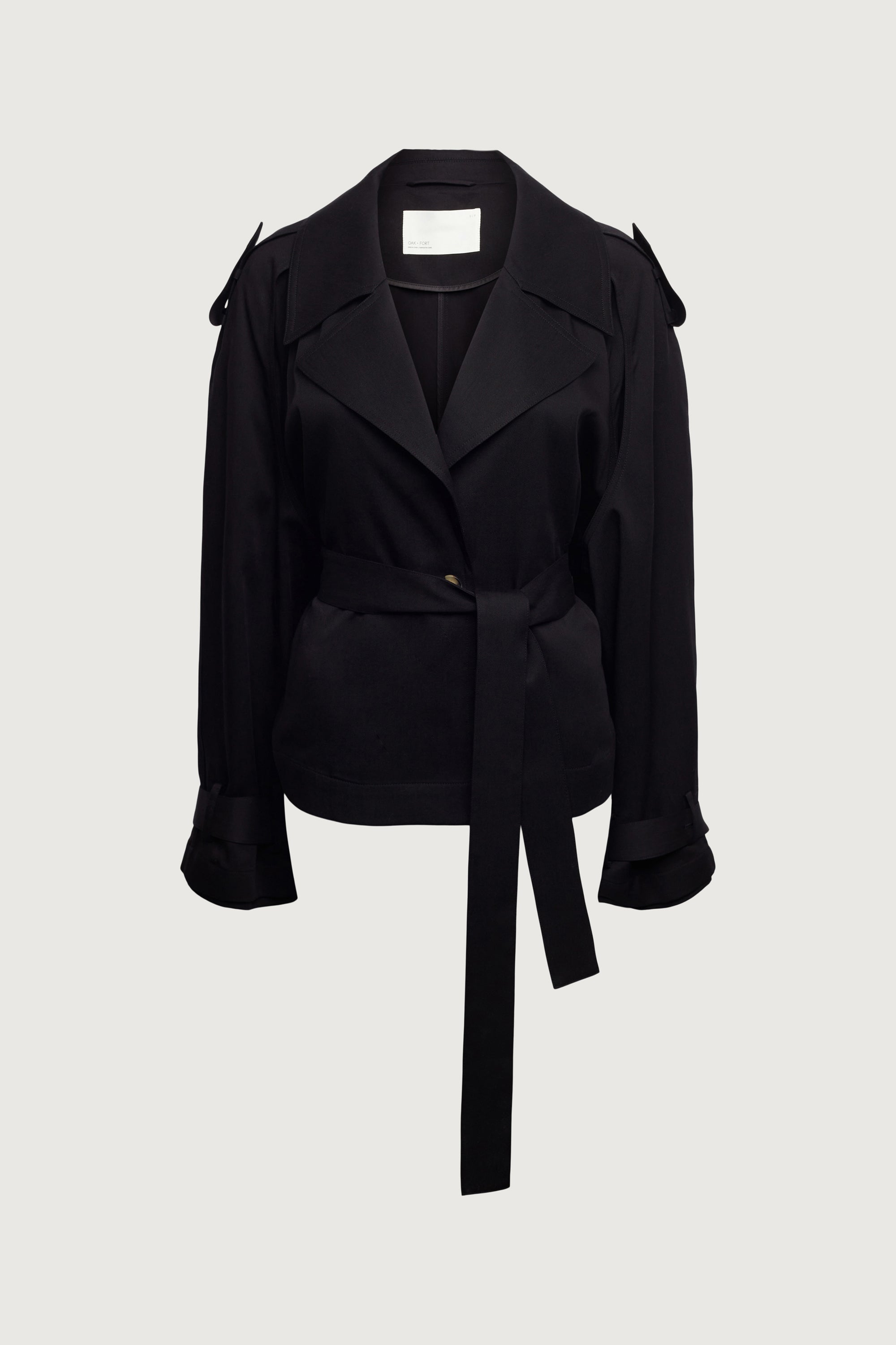 Notched lapels. Epaulettes. Storm flaps. Sleeve panel design. Belted sleeves and waist. Single button closure.