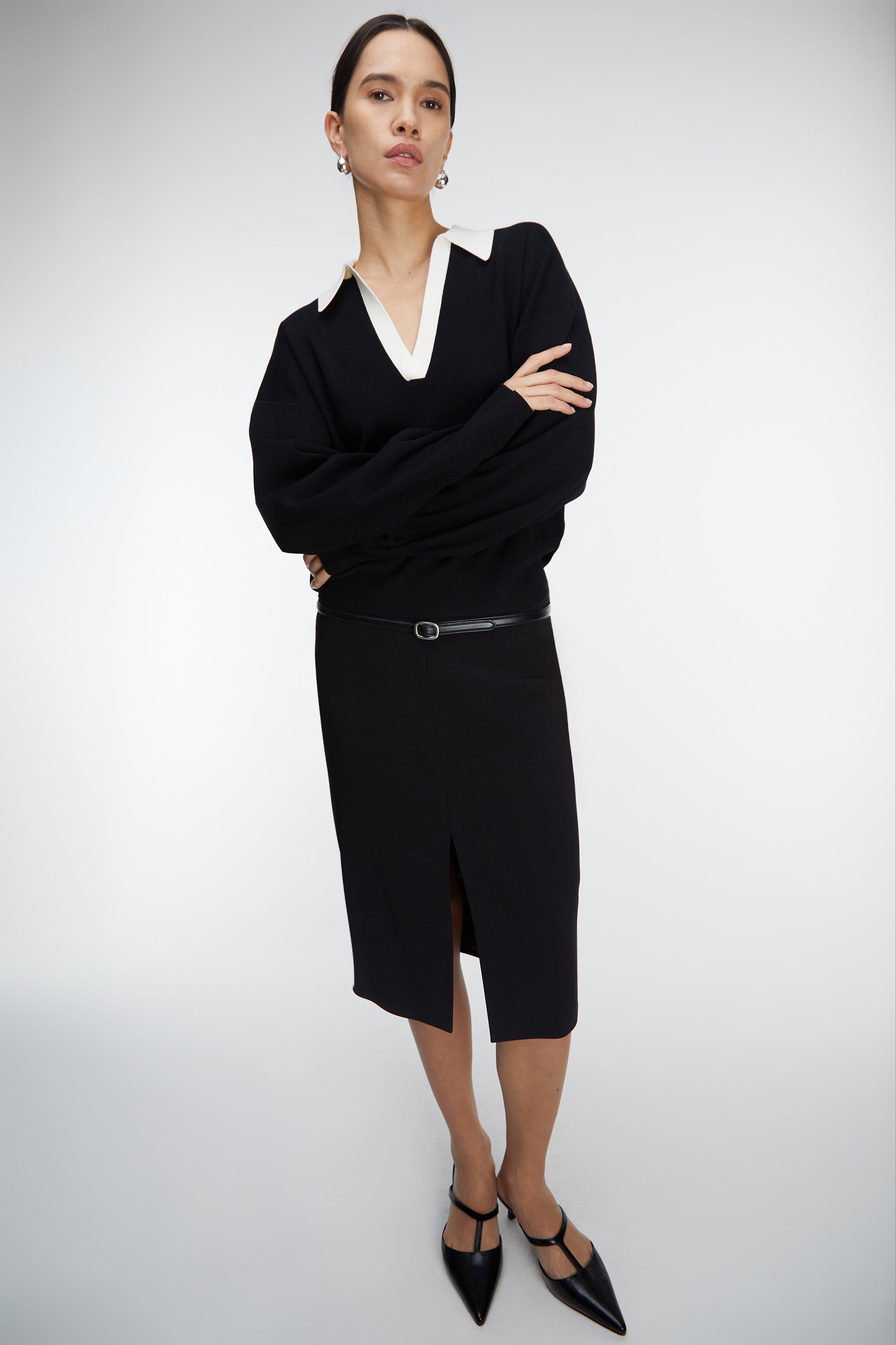 This midi suiting skirt is made in a relaxed fit from a twill suiting fabric. An updated take on your classic pencil skirt featuring a mid-rise waist and a front slit for added detail. Wear yours with a cropped sweater or with a vegan leather bomber jacket.