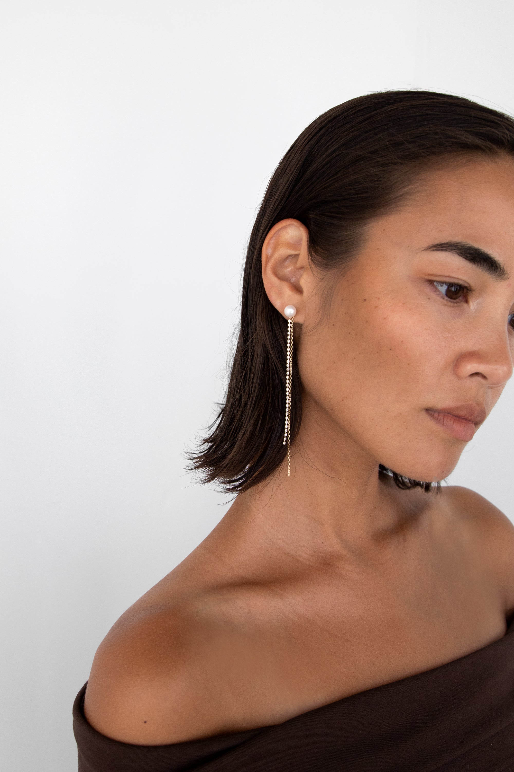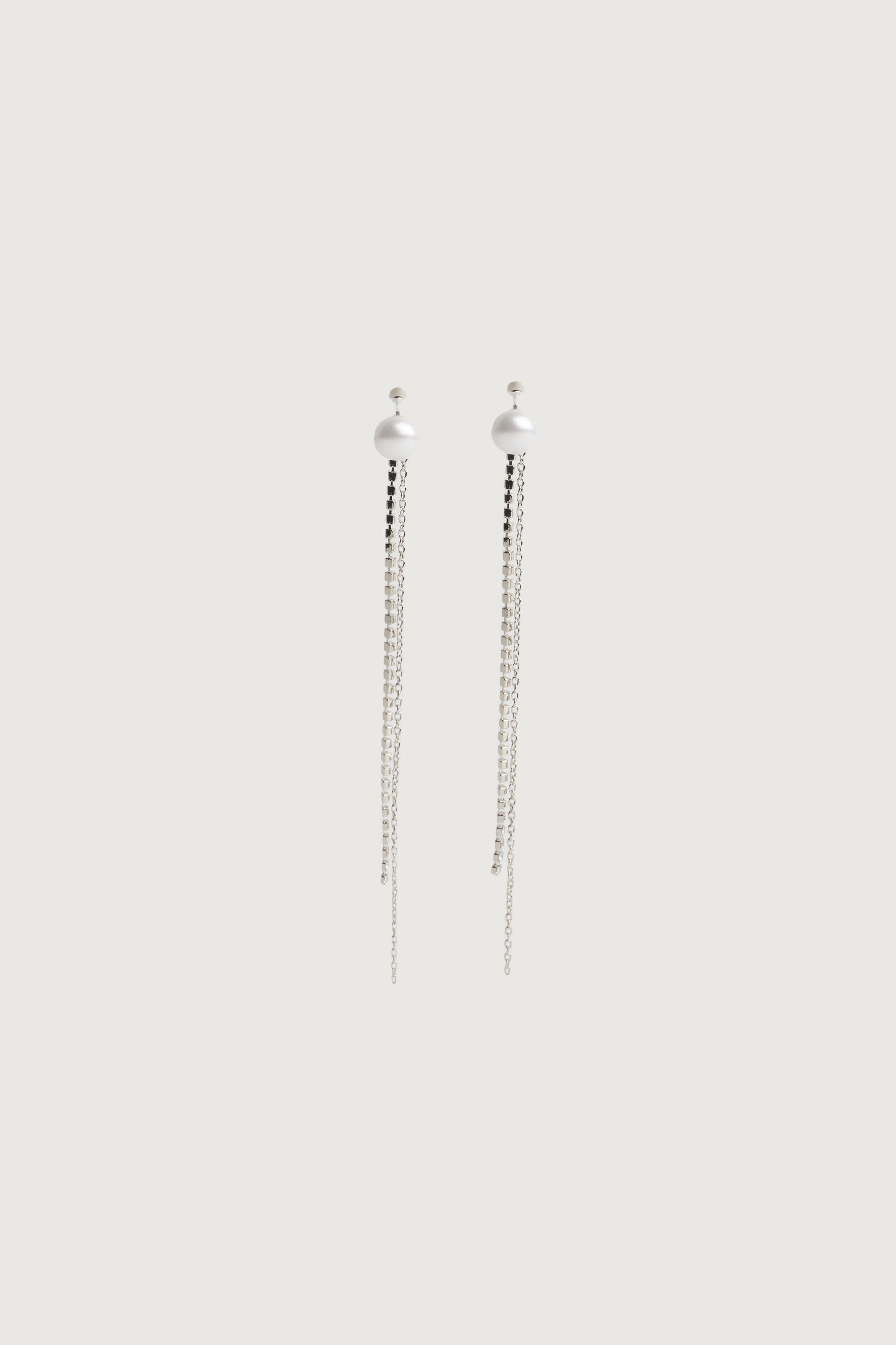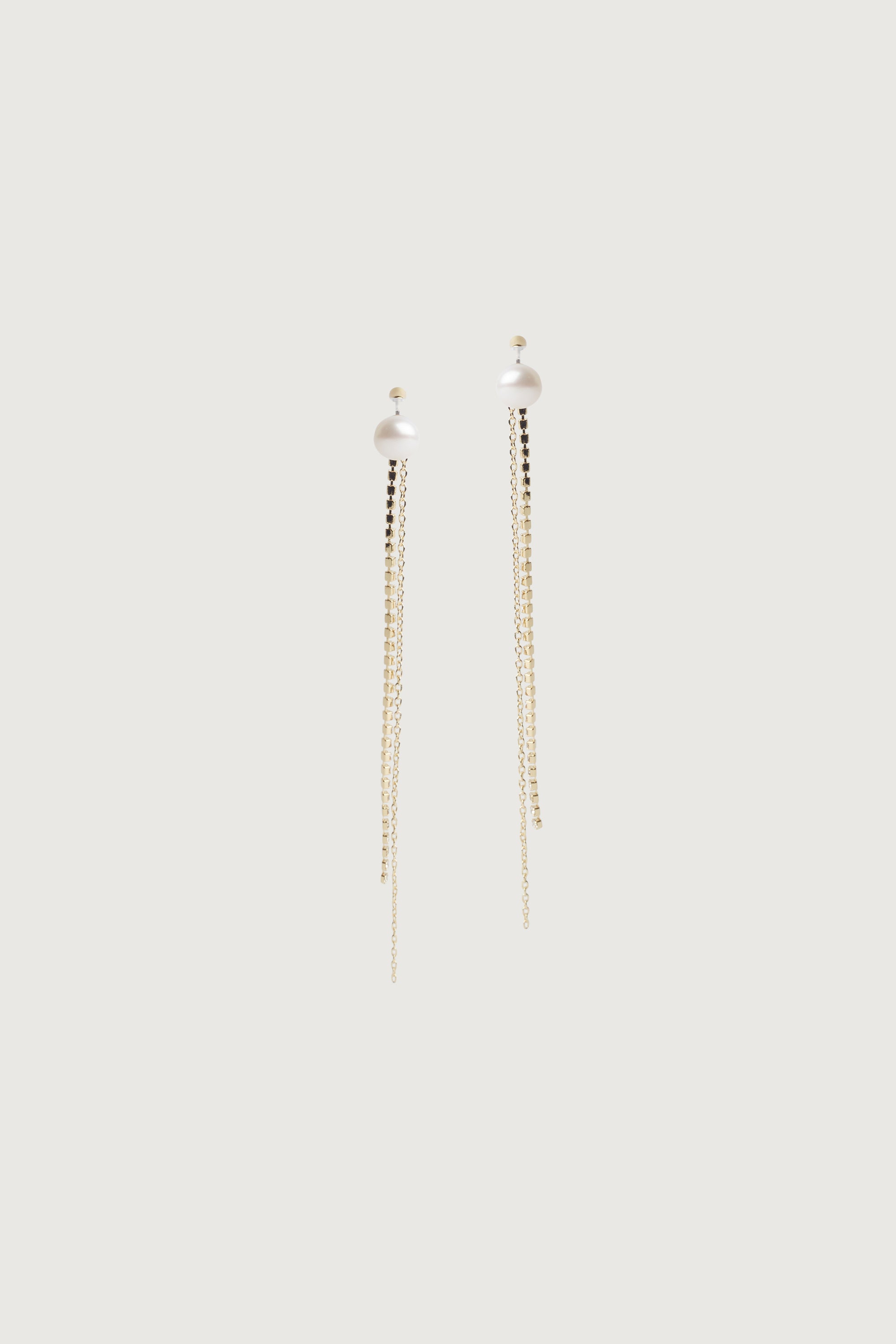 This natural pearl stud earring features two detachable drop extensions: one chain and one zirconia detailed drop. Wear these earrings with the drop chains or opt to only wear the pearl.