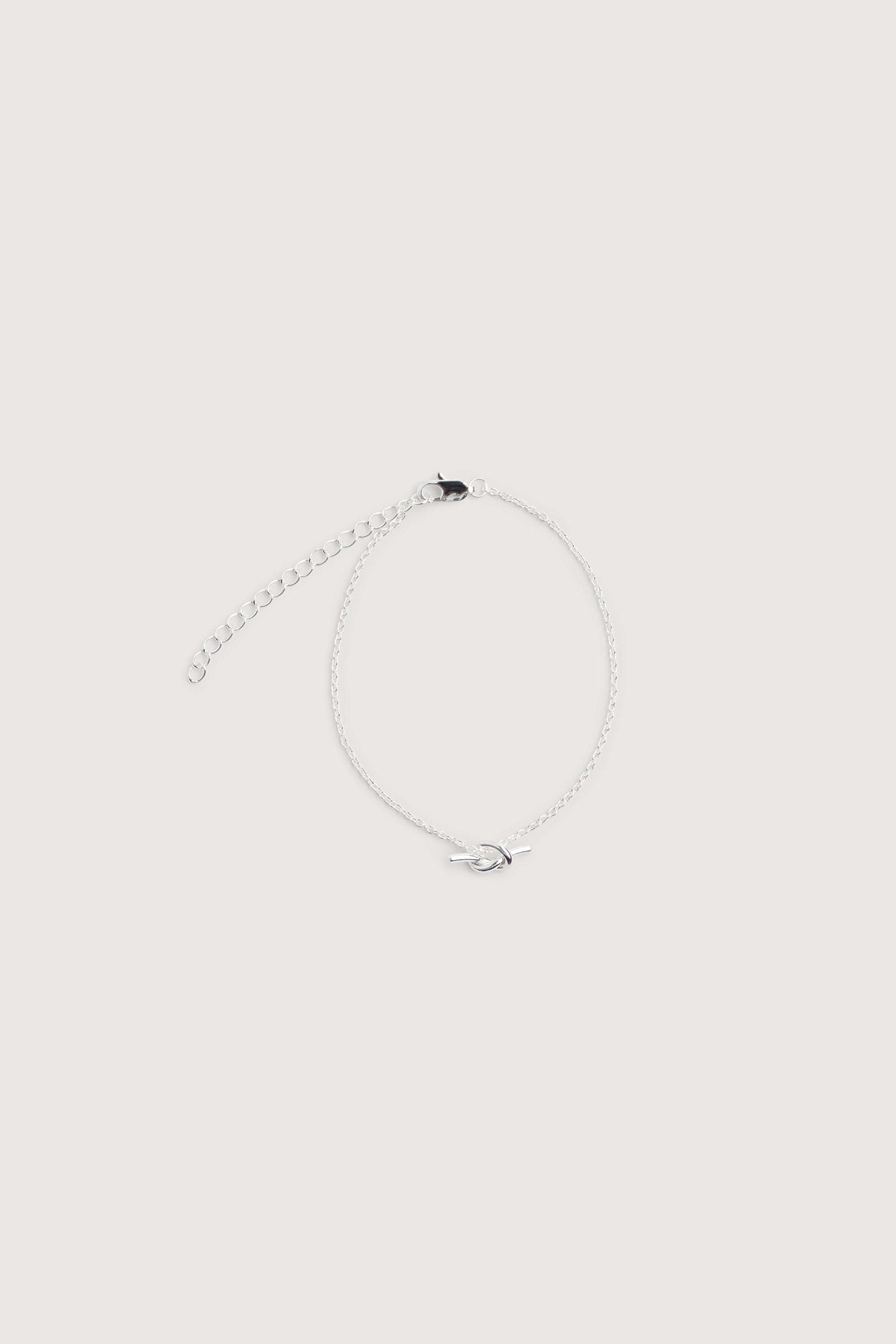 Rolo chain. Knot charm. Plated with 14k gold/silver. 2" extender chain. Lobster clasp.