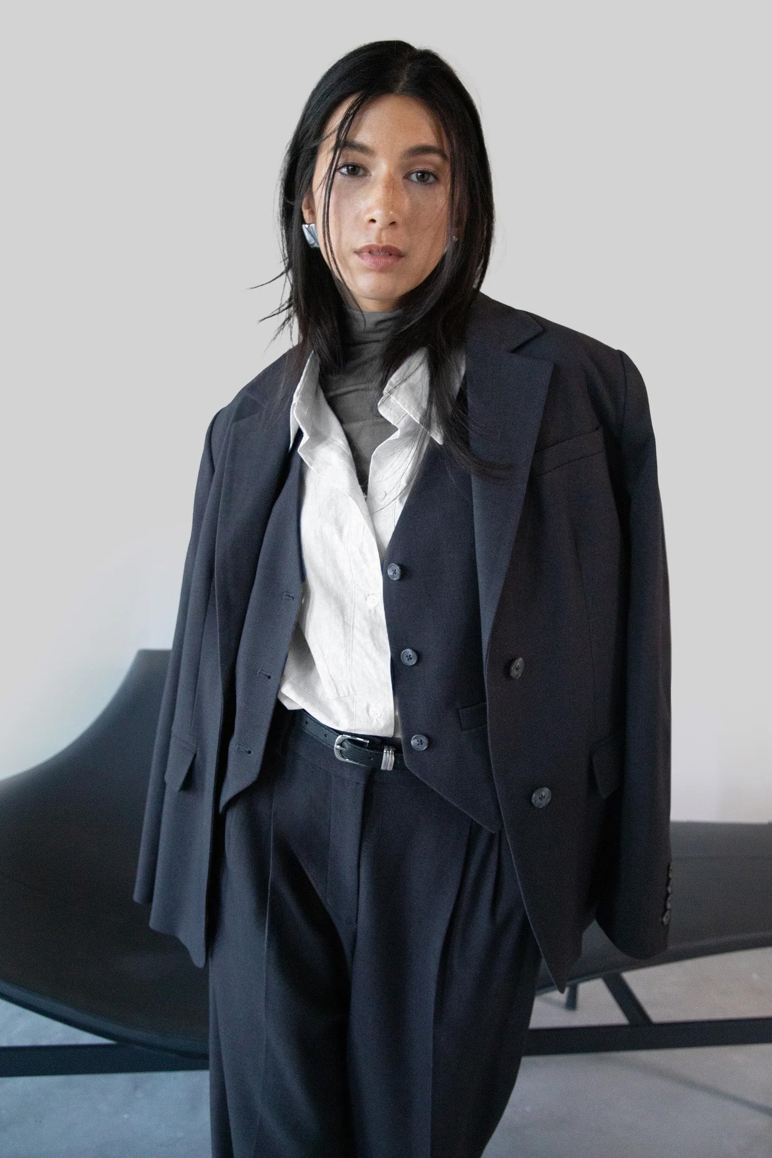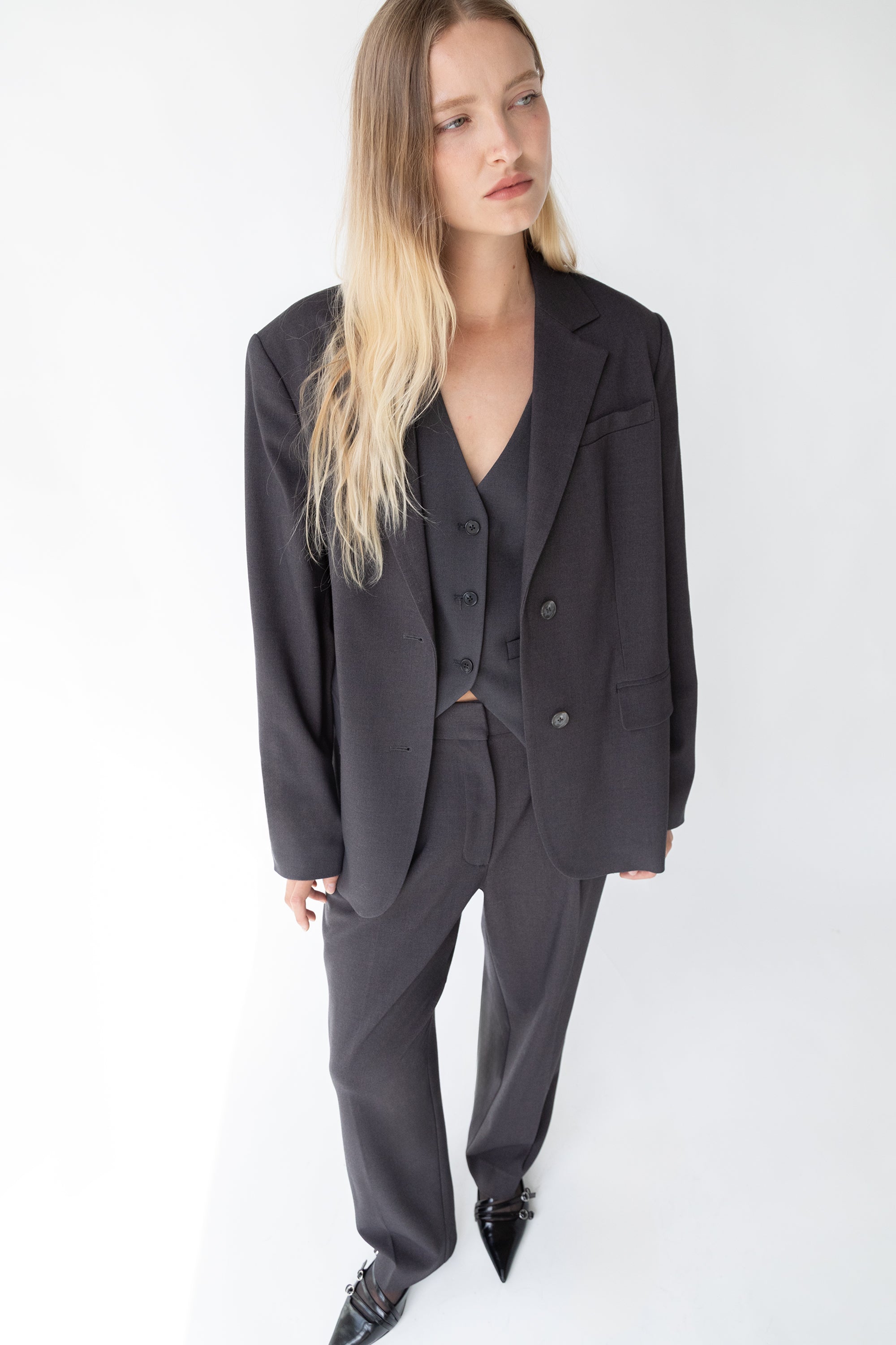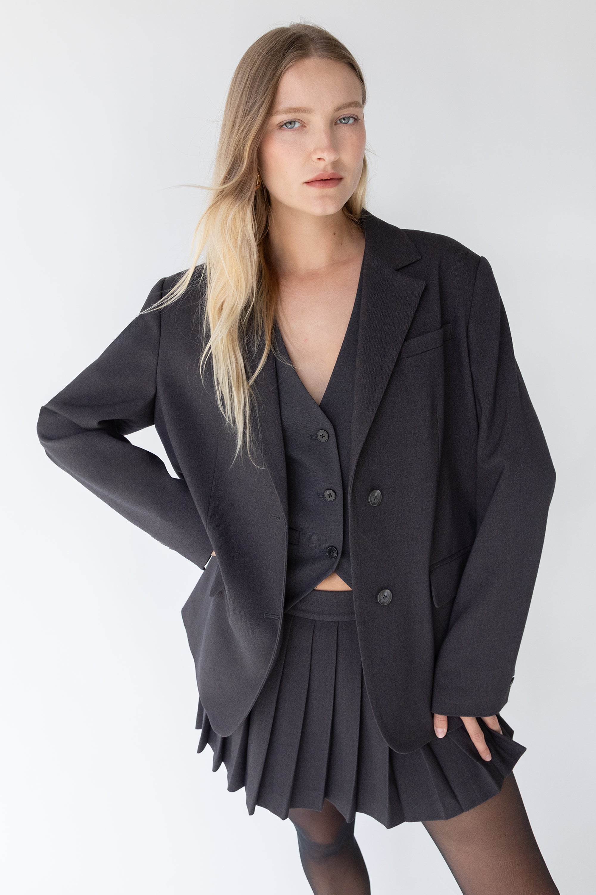 This wool blend blazer is made in an oversized fit and is blended with touches of wool. A classic wardrobe essential to add to your fall and winter rotation, style yours with the matching trousers or mini skirt.