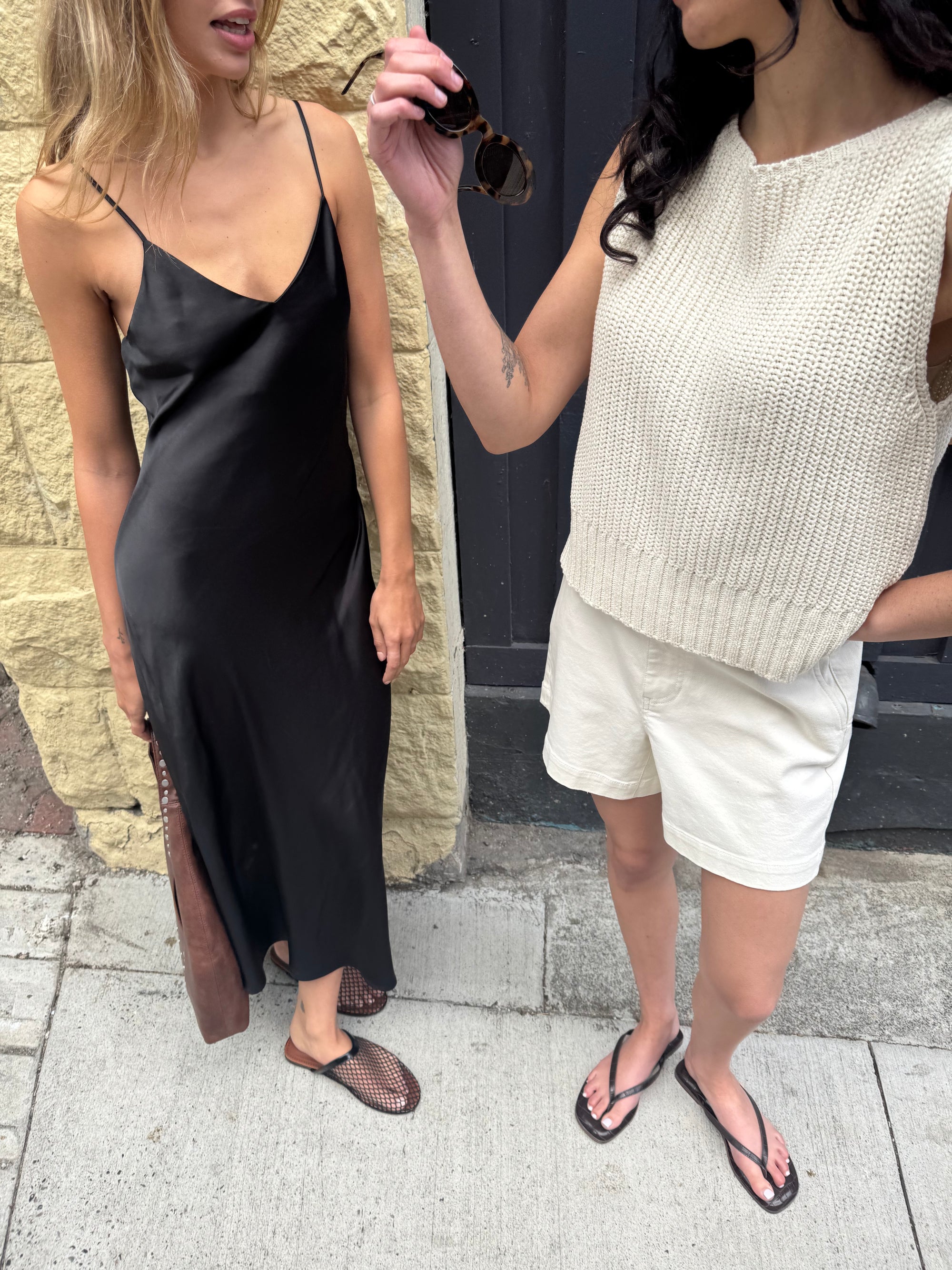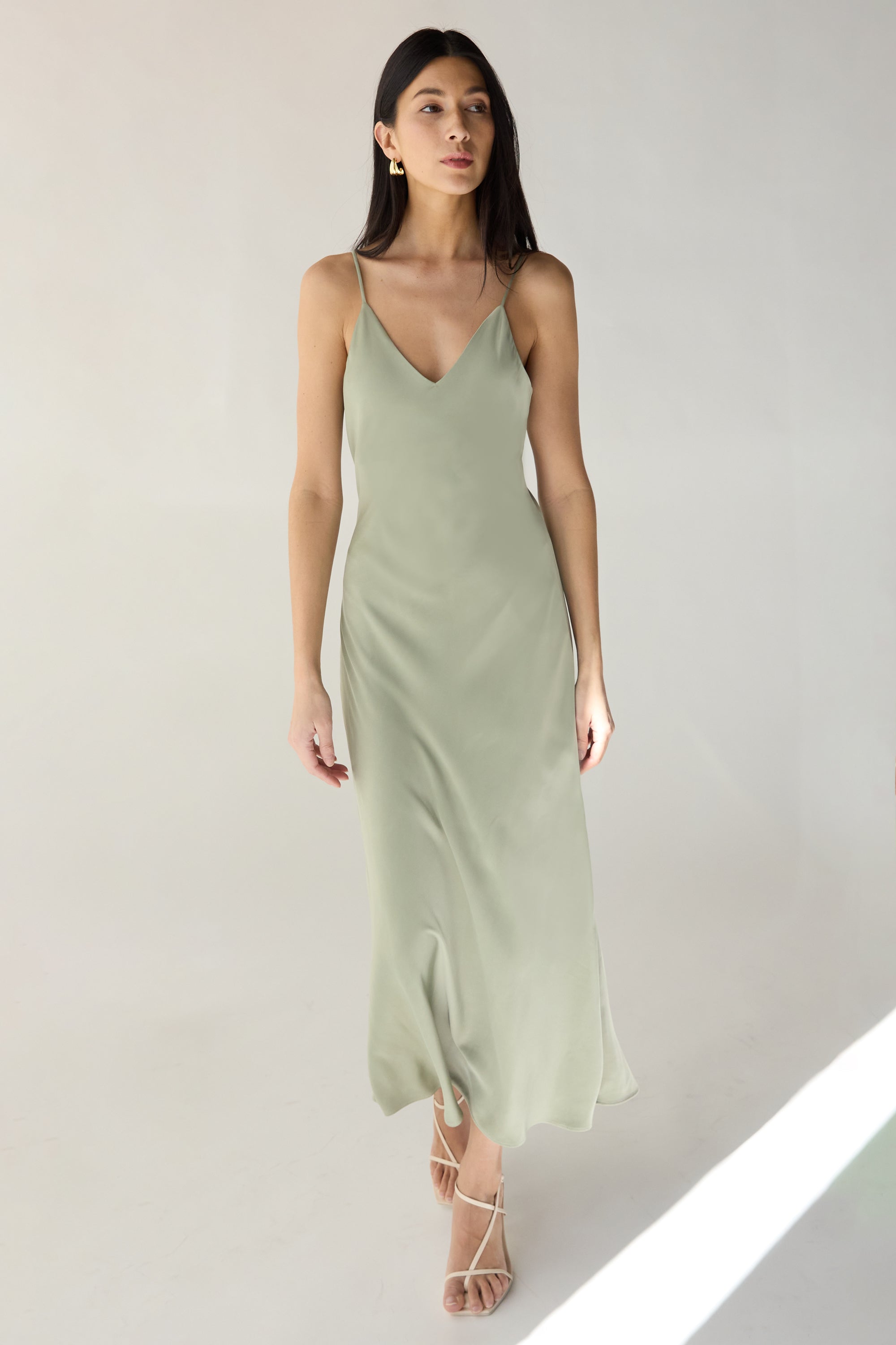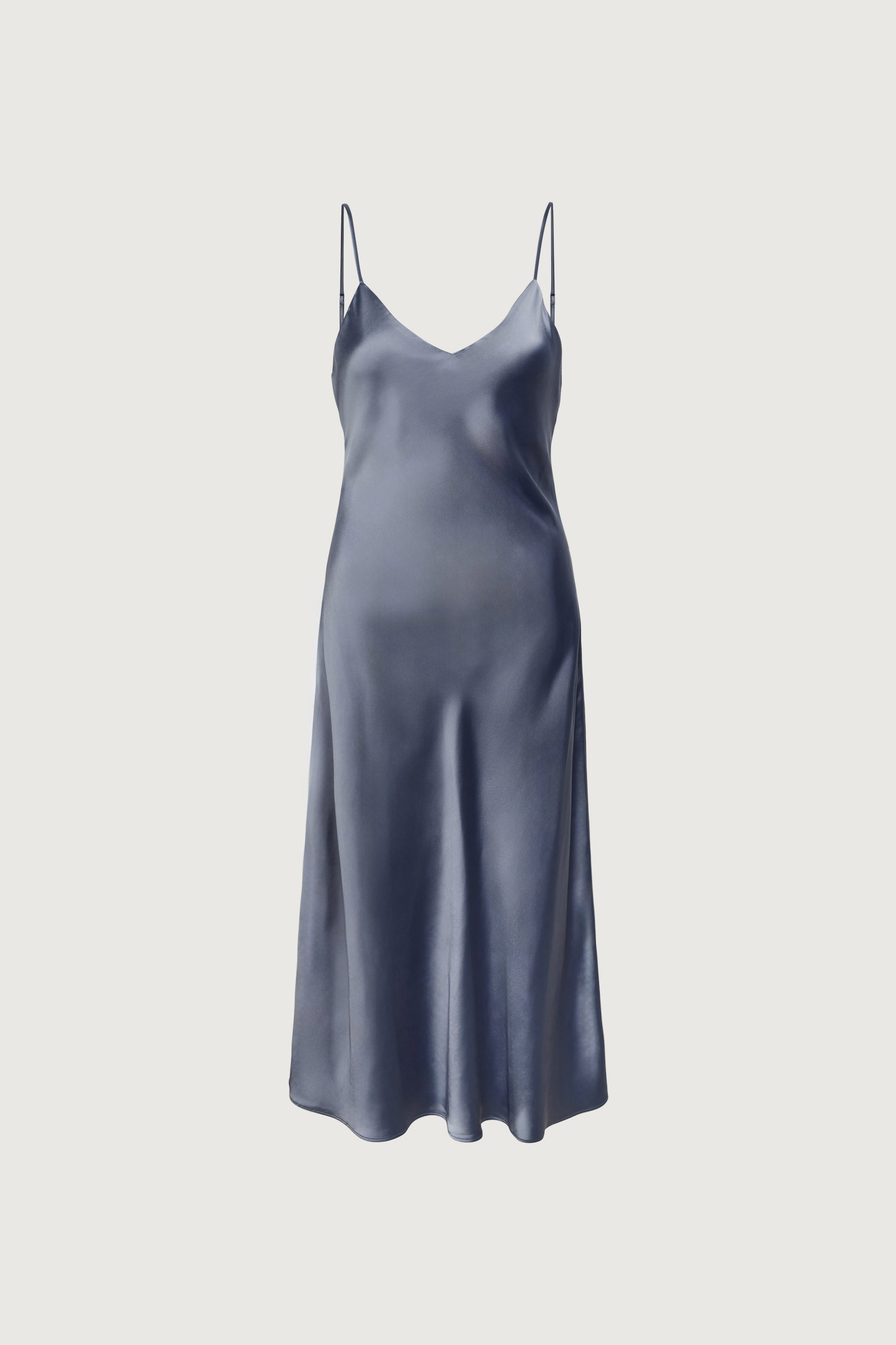 Satin fabric. Bias cut. V-neckline. Adjustable straps.