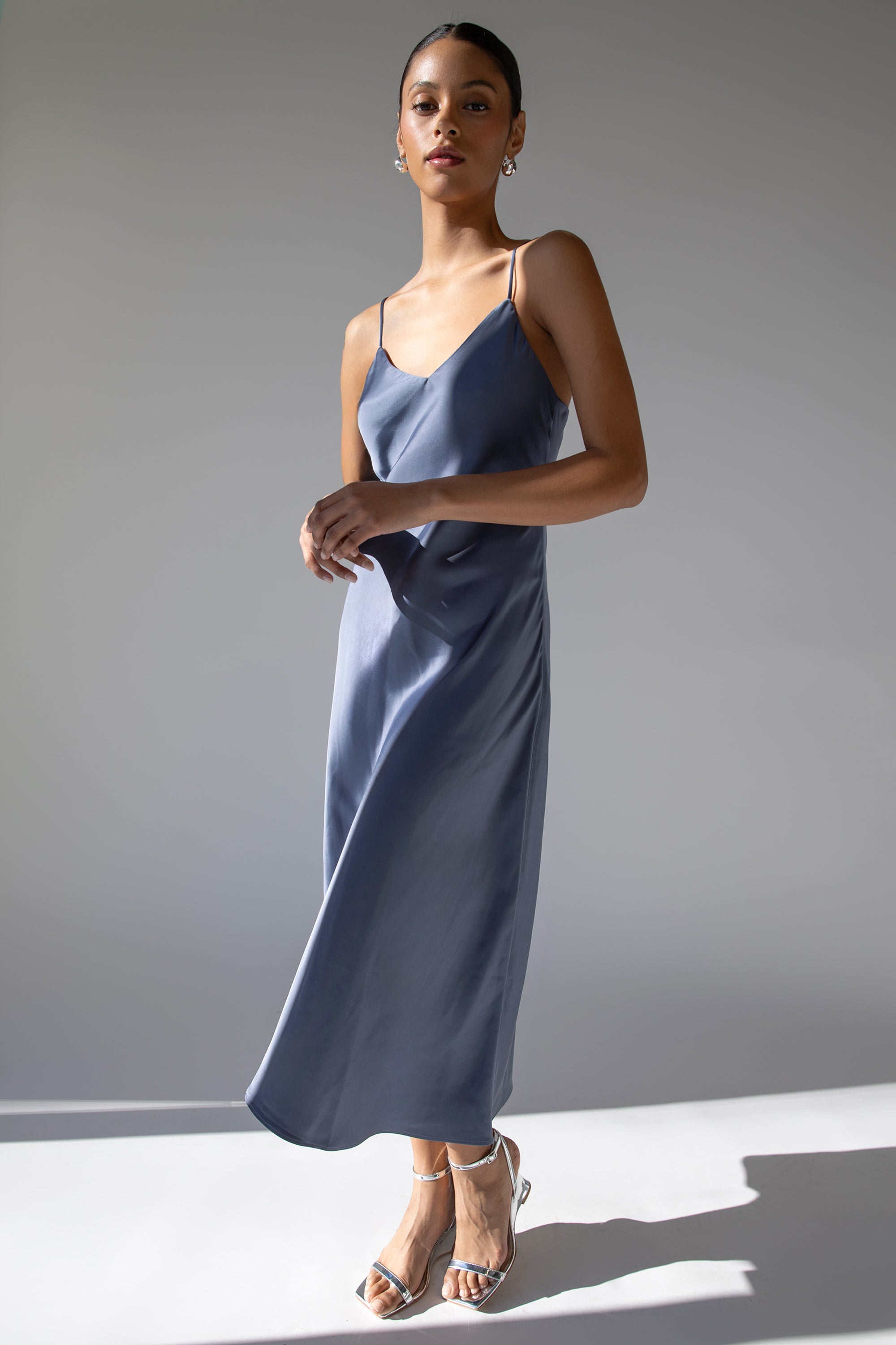Your fave satin V-neck midi slip dress is now updated with a better fit based on your feedback. It's made in a slim fit with bias cut that drapes perfectly to your body and has adjustable shoulder straps. A wardrobe essential you can wear in any season, wear it casually with sandals or dress it up with strappy heels.