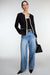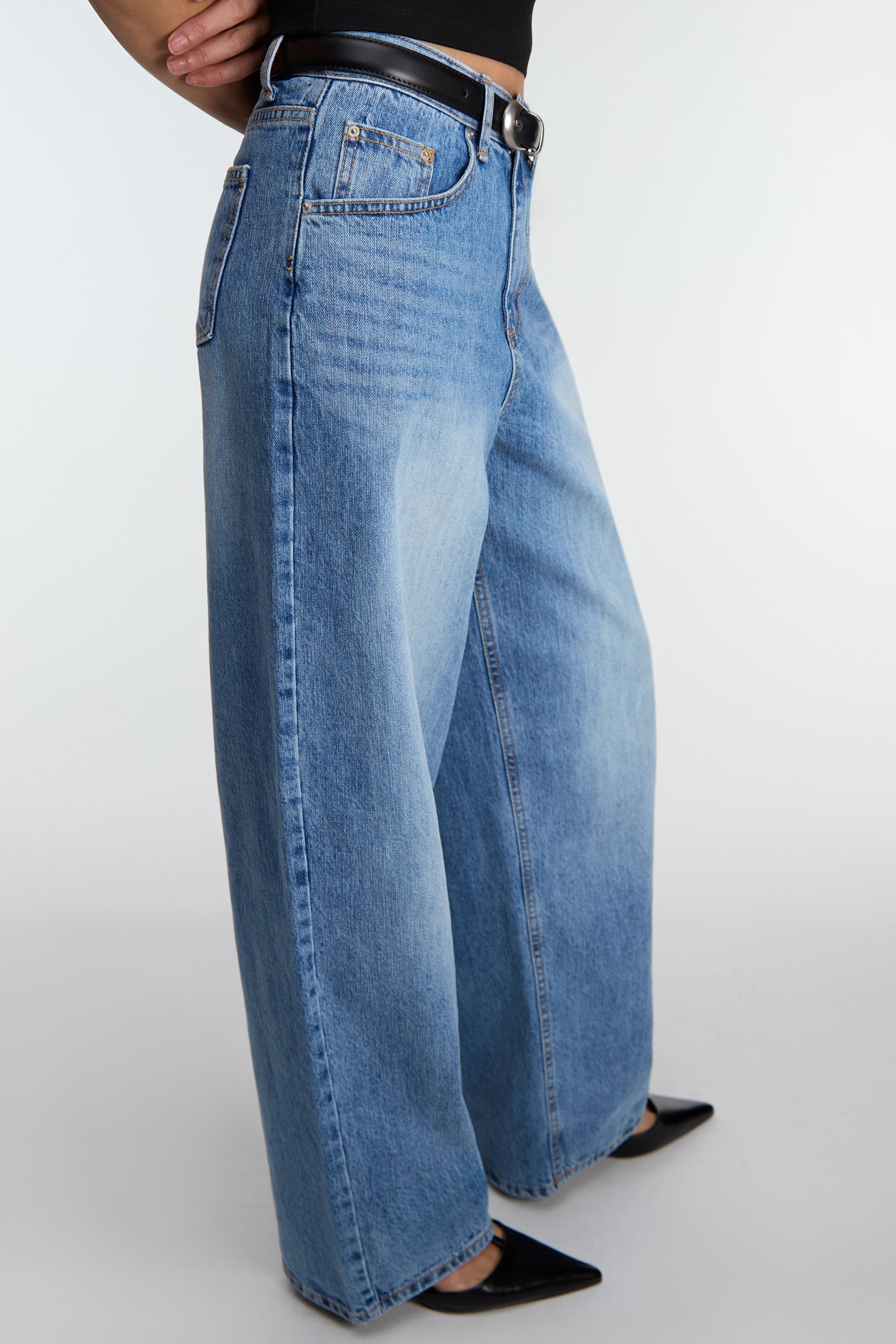 Mid-rise. Light wash. Wide leg. Five pockets. Zipper and button fly.