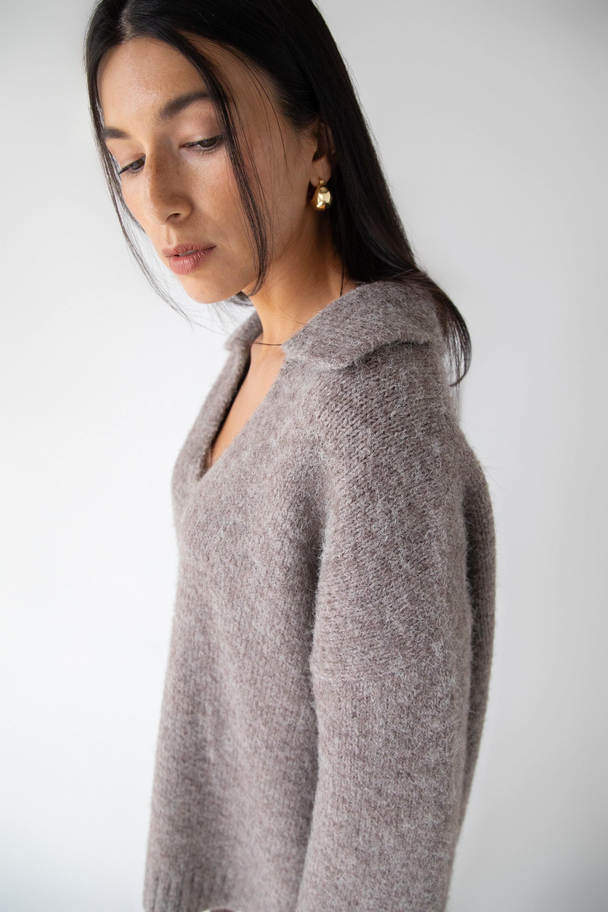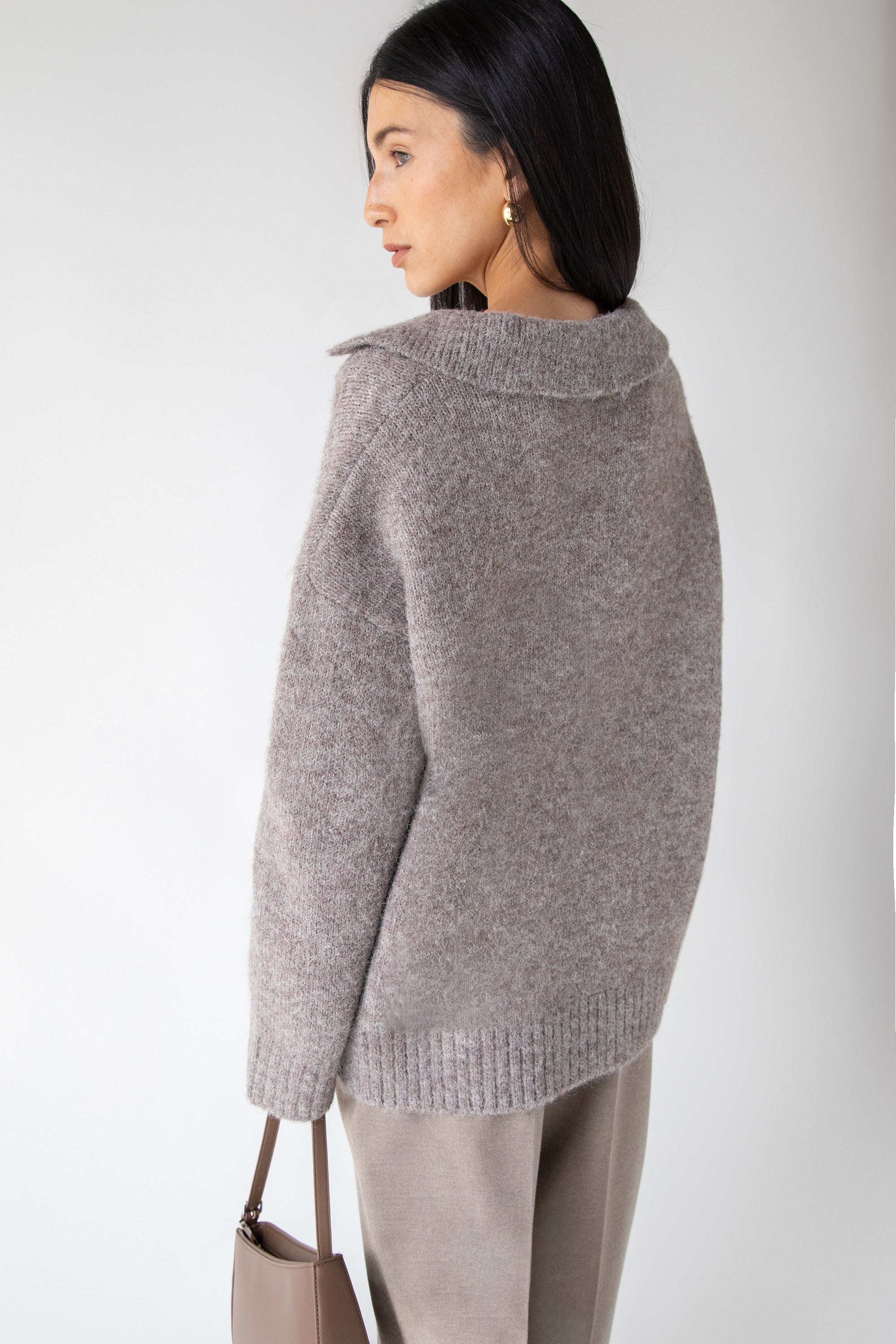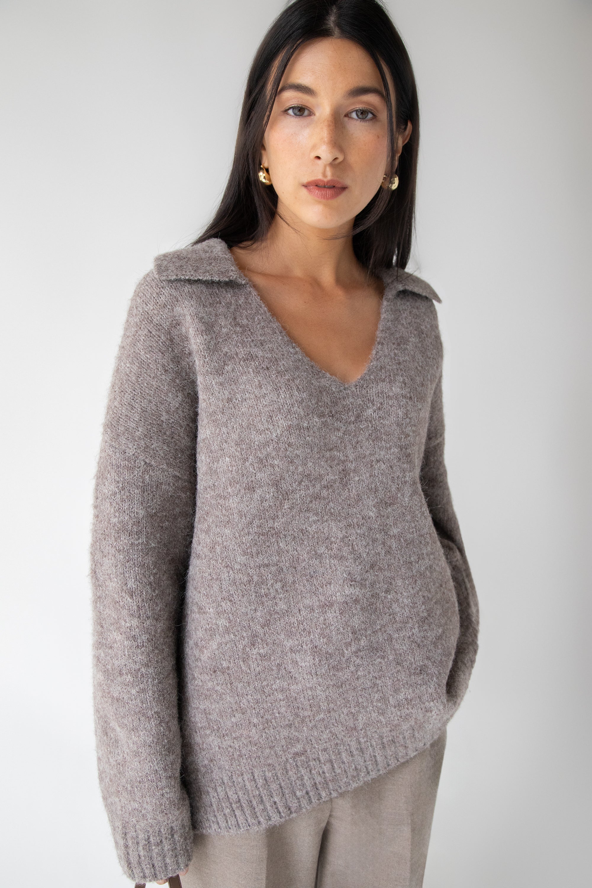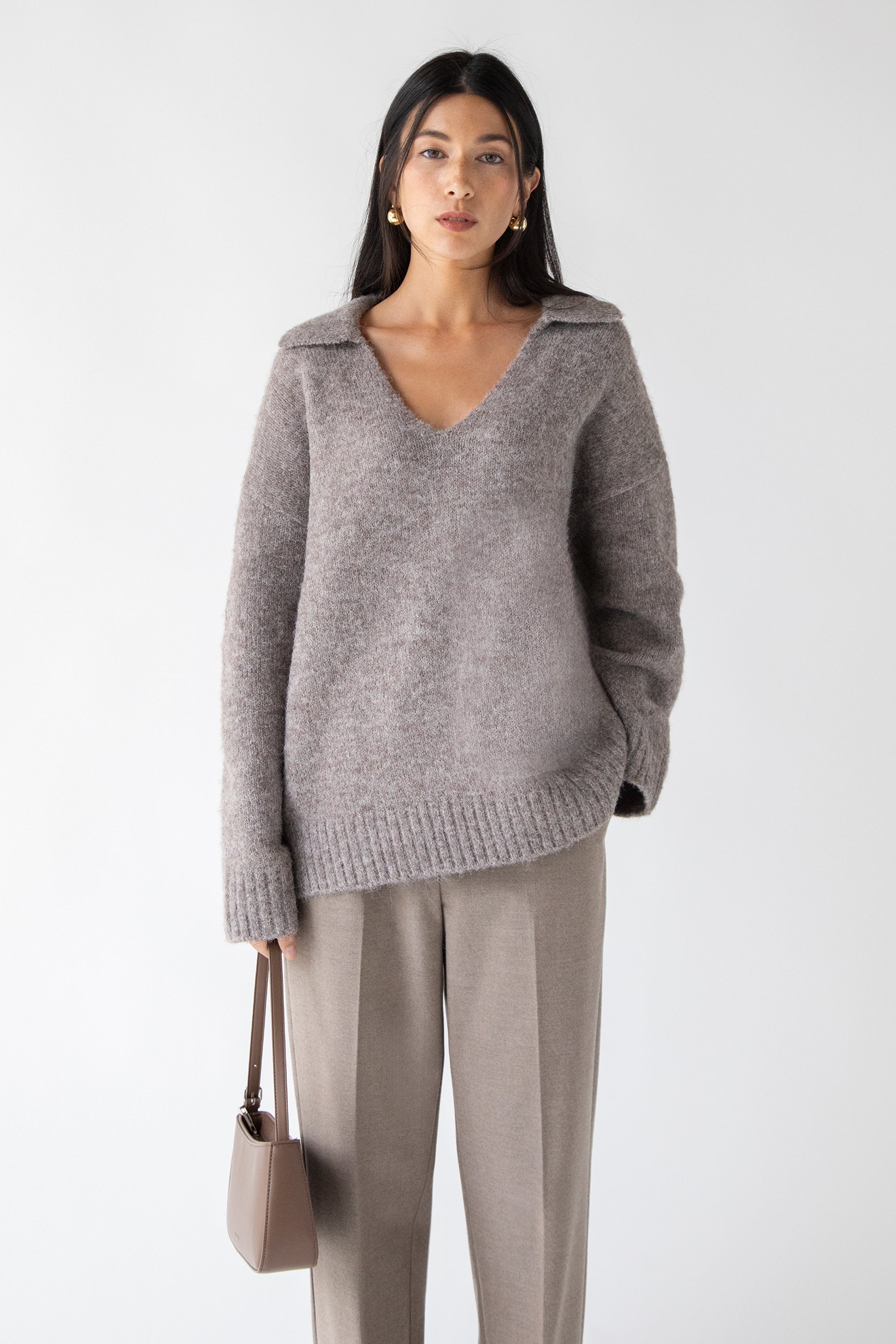 This oversized V-neck sweater is detailed with a collared neckline, dropped shoulders and ribbed trims. Start off the new season with a cozy knitwear choice that is versatile enough for any outfit. Style yours with a mini pleated suiting skirt or high-rise trousers.