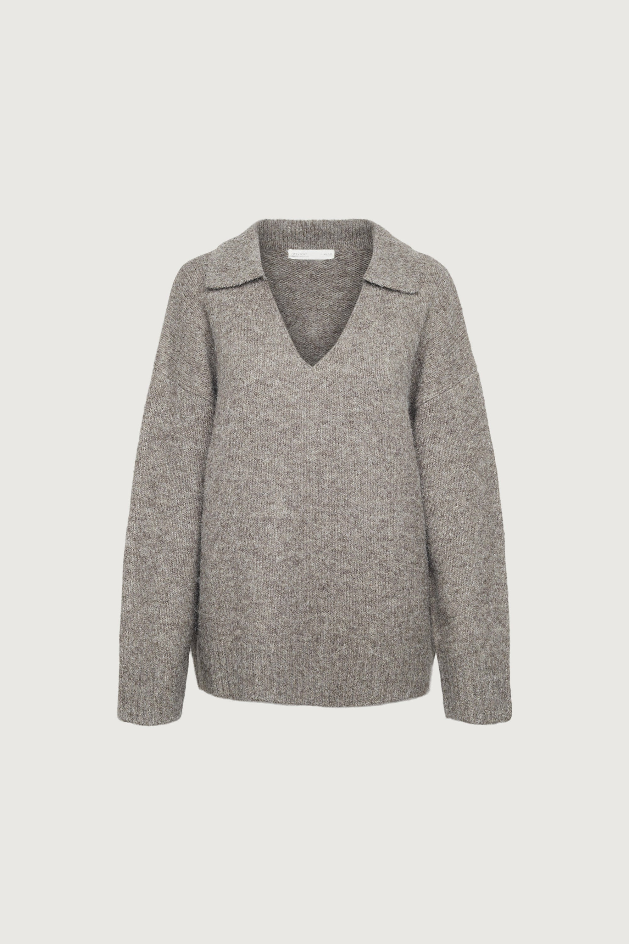 Collared V-neckline. Dropped shoulders. Ribbed trims.