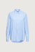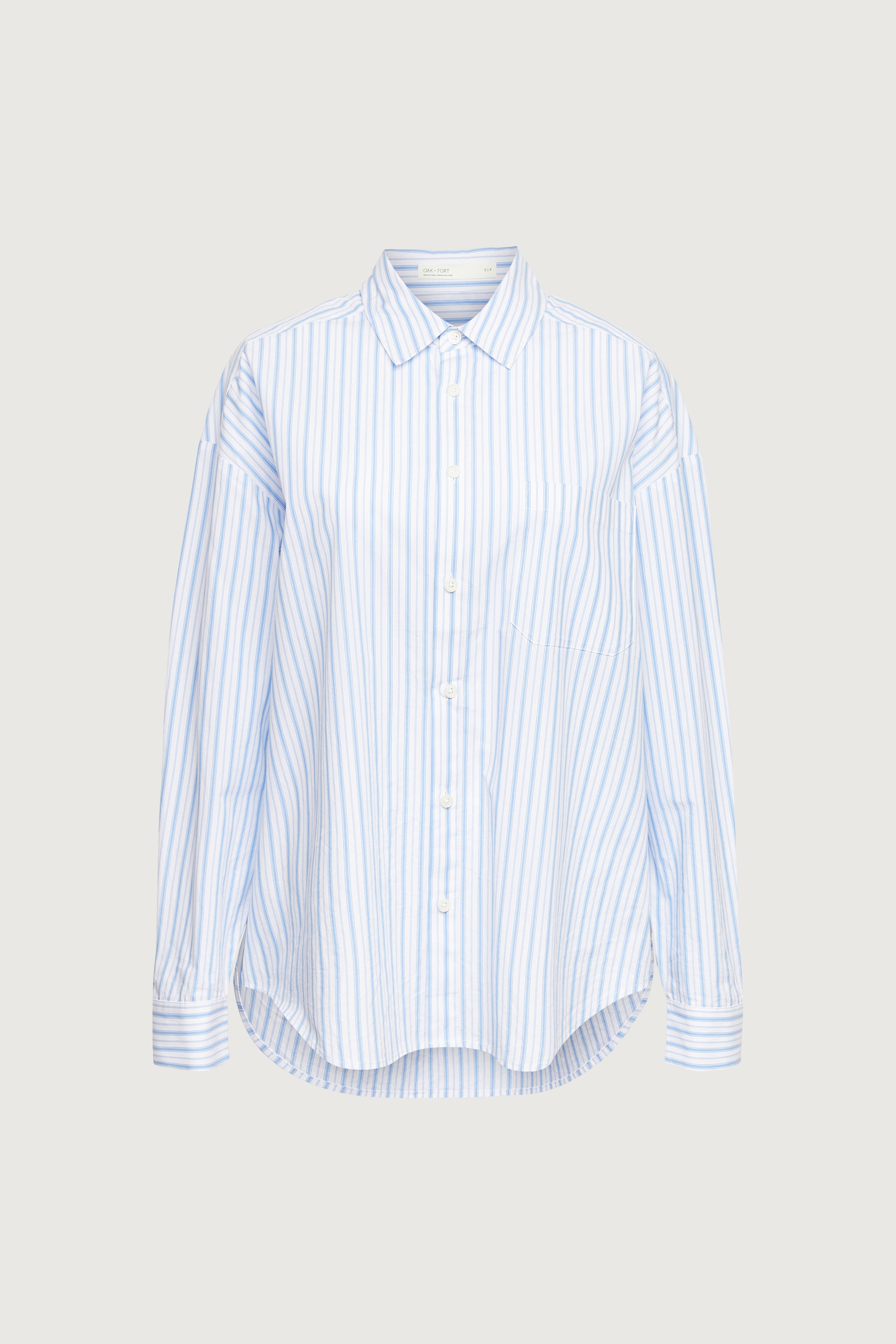Lightweight striped cotton poplin. Collared neckline. Button front. Dropped shoulders. Front patch pocket. Curved hem.