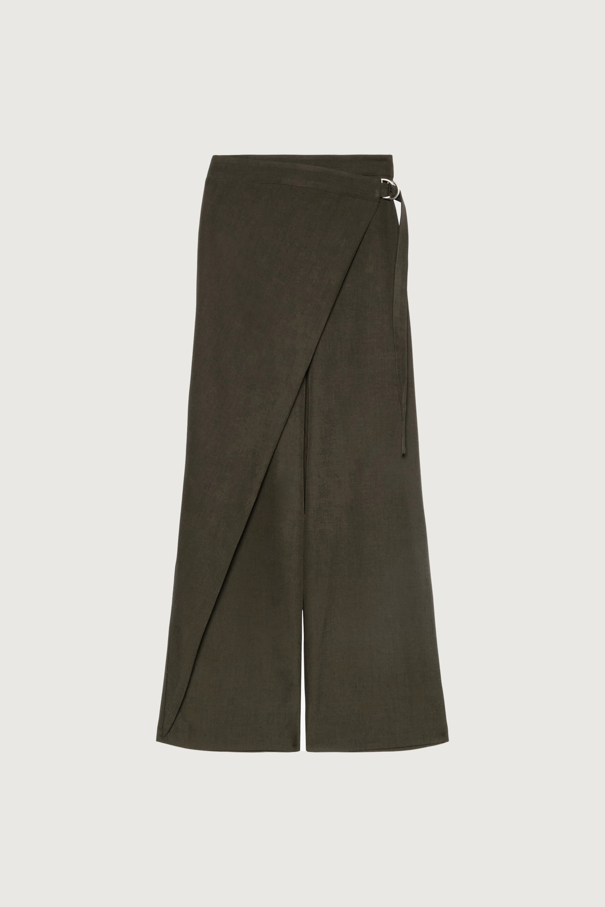 Side wrap. Adjustable D-ring. Side zipper. Back welt pockets. Elastic waistband at the back.