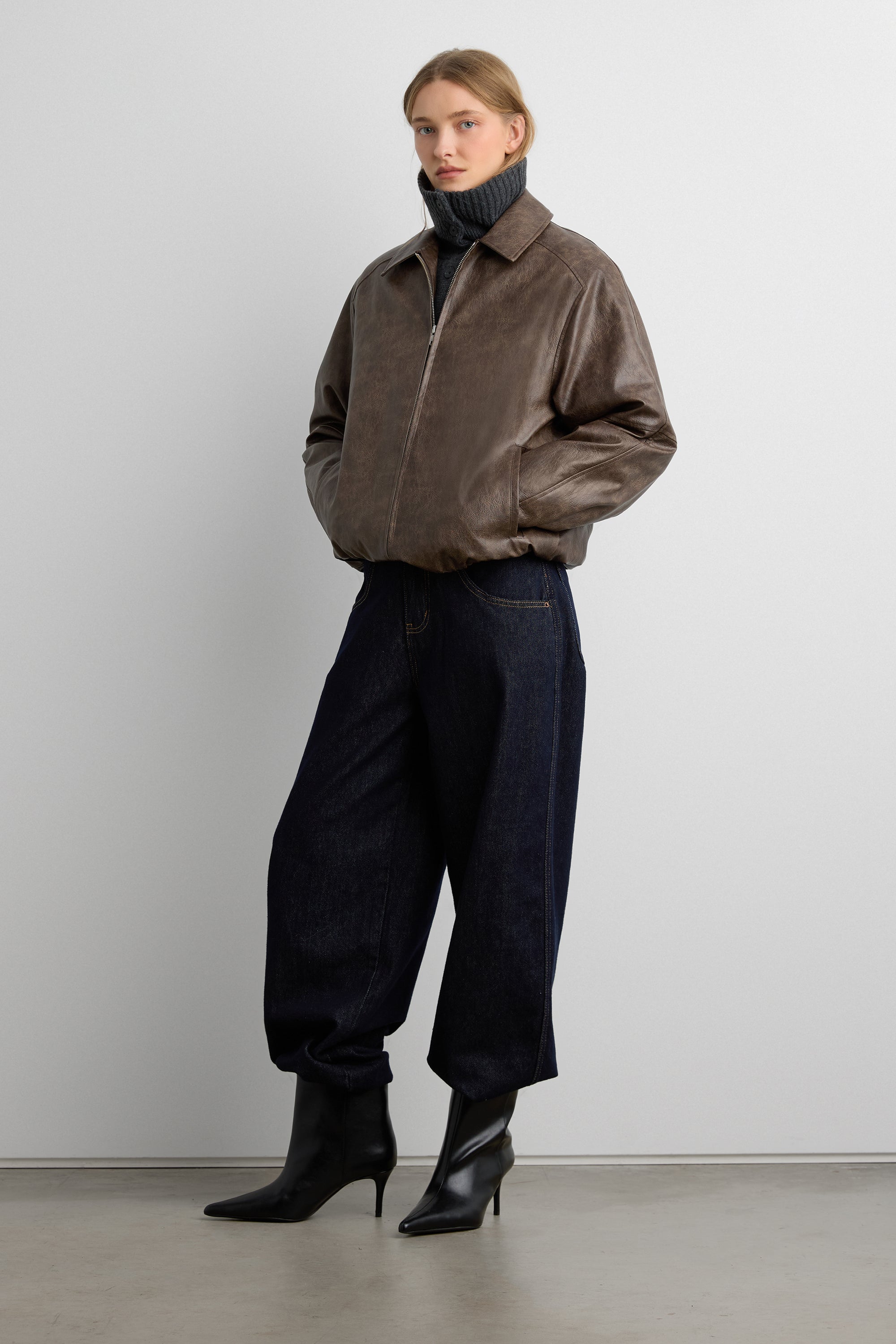 Our best-selling vegan leather bomber jacket is back. A wardrobe must-have made in an oversized fit and is detailed with a collared neckline, elasticated trims, a quilted interior and side pockets. A wardrobe staple to wear year after year.