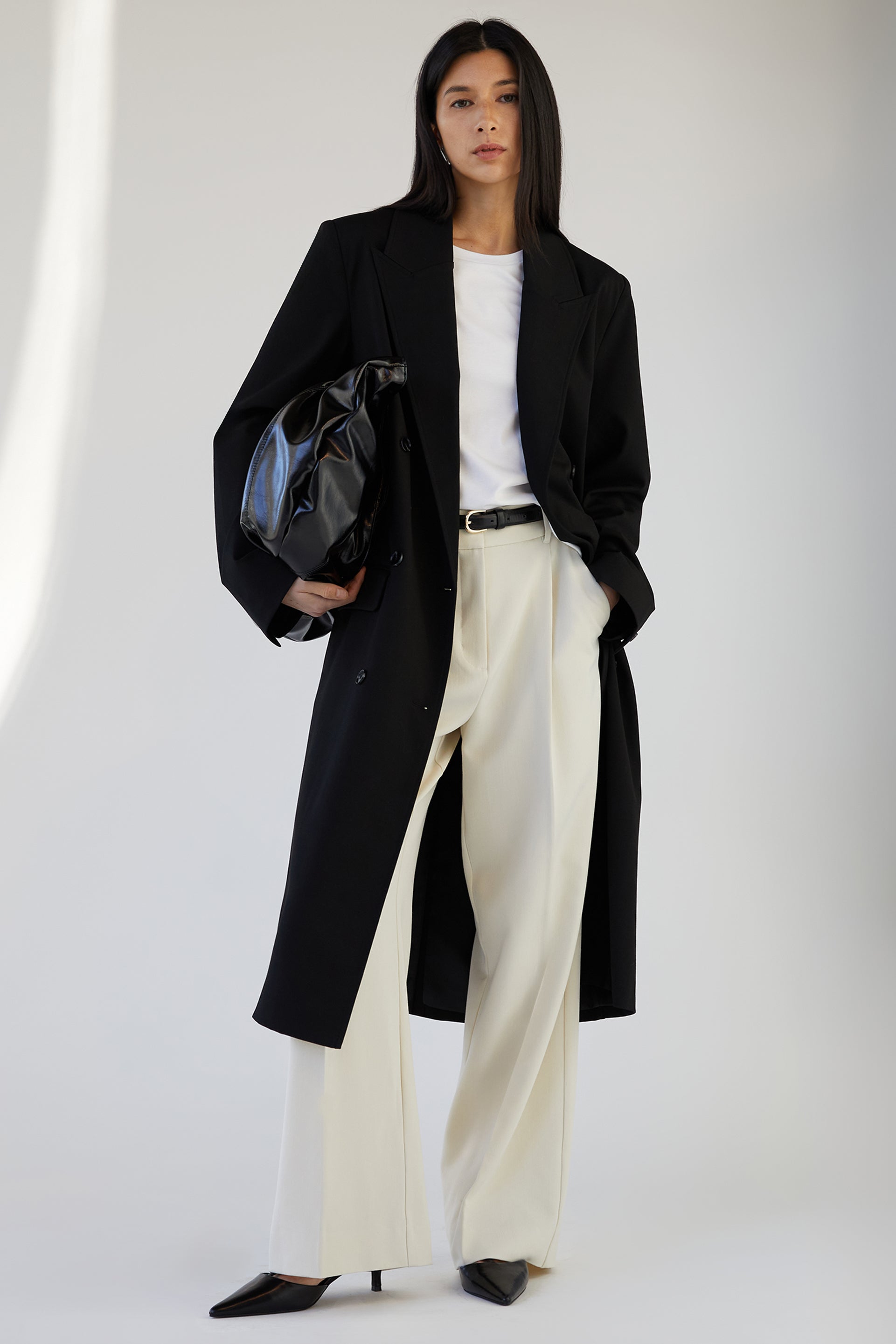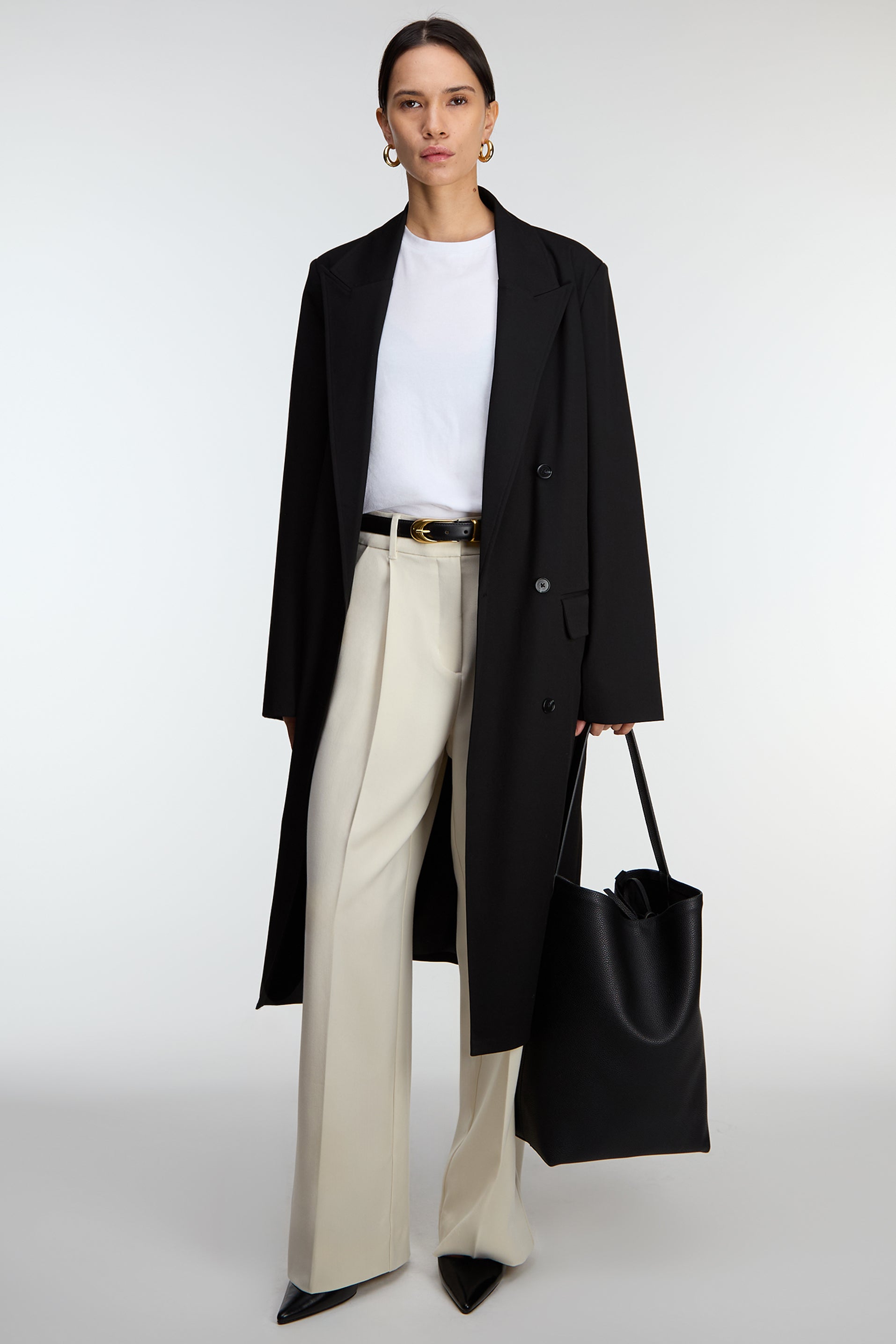 Inspired by classic suiting styles, this double-breasted coat is tailored in a relaxed fit. It's designed with peak lapels and front flap pockets. This coat is versatile enough to be worn from day to night, style it with a plain tee and jeans or for a more elevated look style it over a satin slip dress and heels.