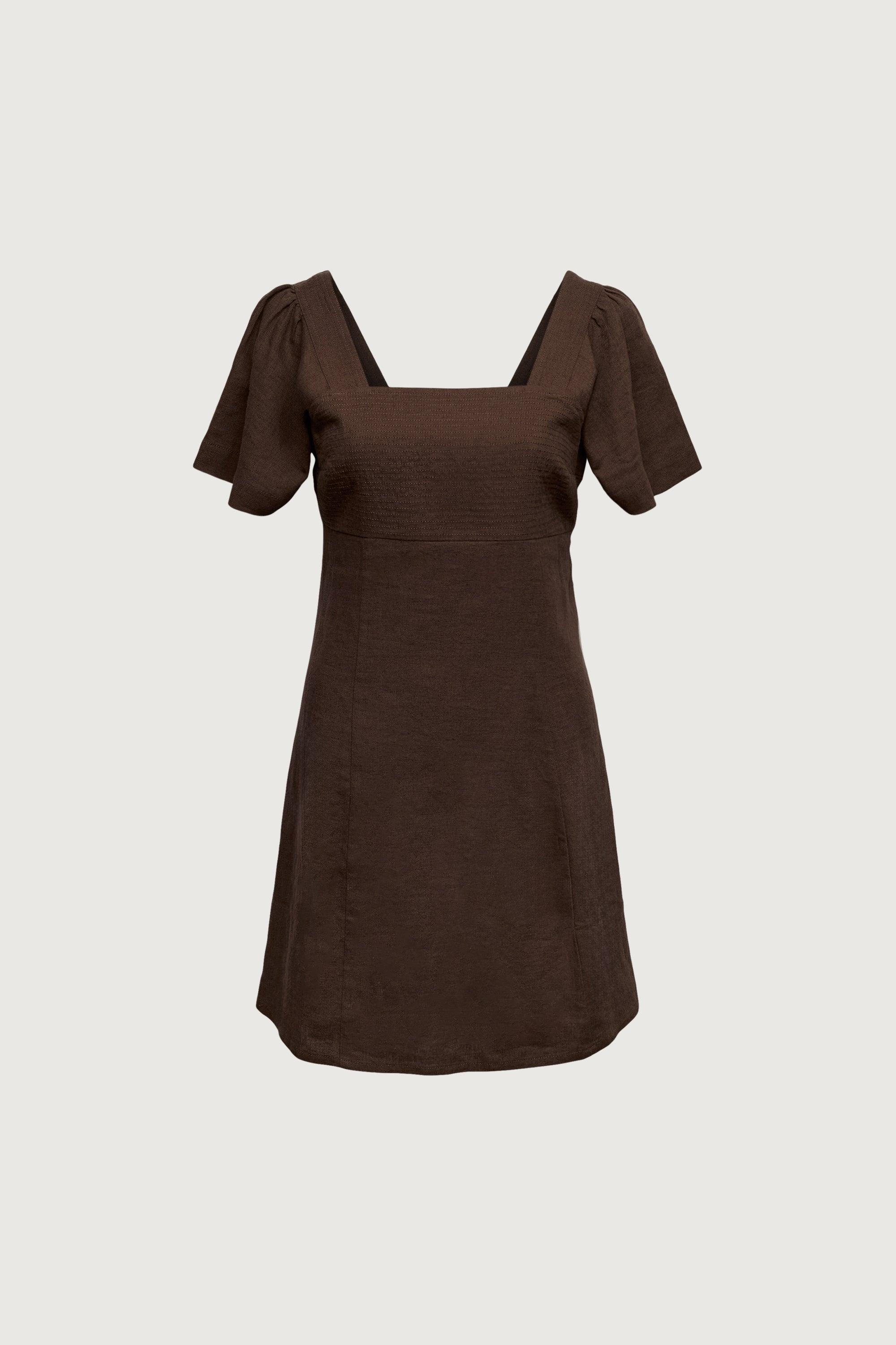 This short sleeve mini dress is cut from a linen rayon blend in a classic fit. It has a square neckline, a bust panel detailed with decorative top stitching and a smocked back for a comfortable fit. Pair yours with a mini bag and sandals.