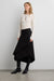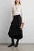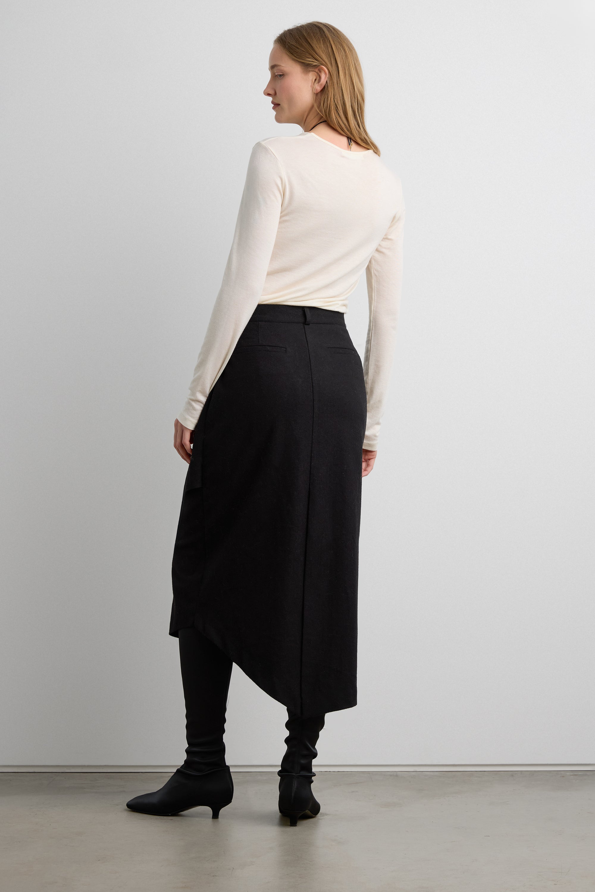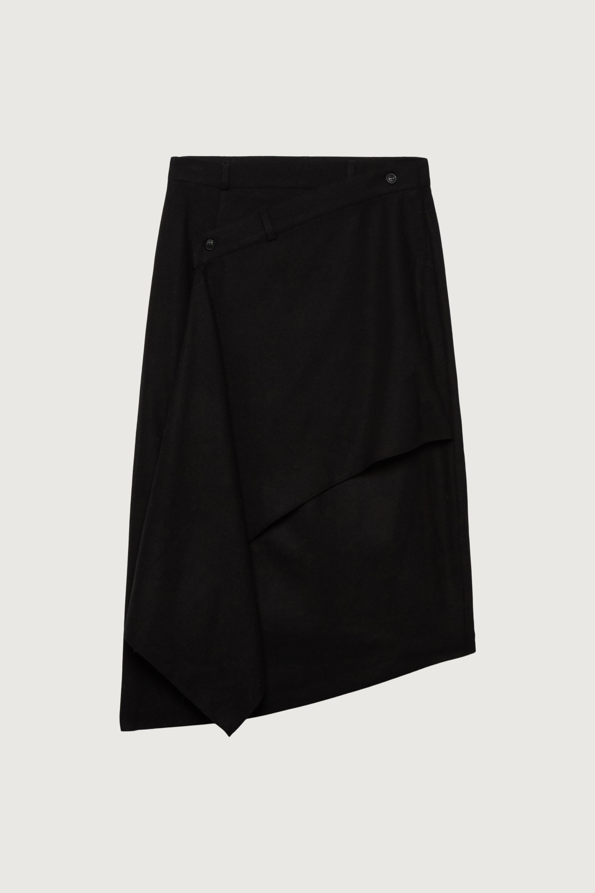 This midi skirt features an asymmetrical wrap construction that creates a layered, sculptural silhouette. Crafted from a smooth woven fabric with subtle structure, it drapes fluidly while maintaining its shape.