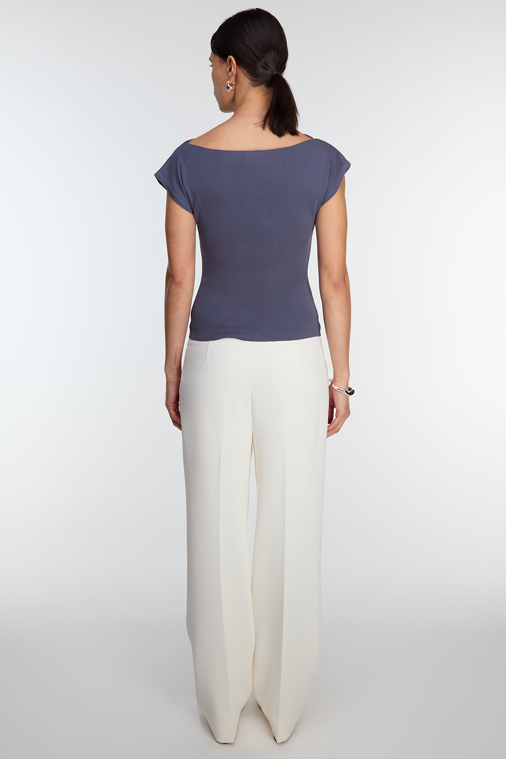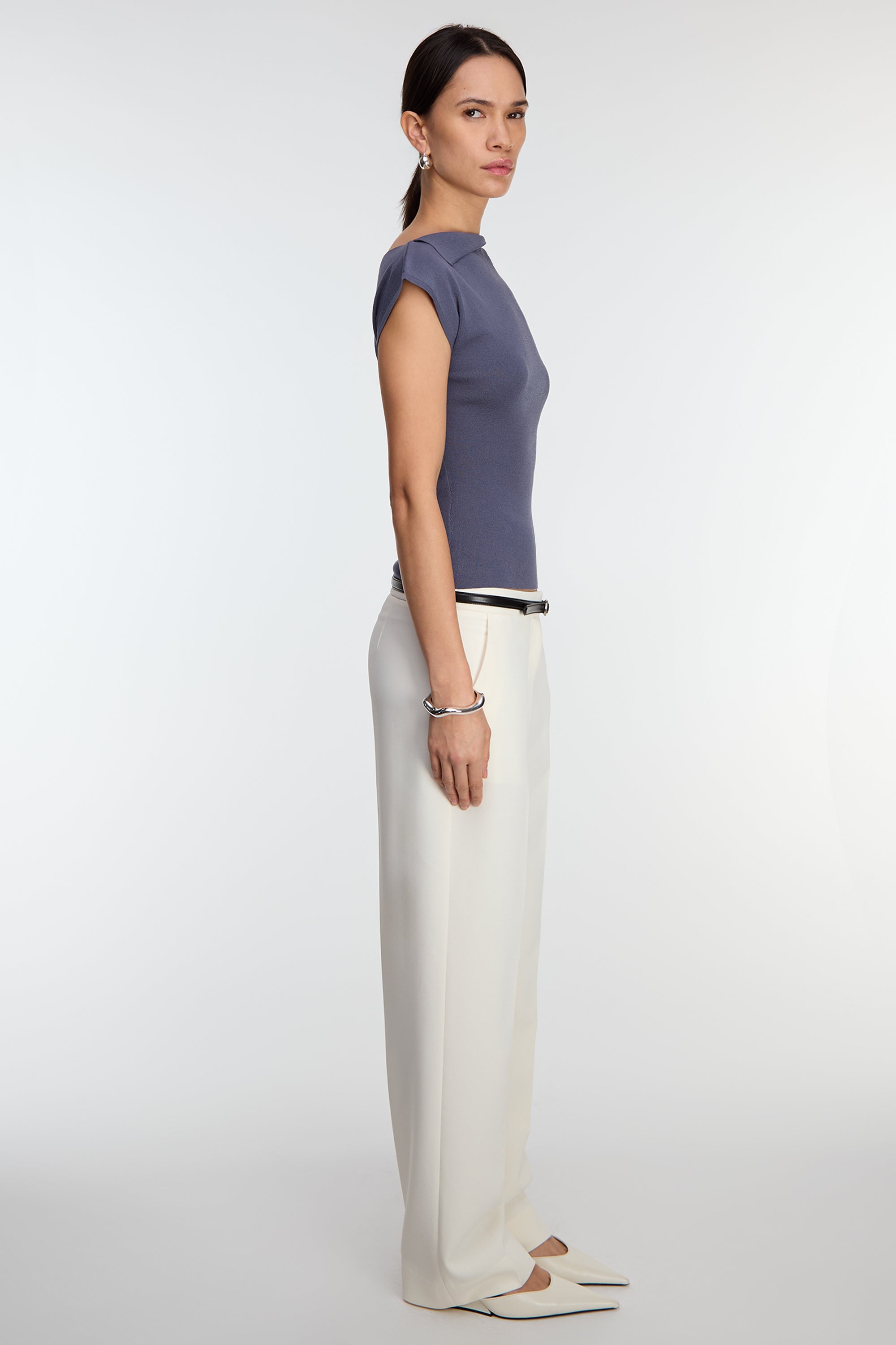 This cap sleeve sweater is made in a slim fit and is detailed with an asymmetrical neckline. An elegant and effortless top you can style with any bottoms from trousers to wide leg jeans.