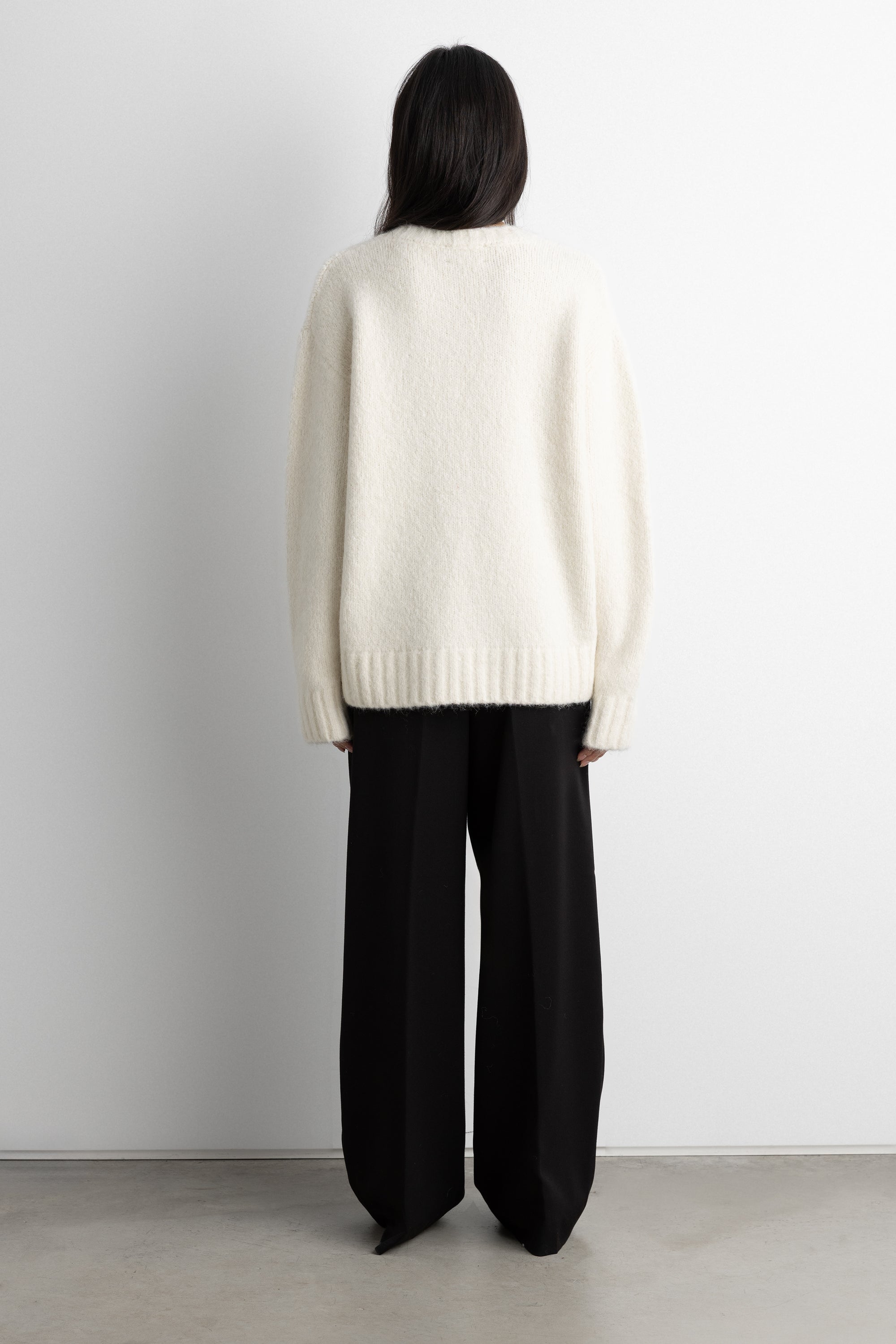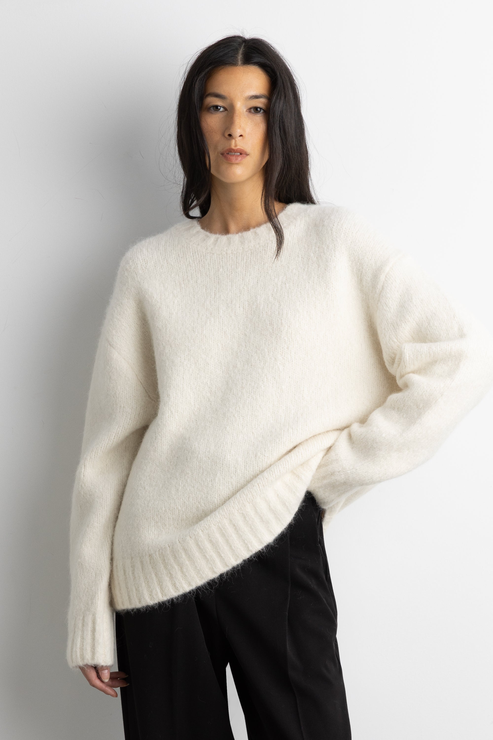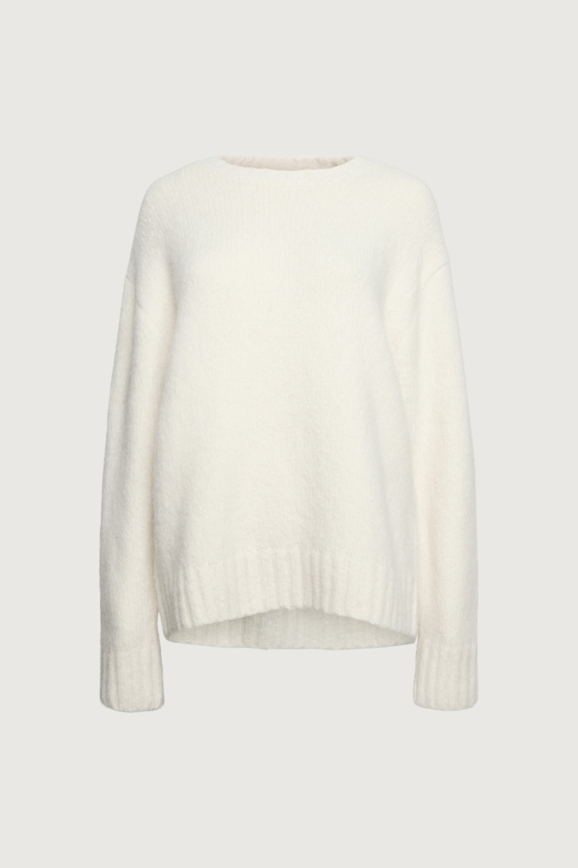 Brushed alpaca. Crew neckline. Ribbed trims. Dropped shoulders.