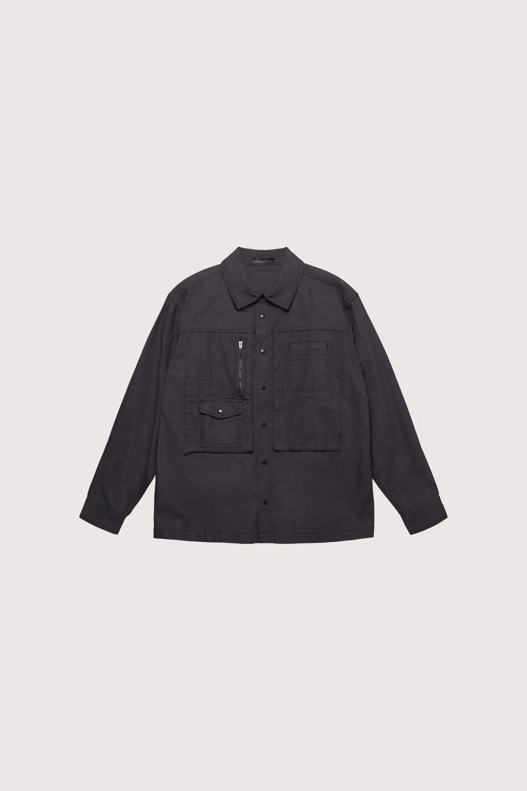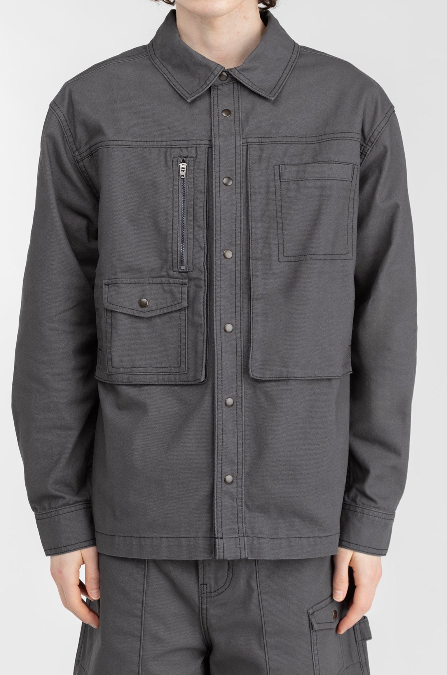Relaxed fit. Cotton twill fabric. Cargo pockets. Zipper details. Collared neckline. Snap button closure. 29" length based on size M.