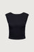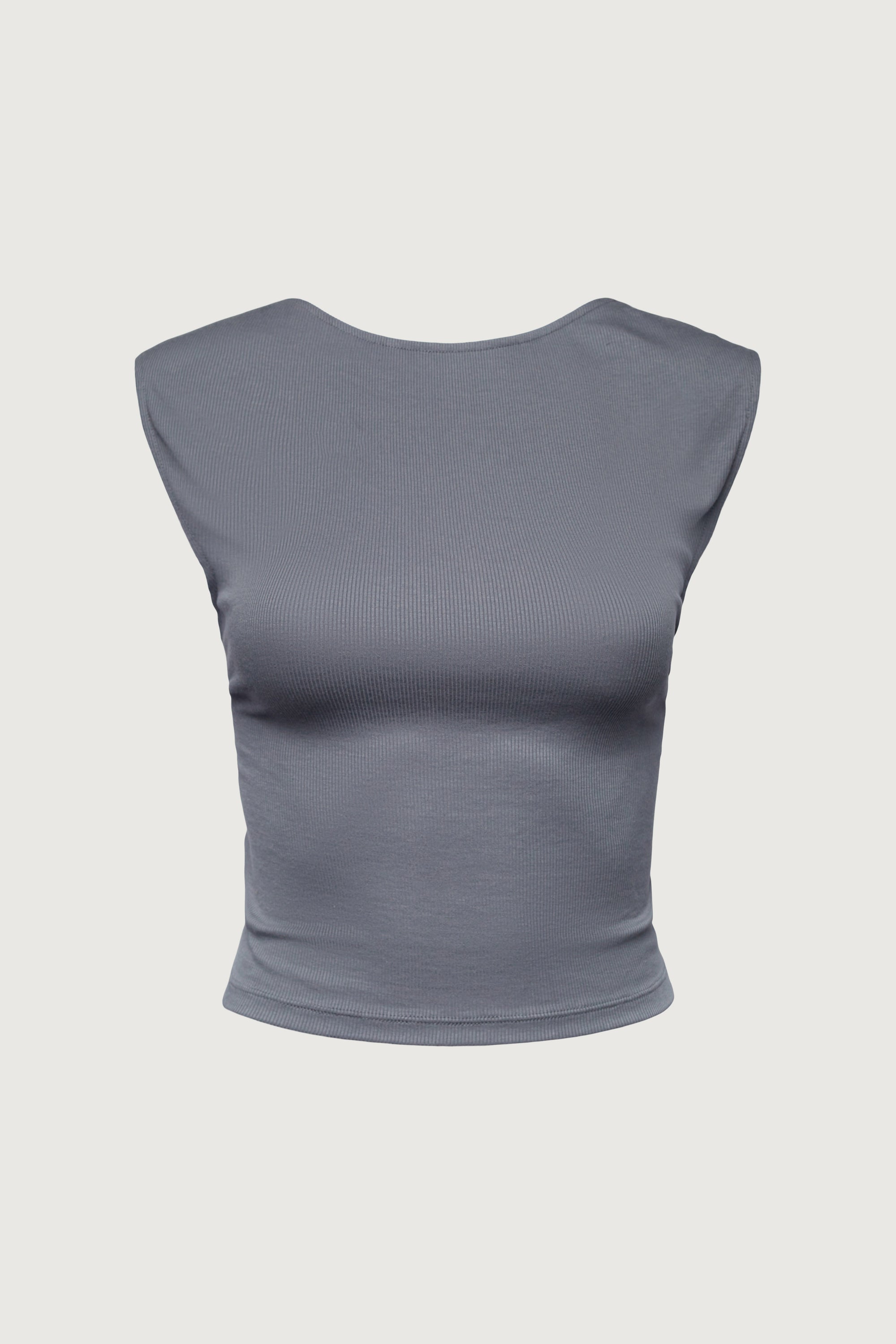 Modal rib-knit fabric. High-neckline. Cap sleeves. Open back with ties.
