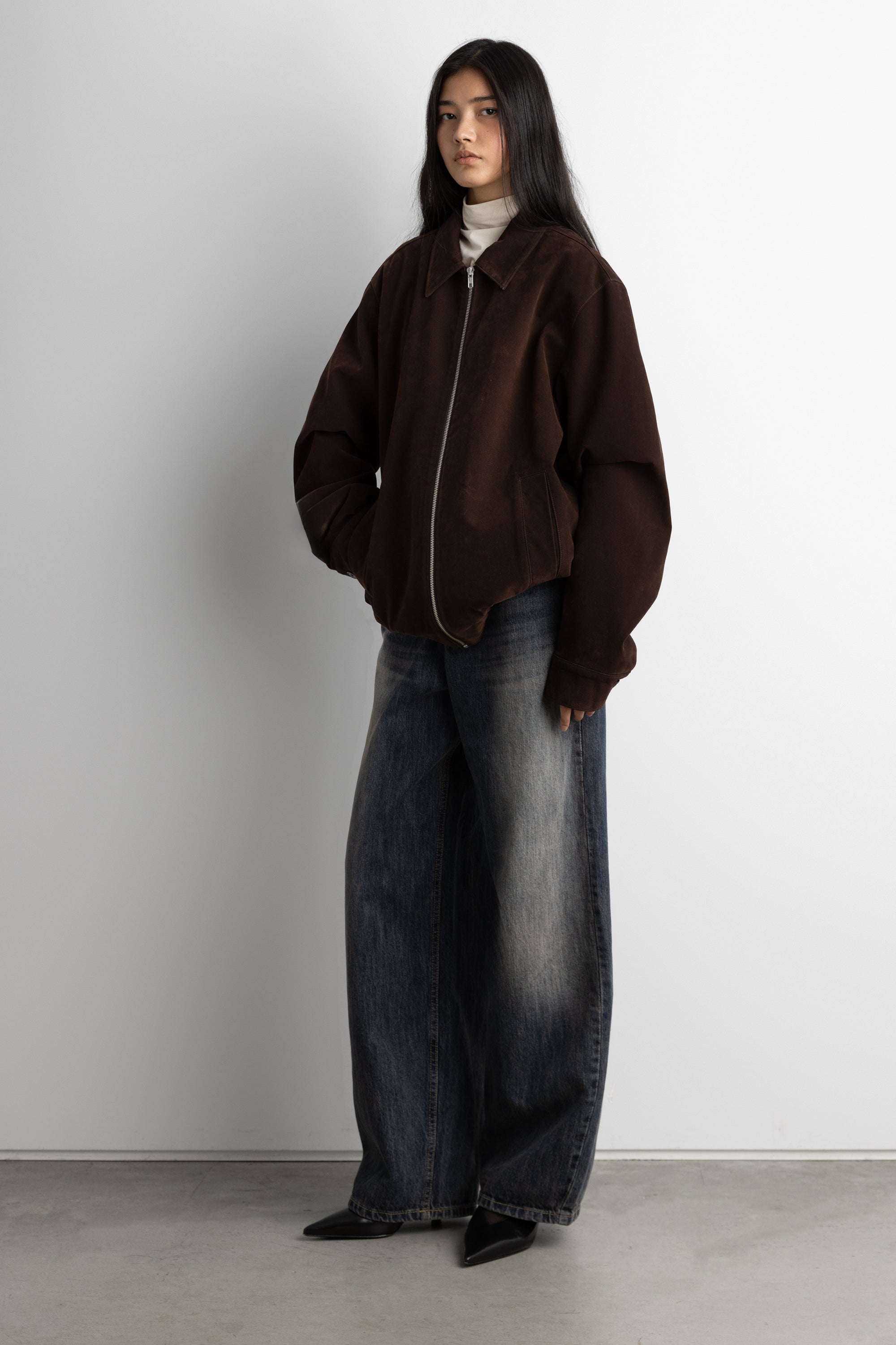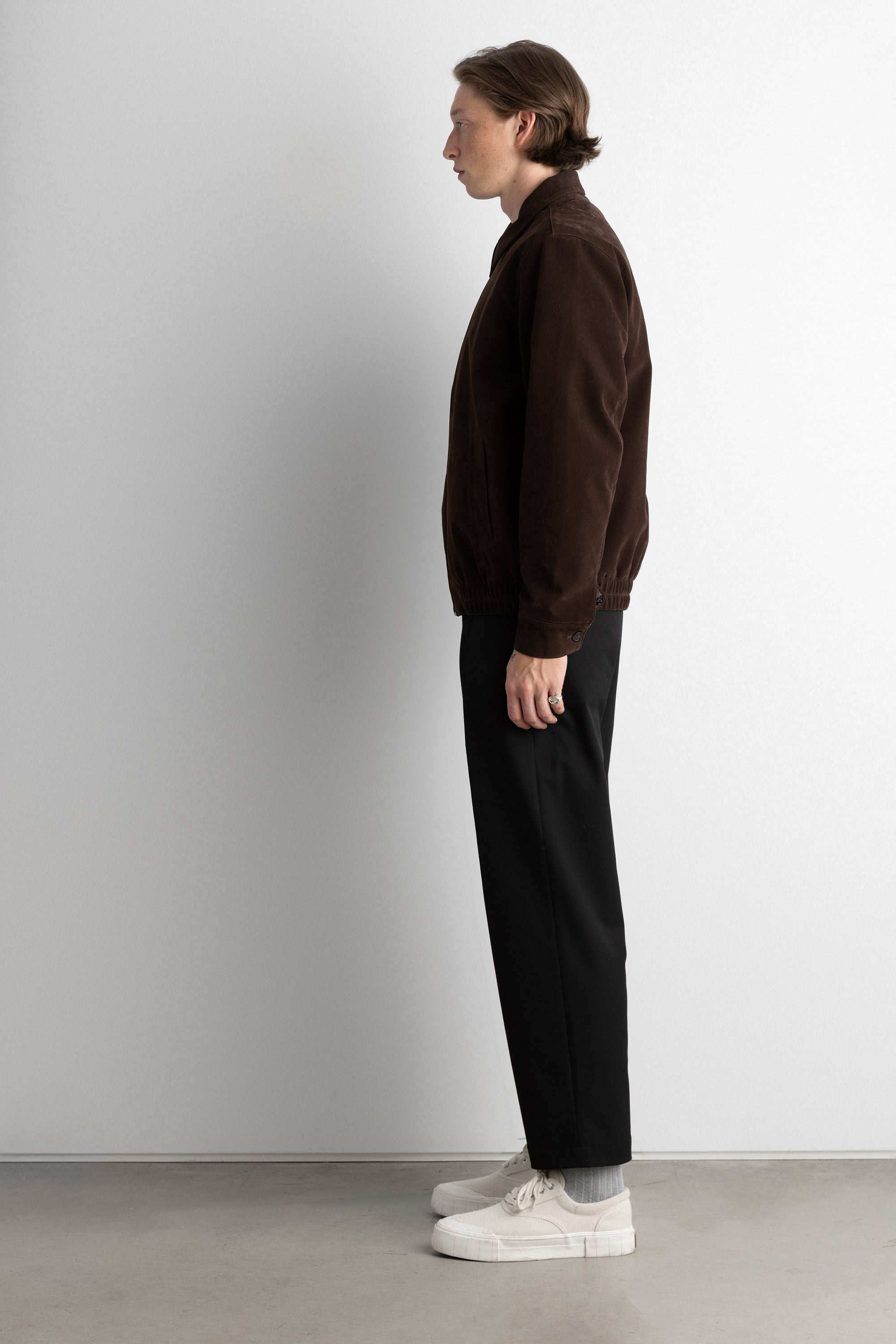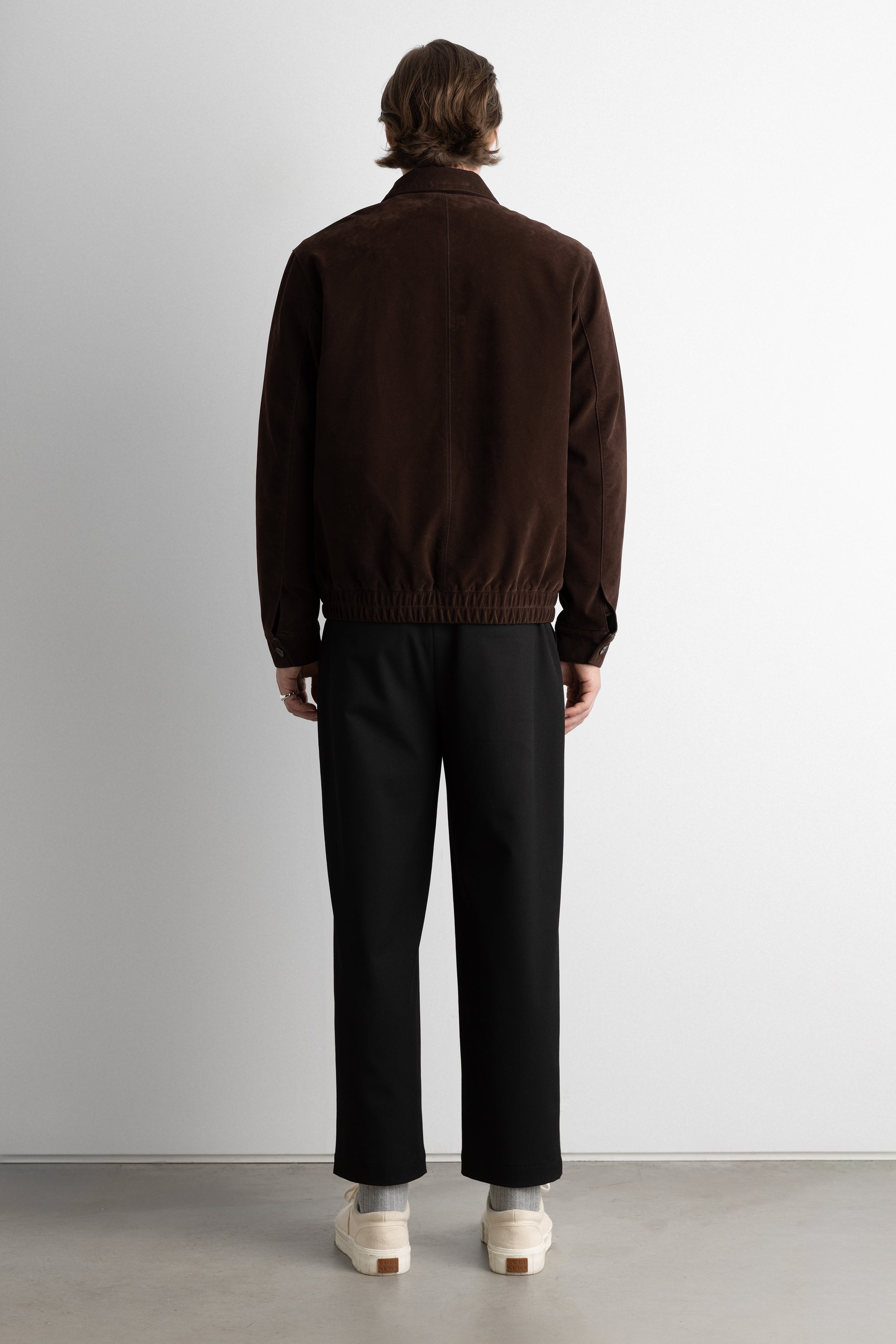 Classic fit. Soft vegan suede fabric. Front welt pockets. Zip front. Button cuffs. Elasticated waist. Collar. Satin quilted interior. 28” based on size M.