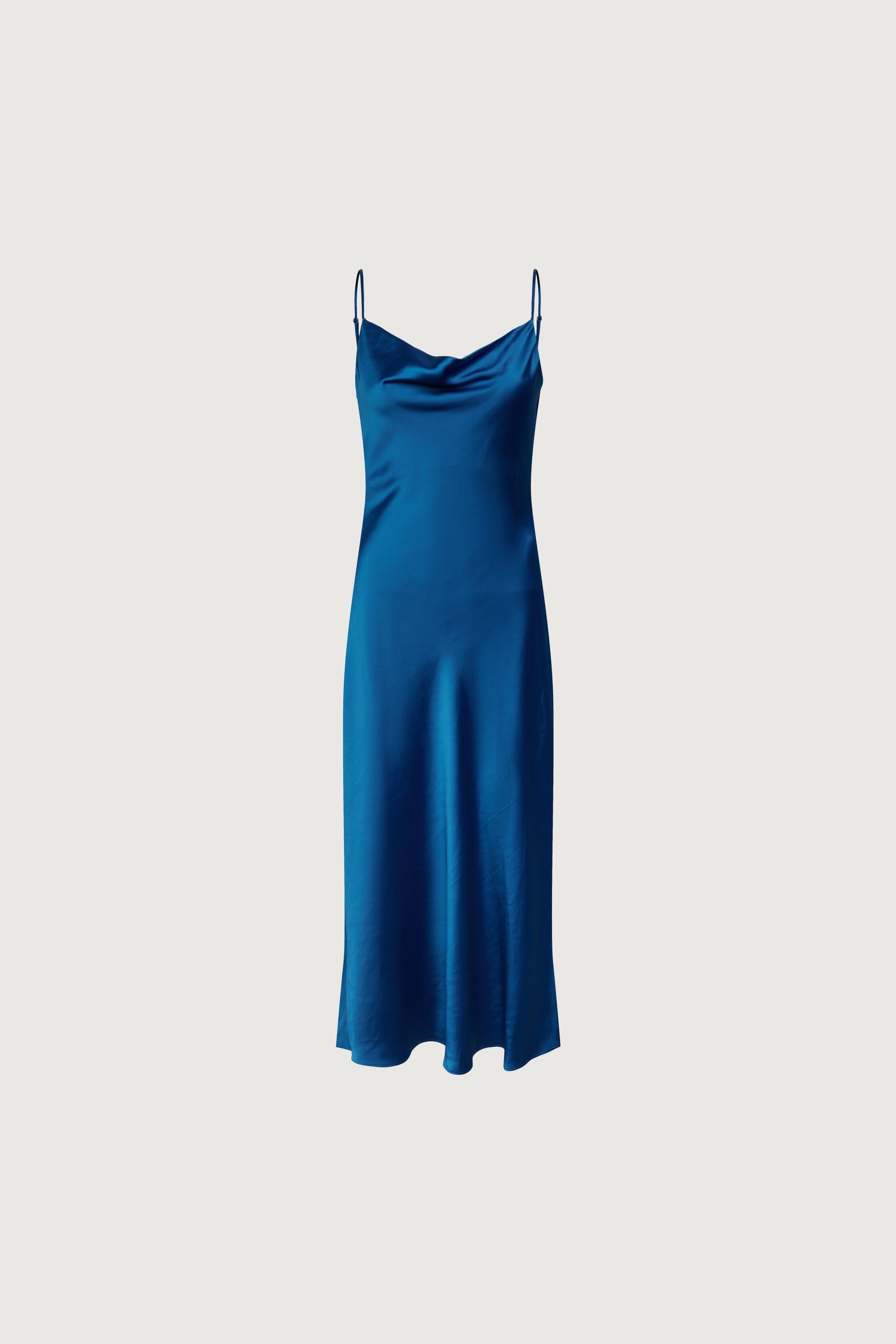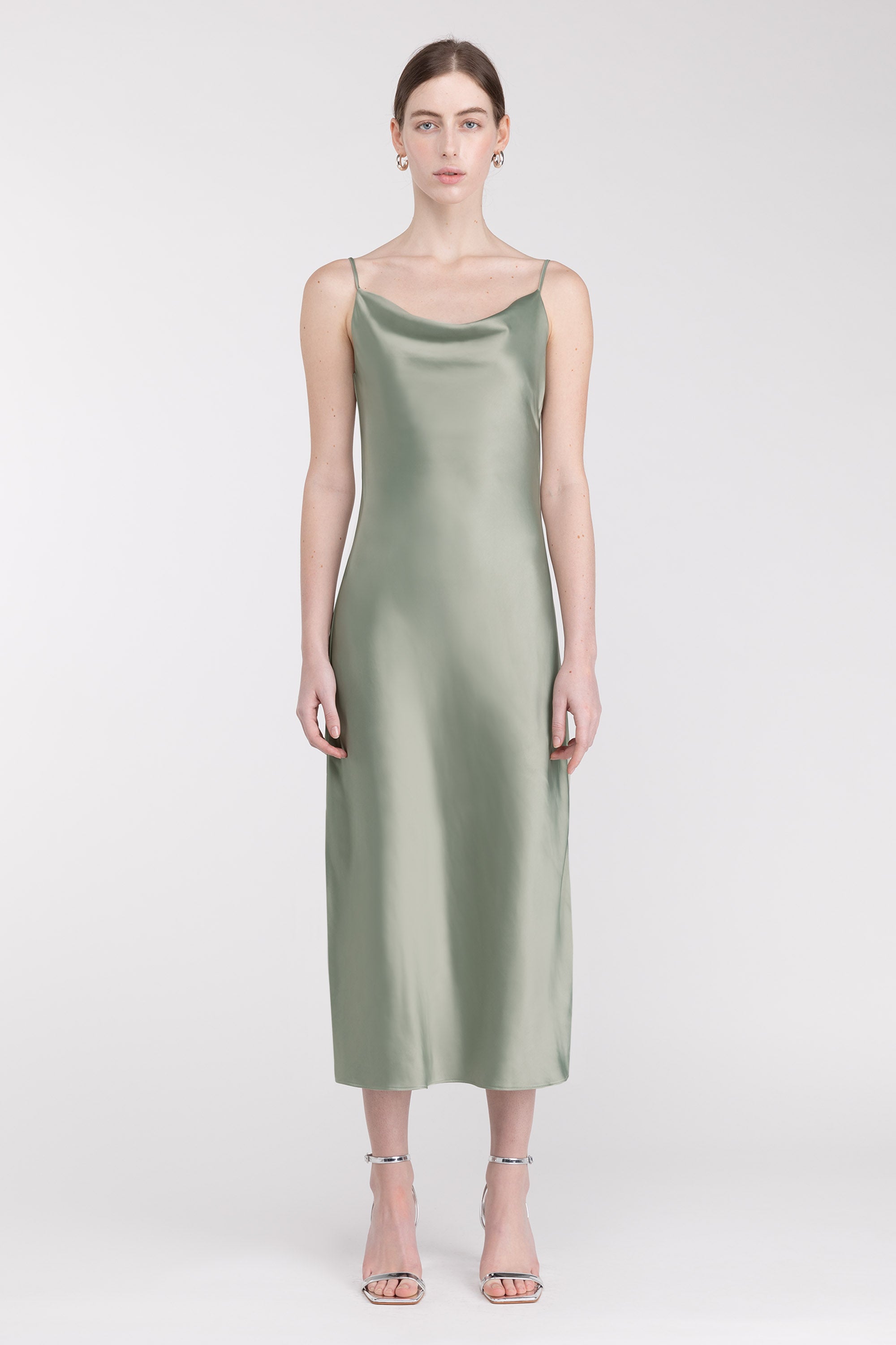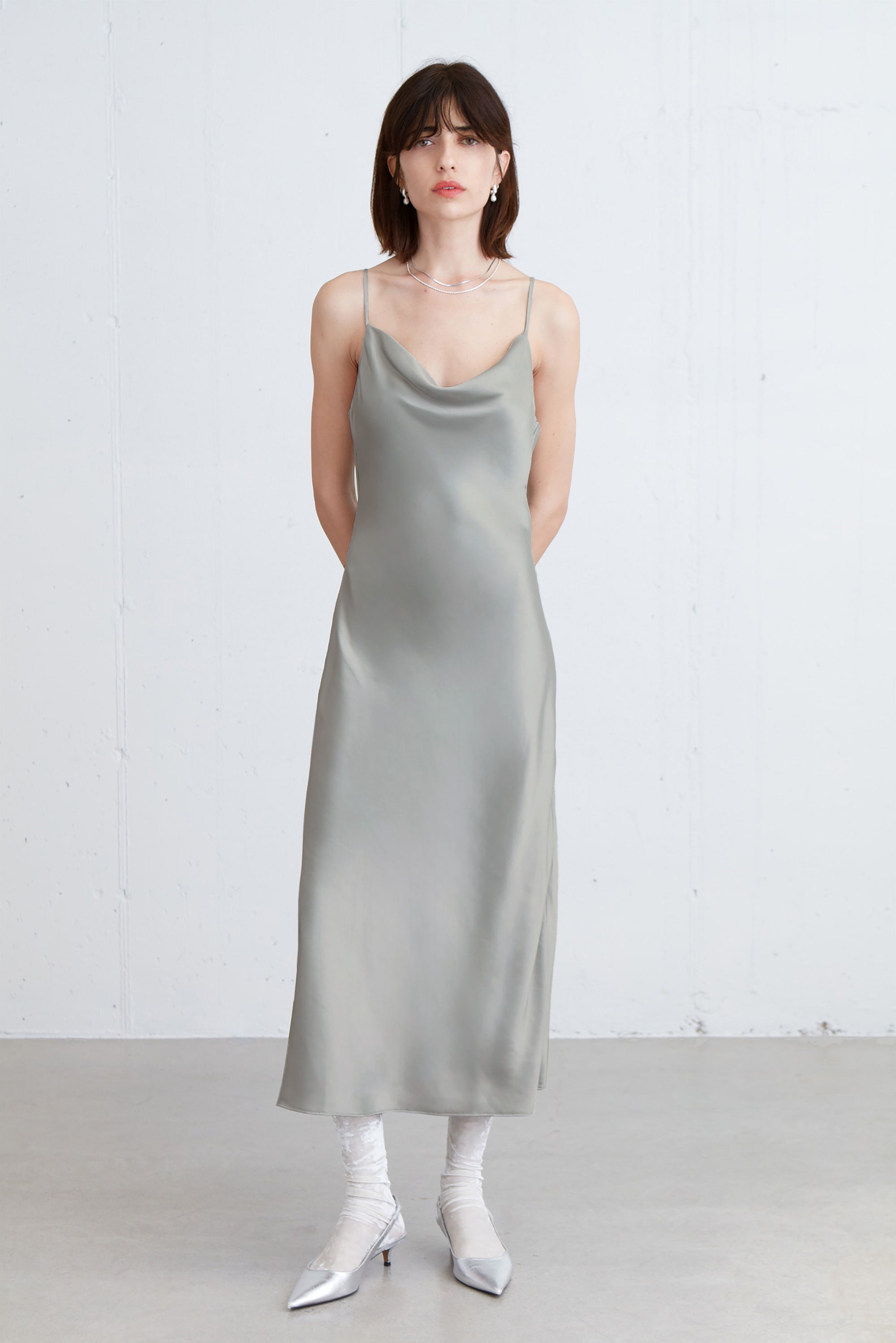 This satin midi dress is made in a slim fit, bias cut that drapes perfectly and is designed with a simple cowl neckline. The perfect dress for any season, style it for the holidays with a faux fur jacket or with strappy heels in the summer time.