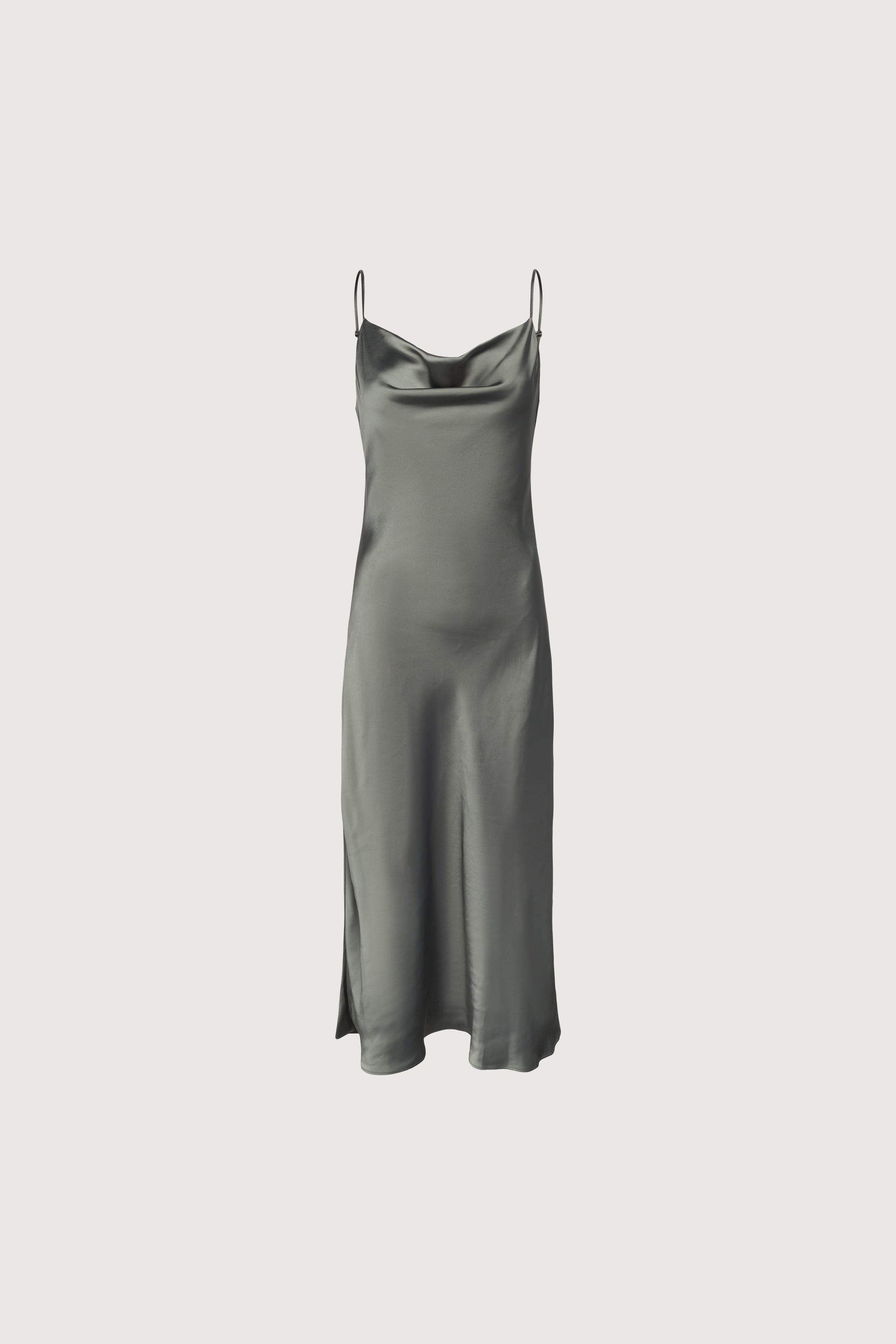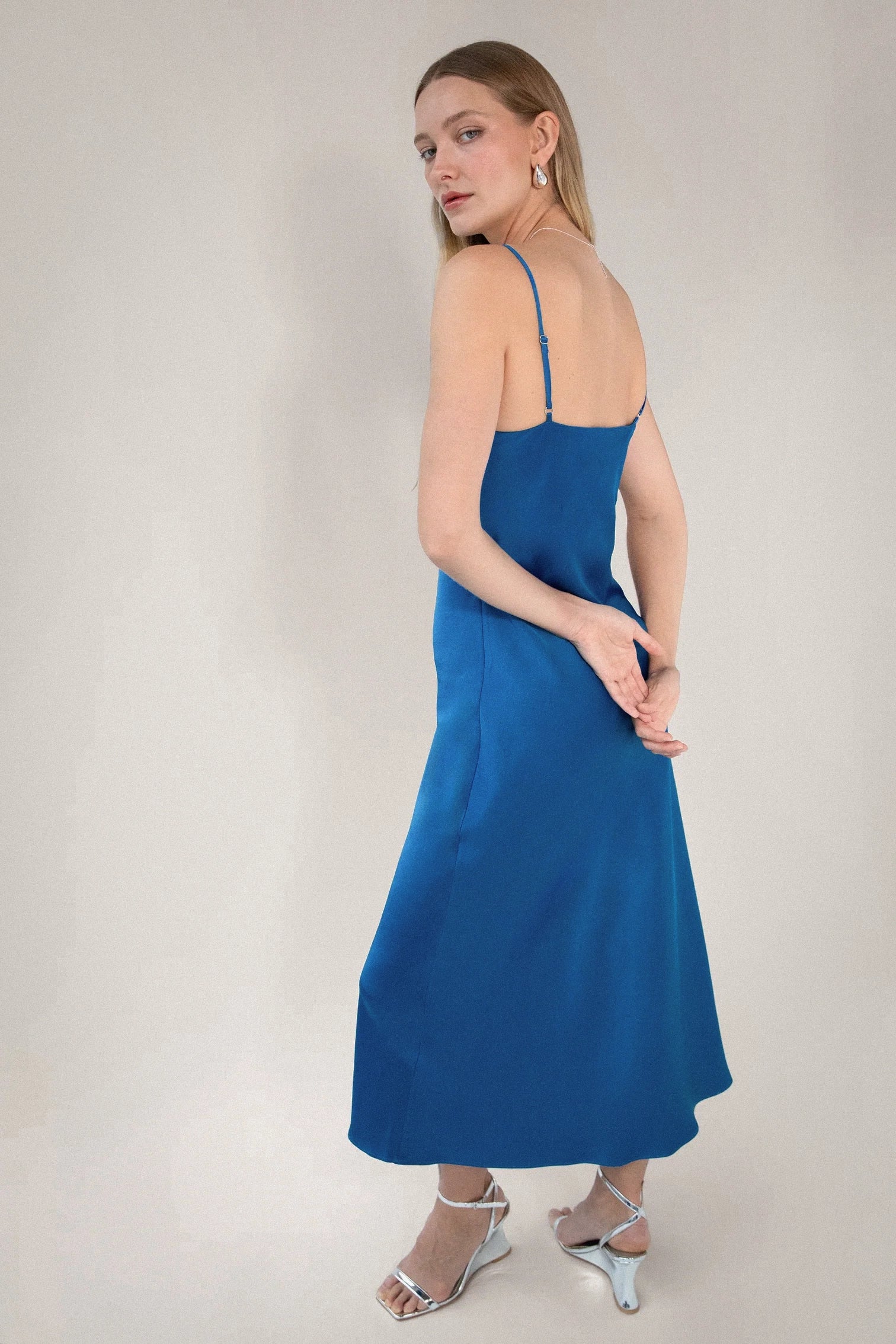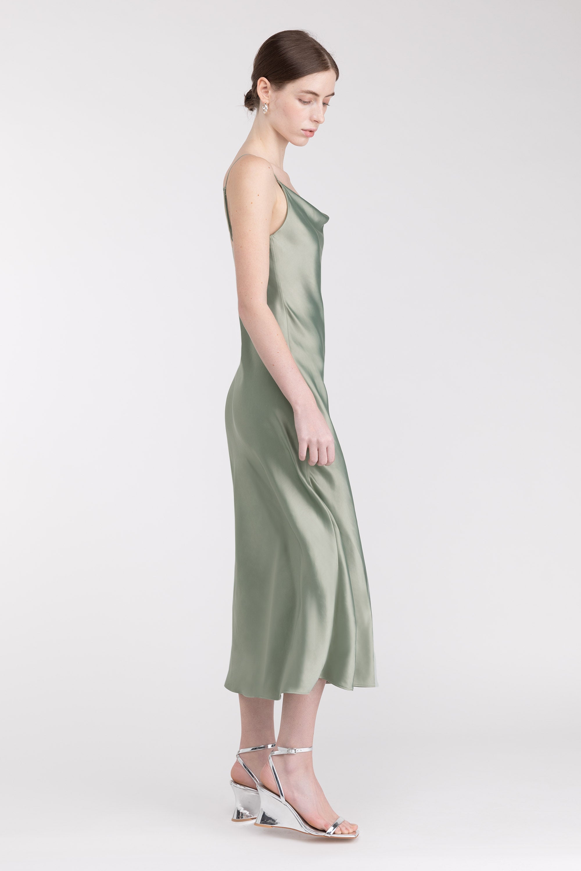 This satin midi dress is made in a slim fit, bias cut that drapes perfectly and is designed with a simple cowl neckline. The perfect dress for any season, style it for the holidays with a faux fur jacket or with strappy heels in the summer time.