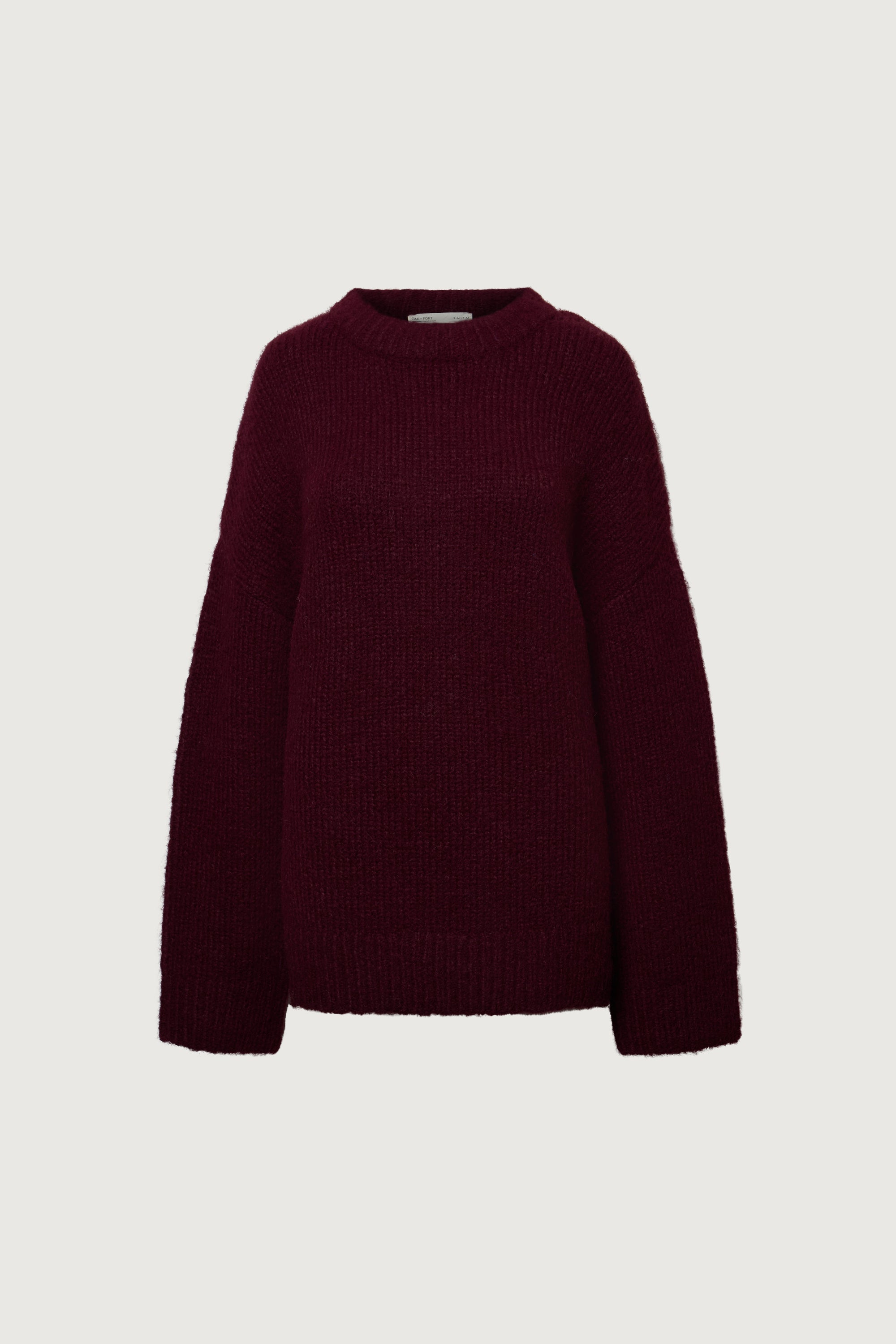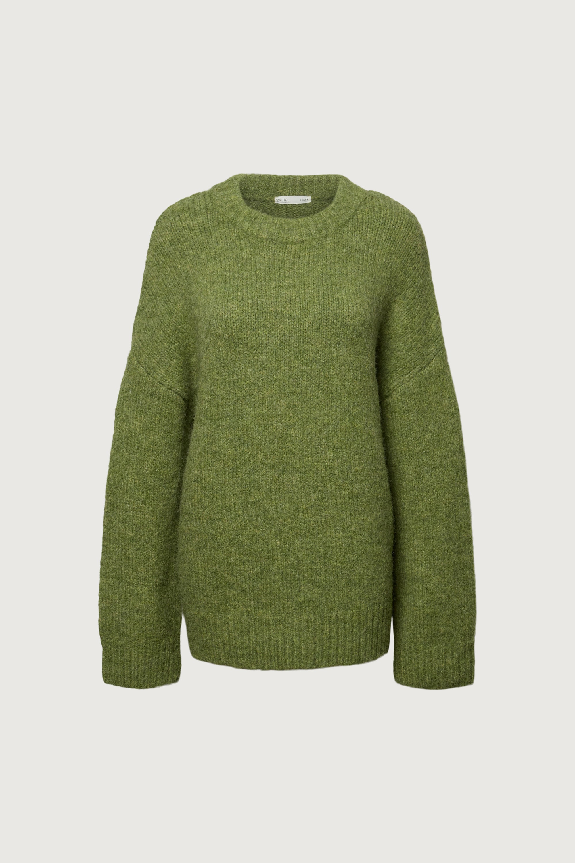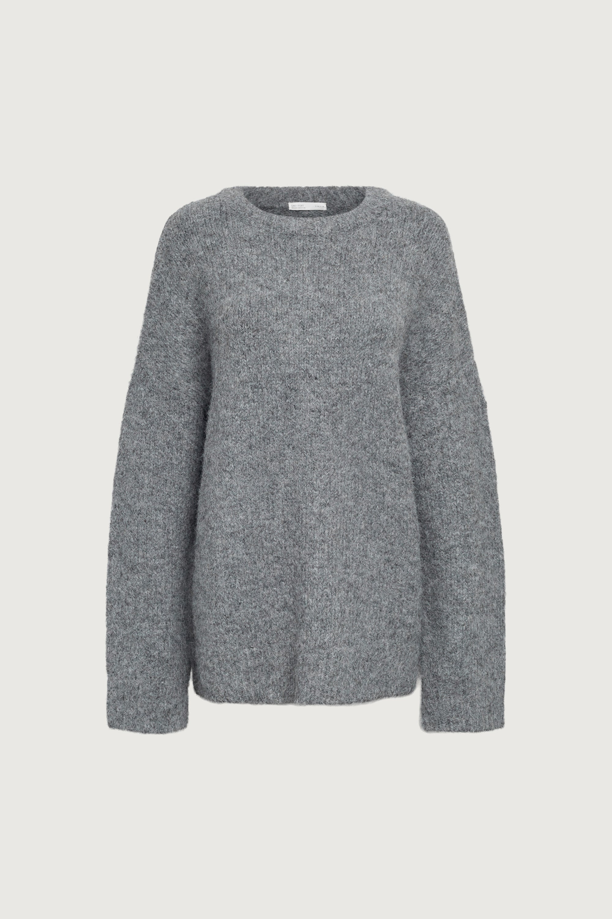 Mohair-like fuzzy knit. Crew neckline. Ribbed trims. Dropped shoulders.