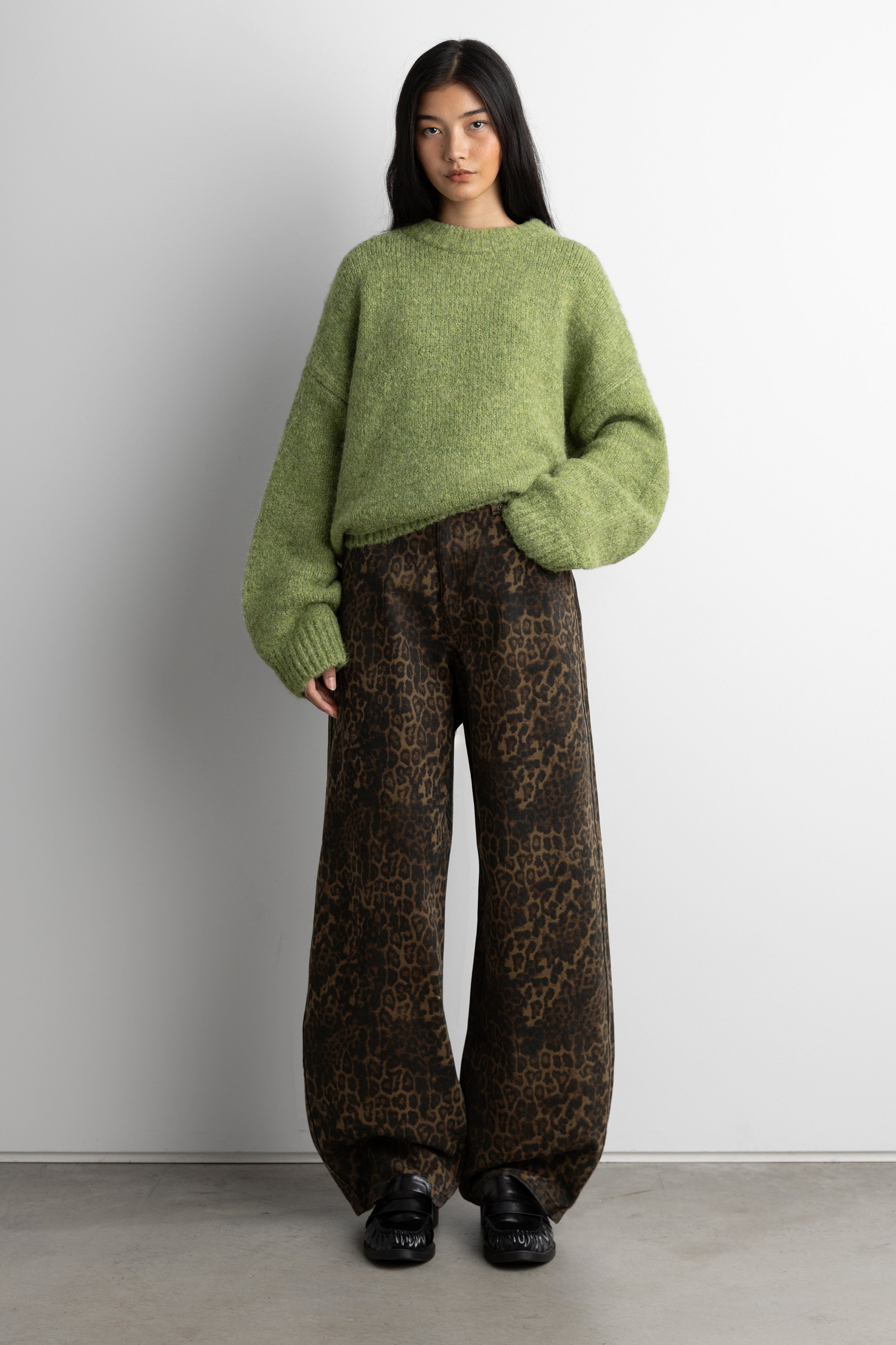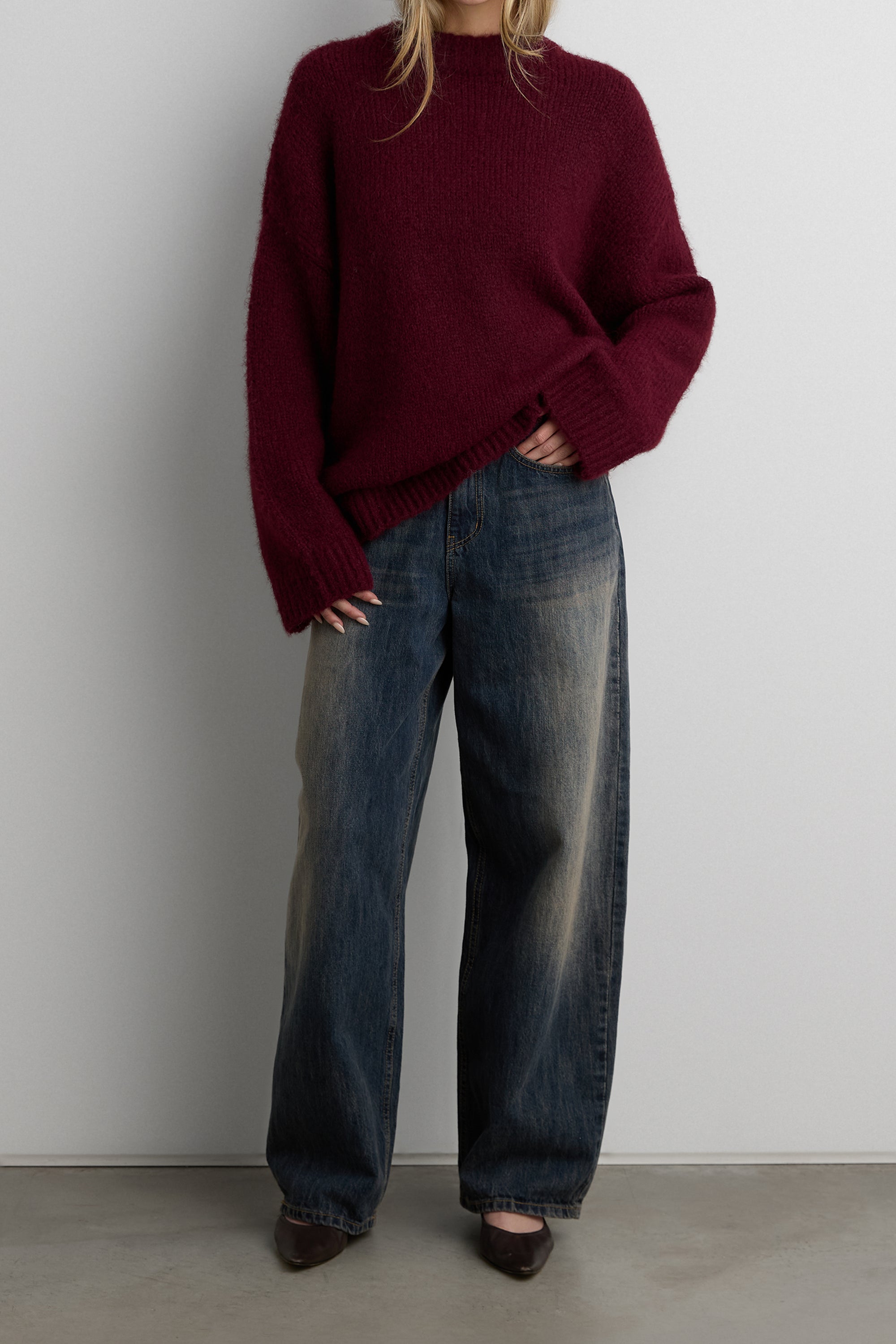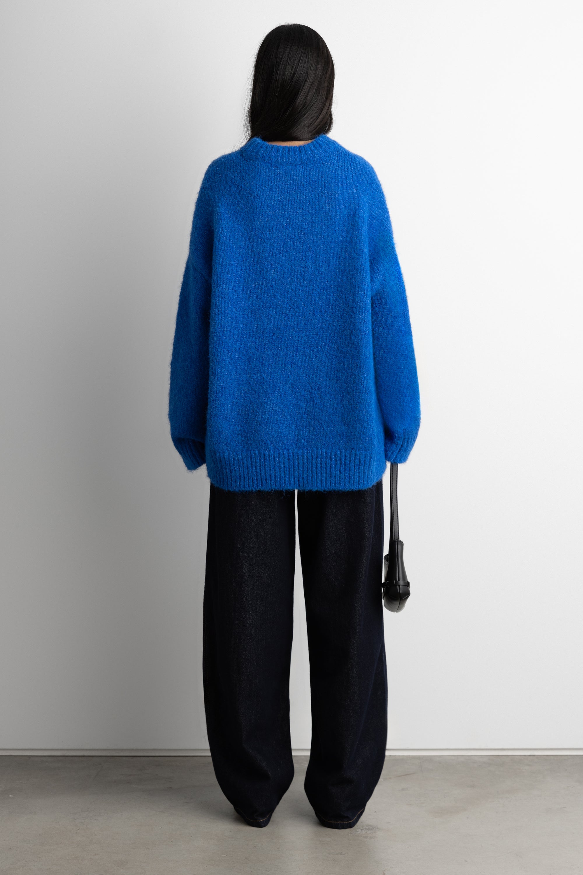 Mohair-like fuzzy knit. Crew neckline. Ribbed trims. Dropped shoulders.