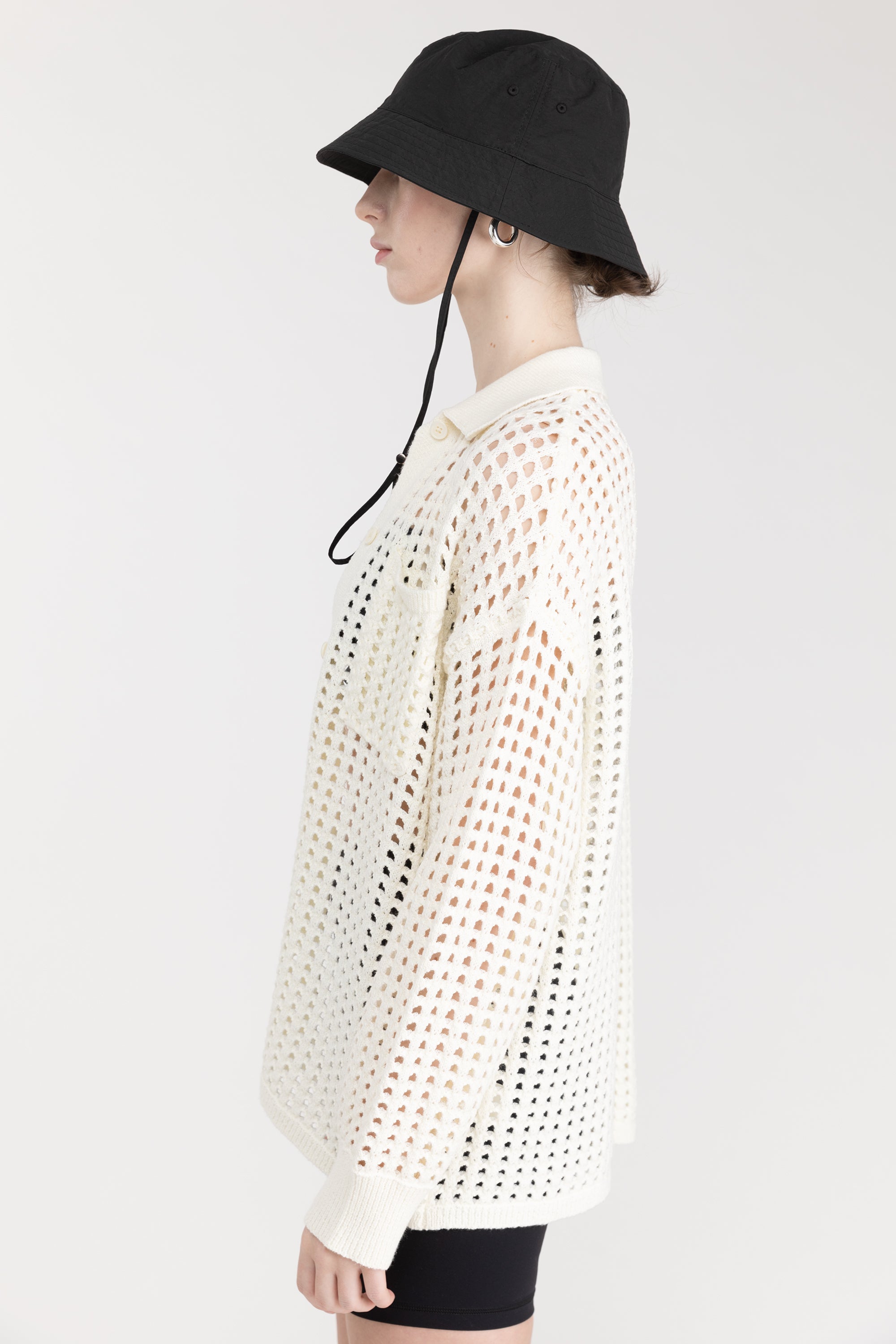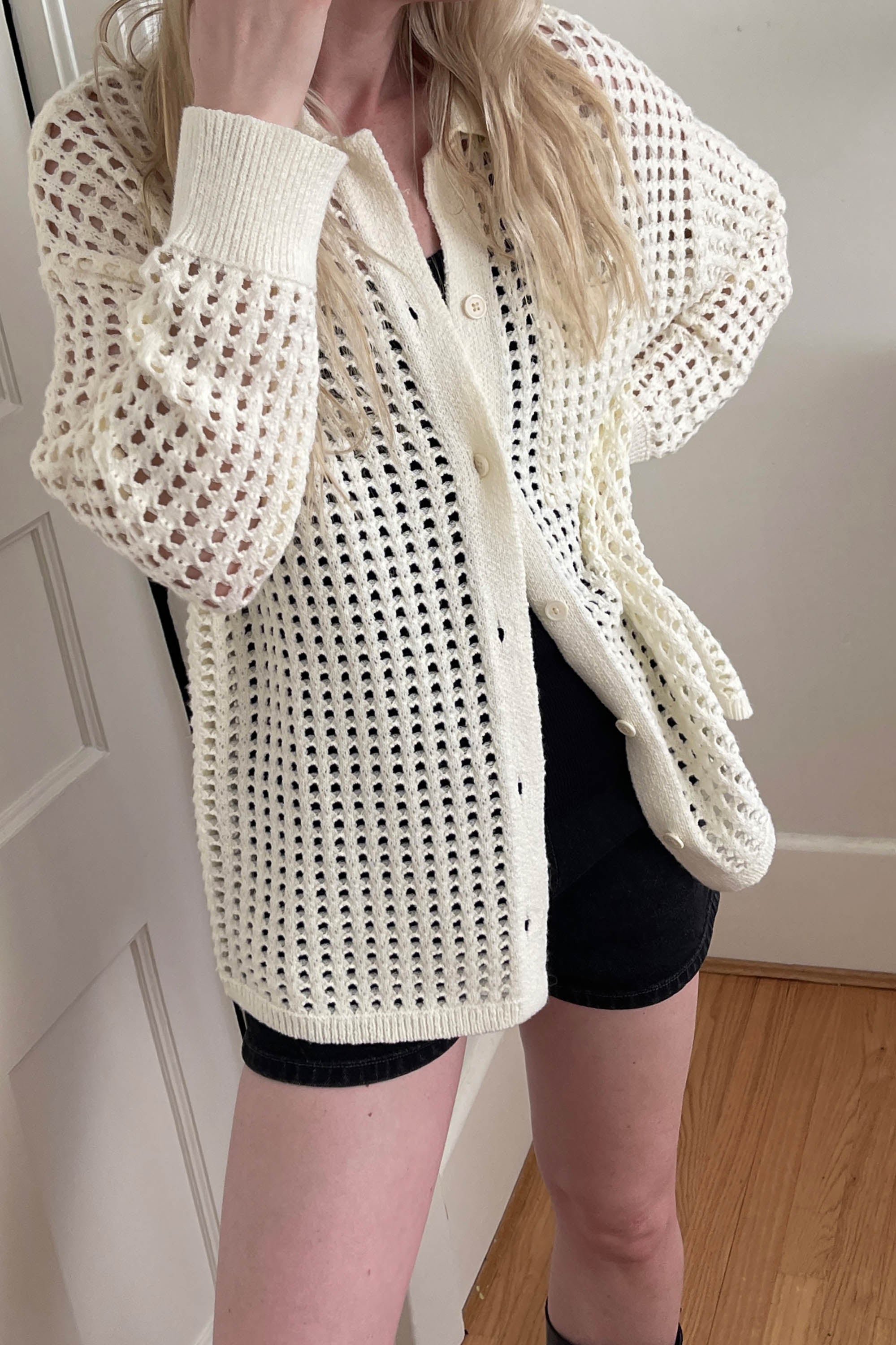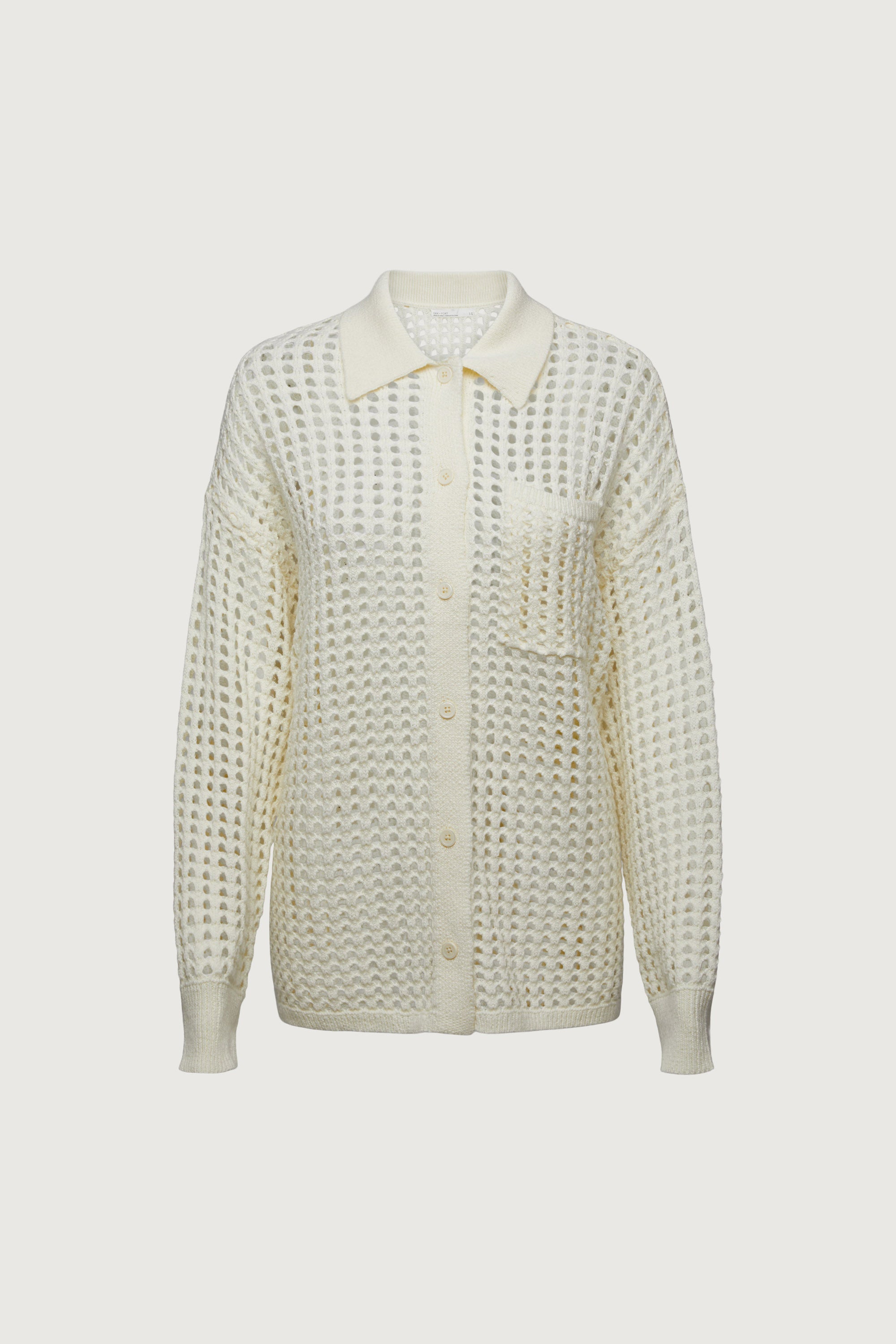 Crochet knit. Button-up design. Flared sleeves. Collared neckline.