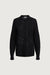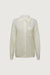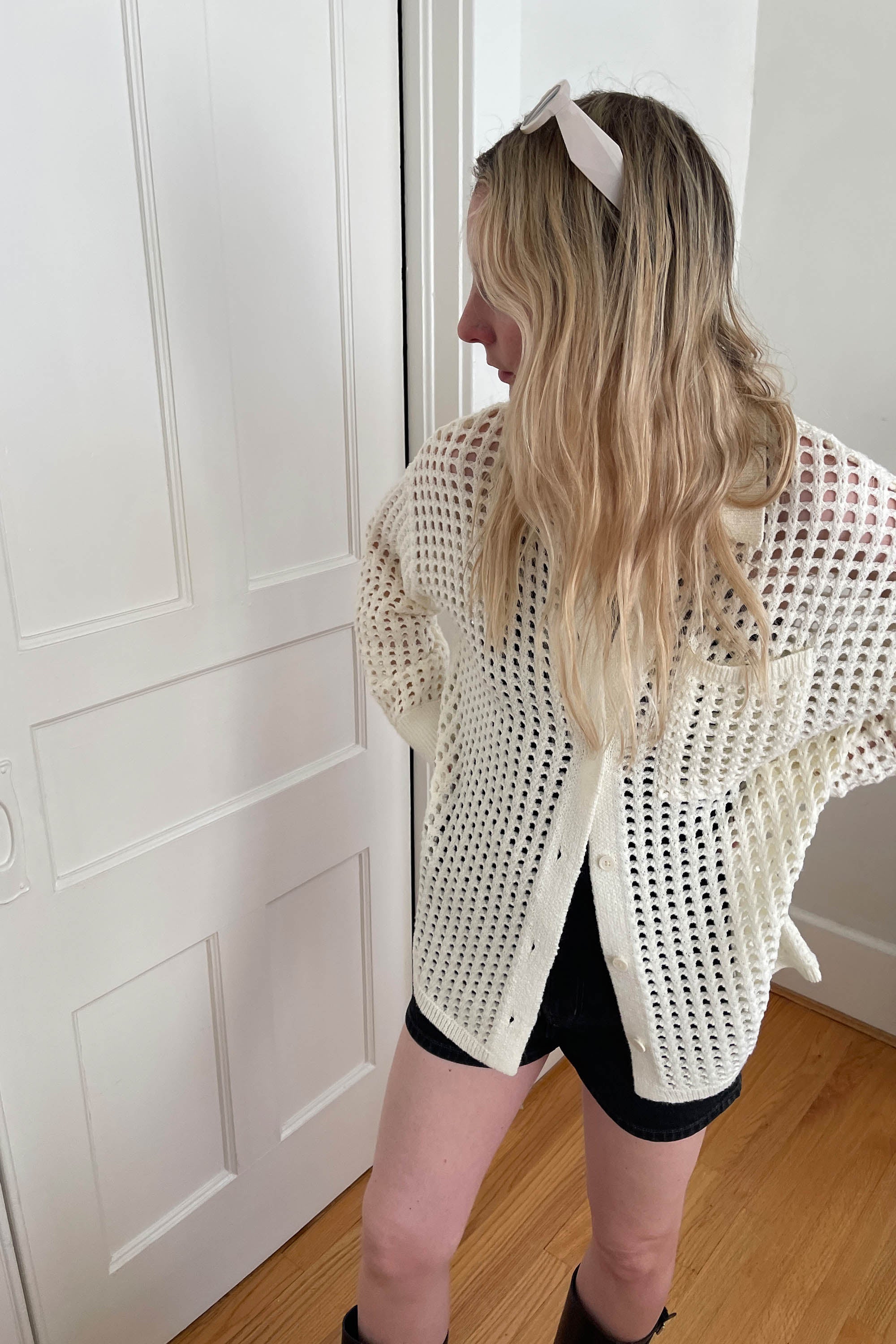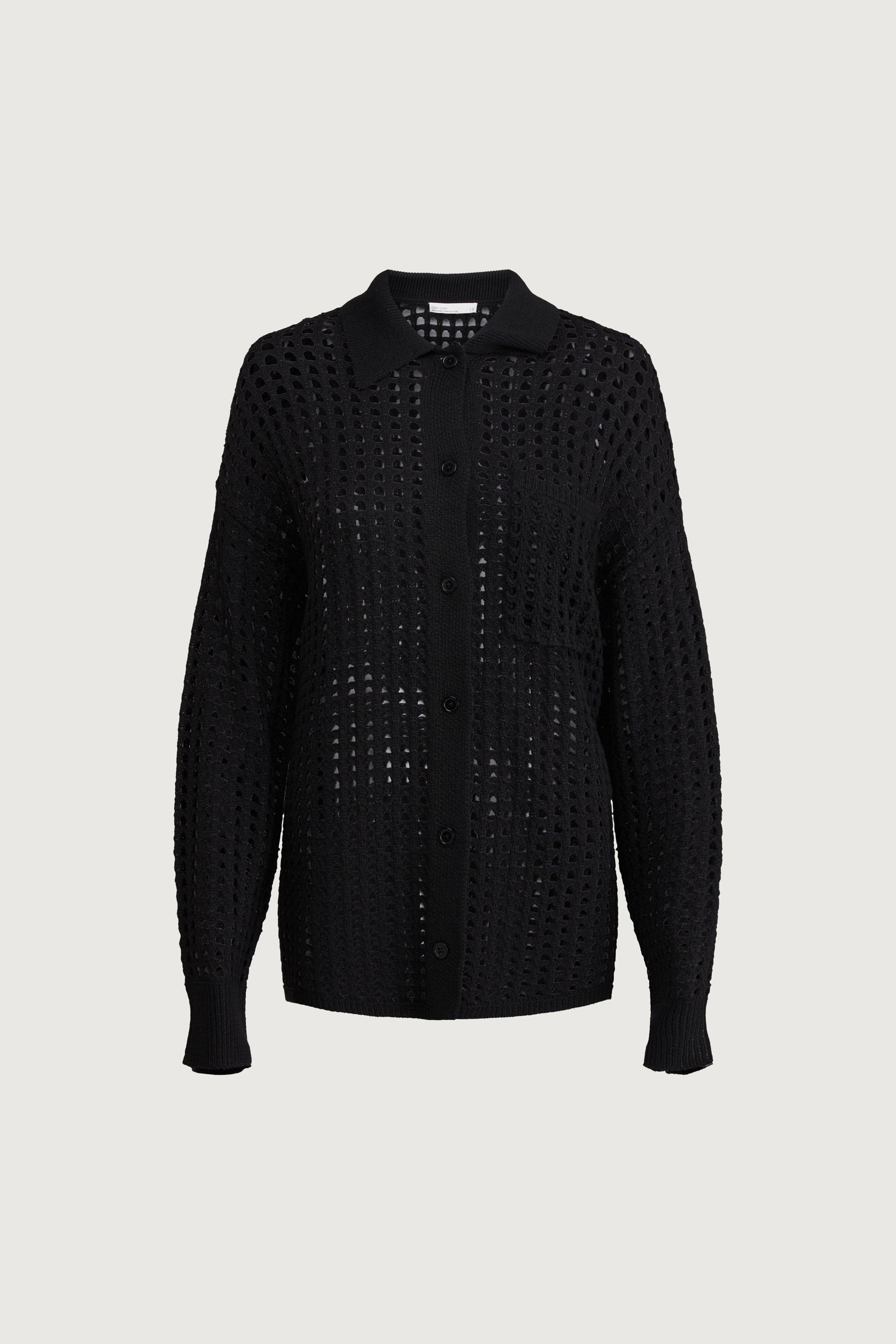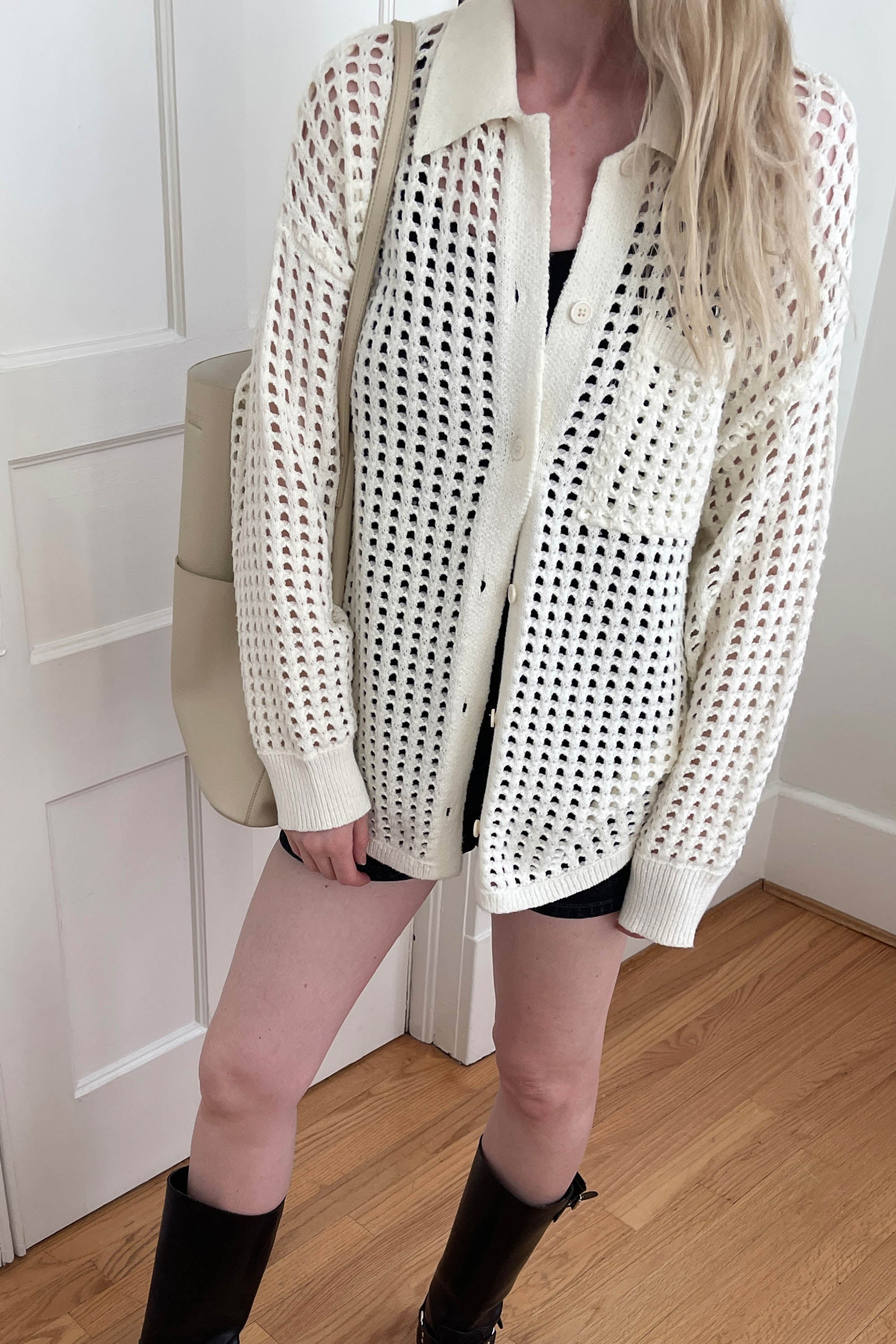 Crochet knit. Button-up design. Flared sleeves. Collared neckline.