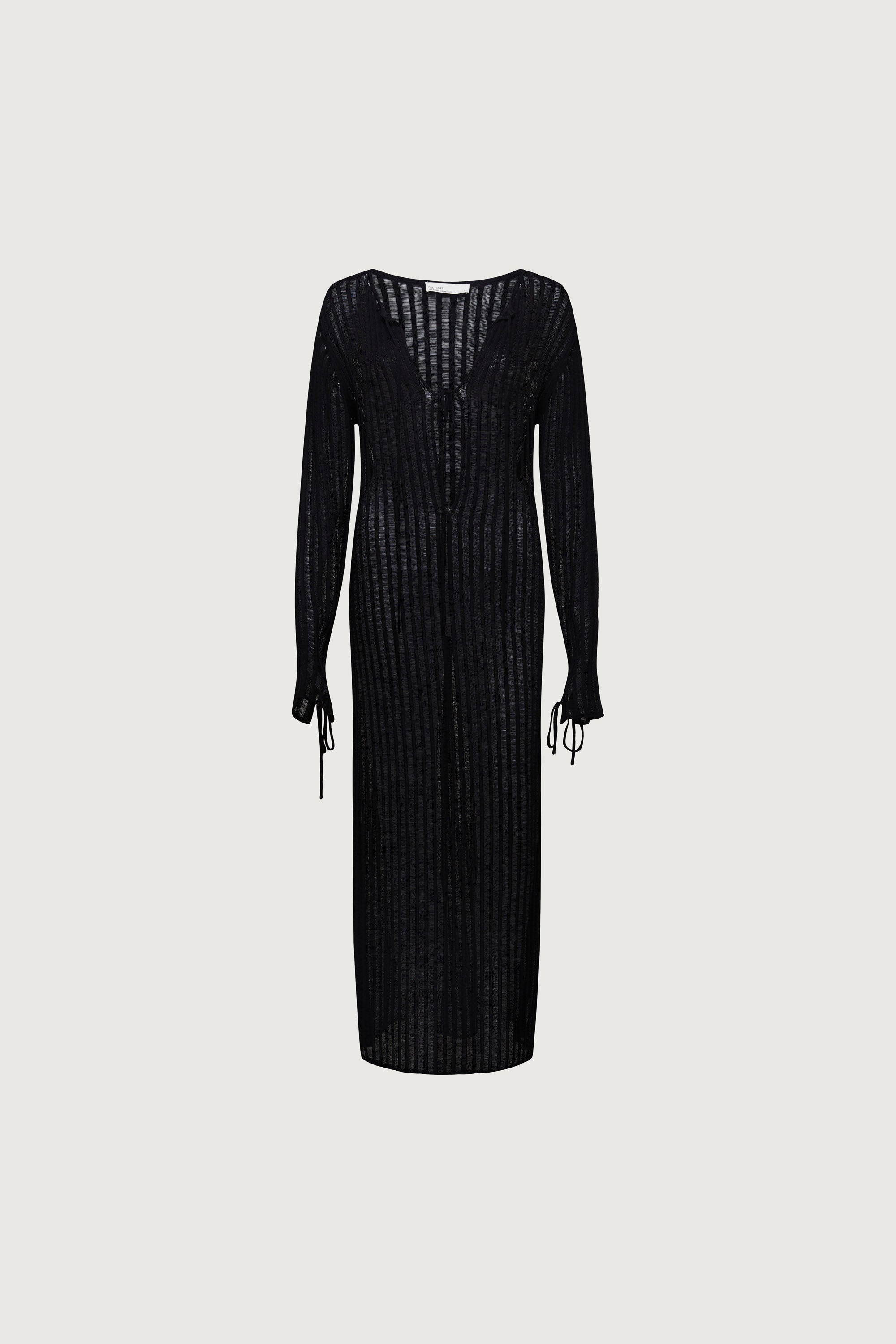Sheer rib-knit. Reversible. Two front ties. V-neckline. Split sides.