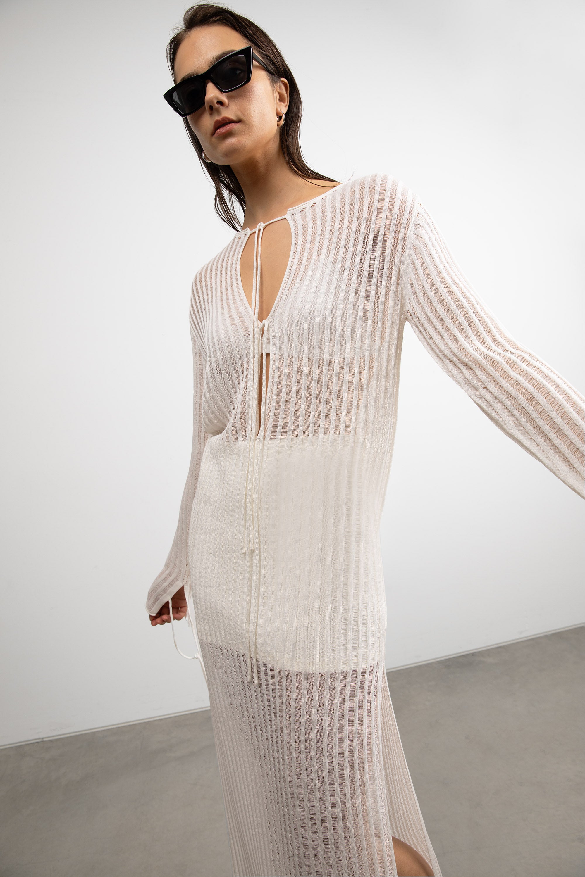 This reversible crochet knit maxi dress coverup is made in a relaxed fit. It's detailed with a deep V-neck with ties and split sides. A versatile piece you can wear with ties at the front or at the back. Take yours on your next vacation.