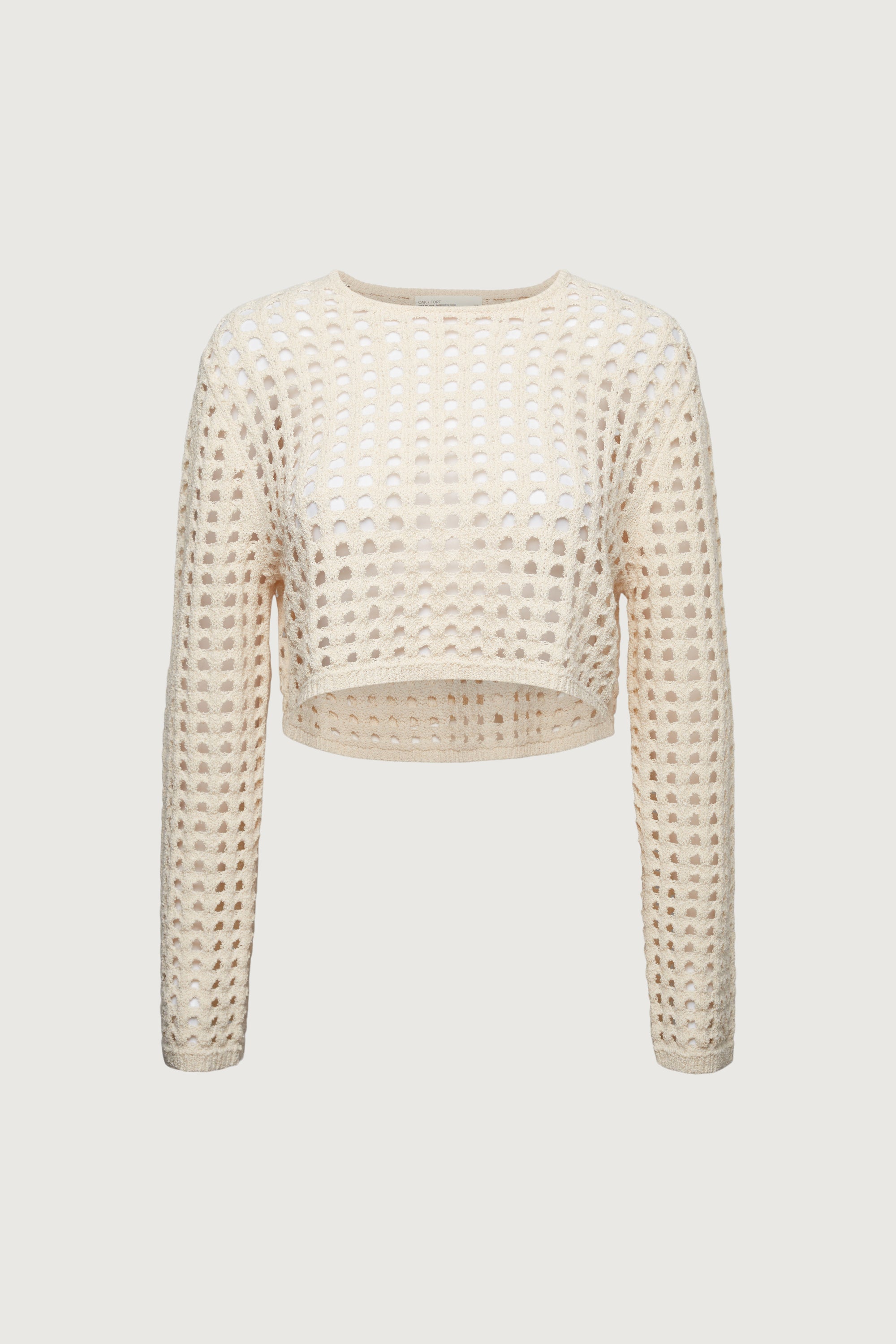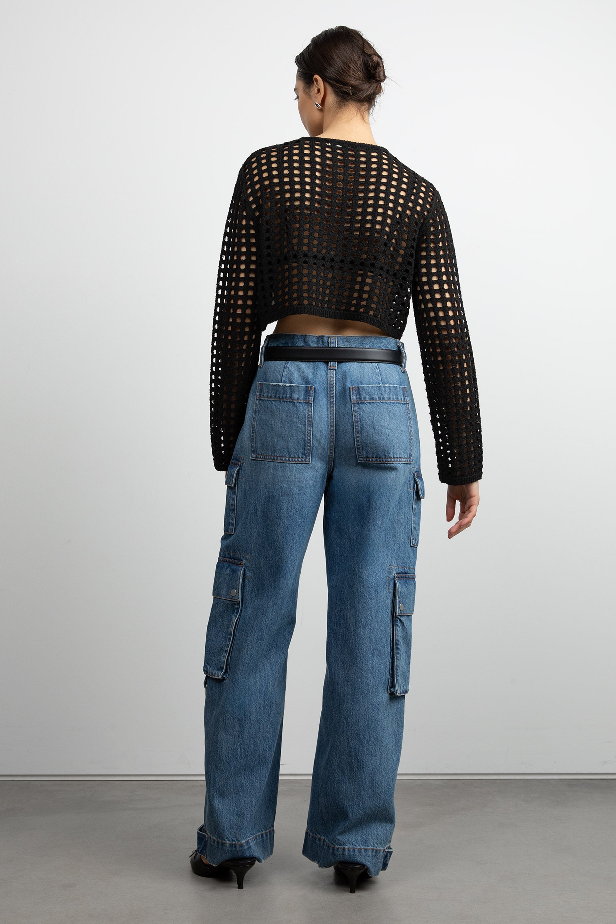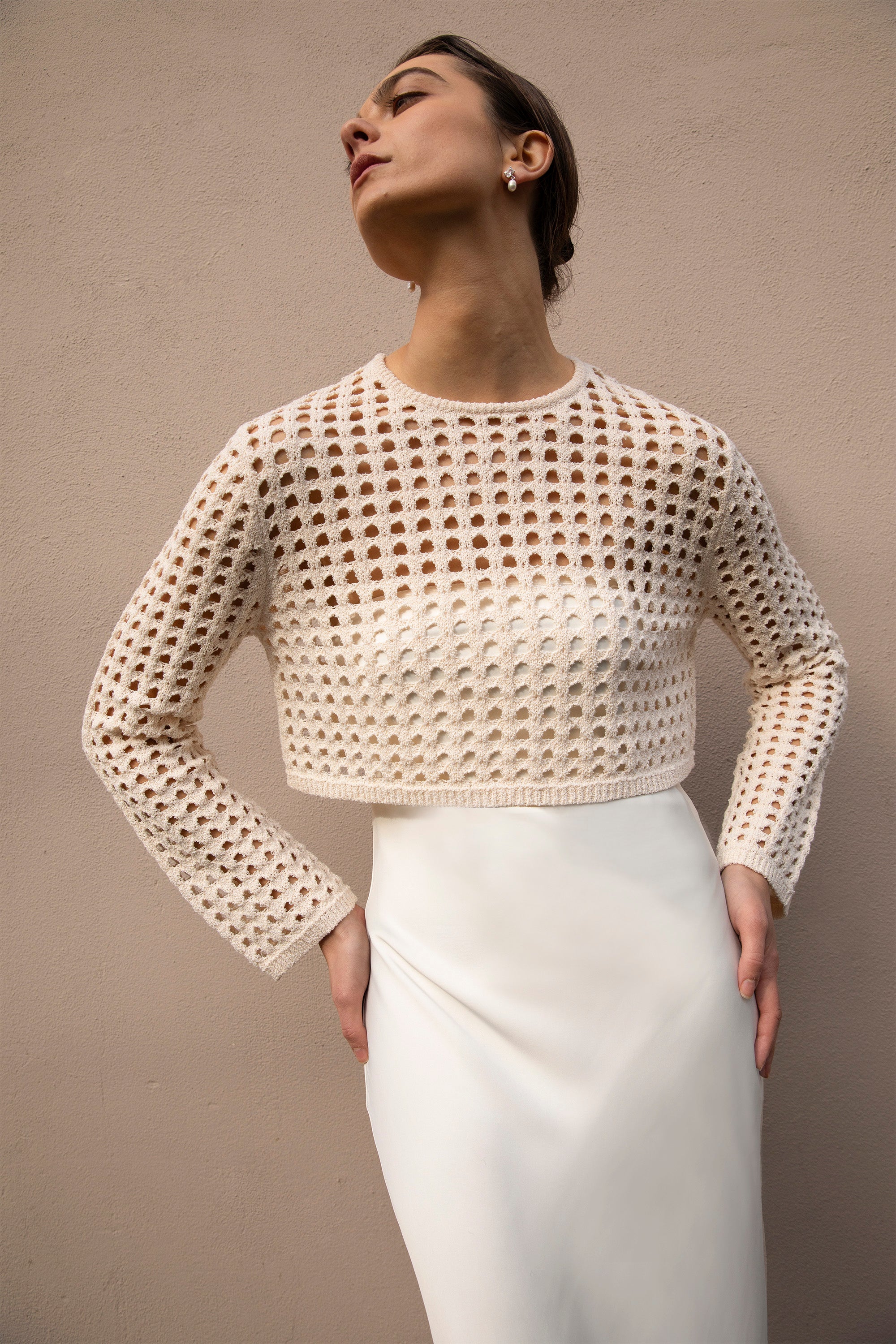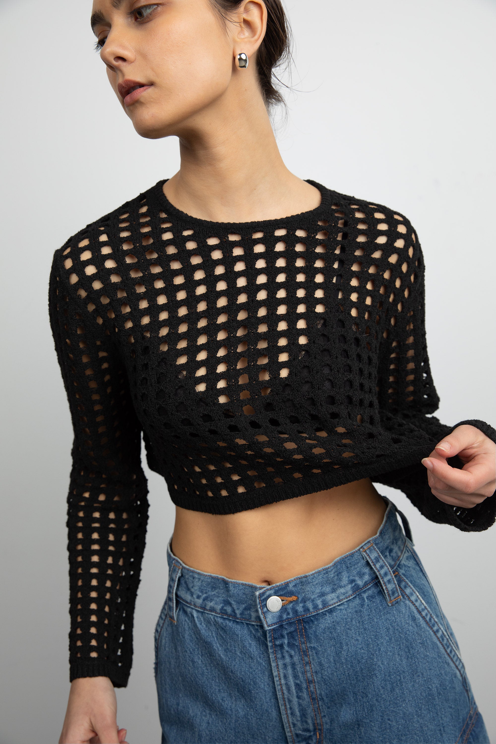 This cropped crochet sweater is the perfect addition to your Spring and Summer wardrobe. It a ribbed neckline and subtle bell sleeves. Wear yours with a mini skirt and sandals.