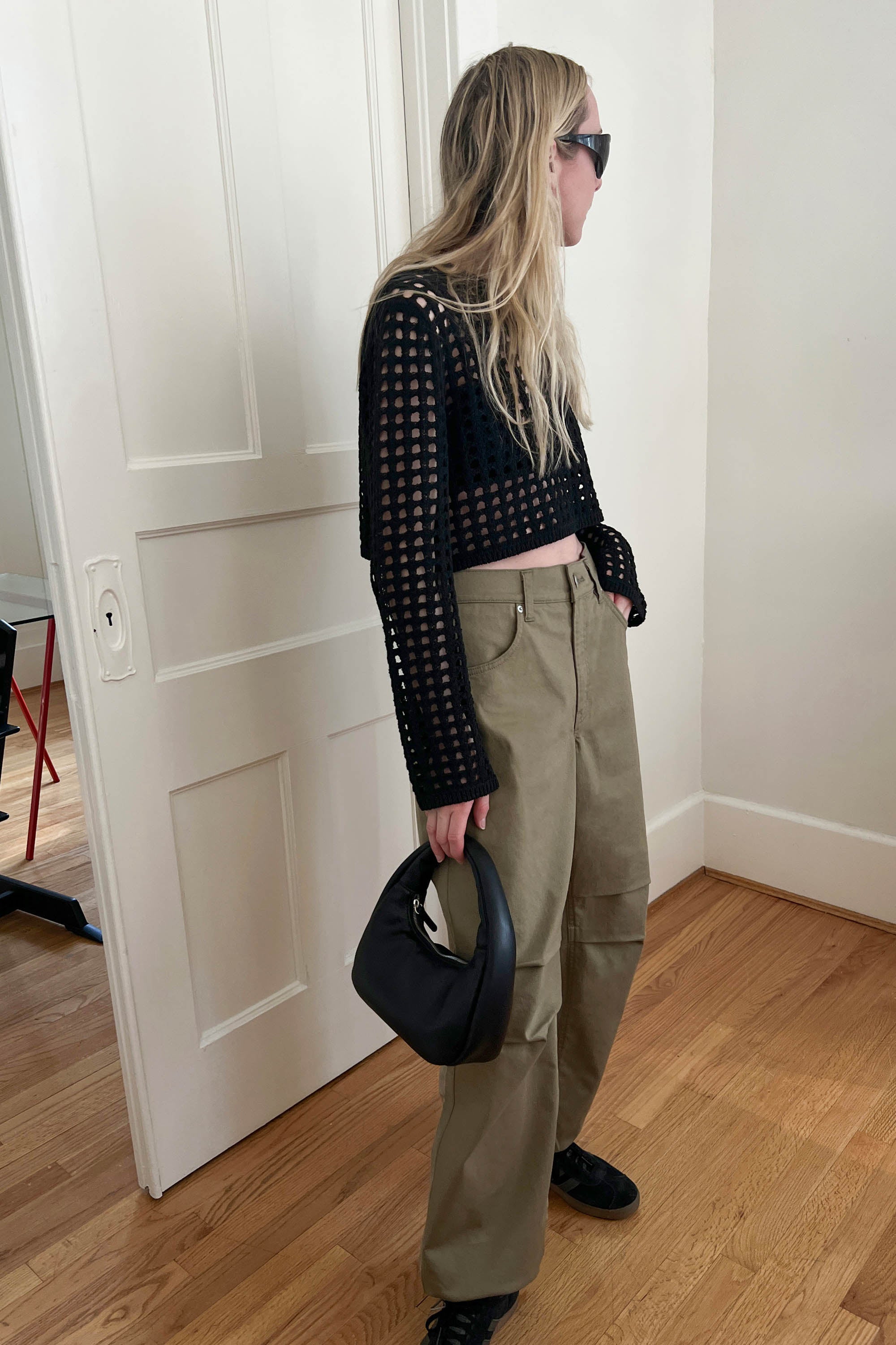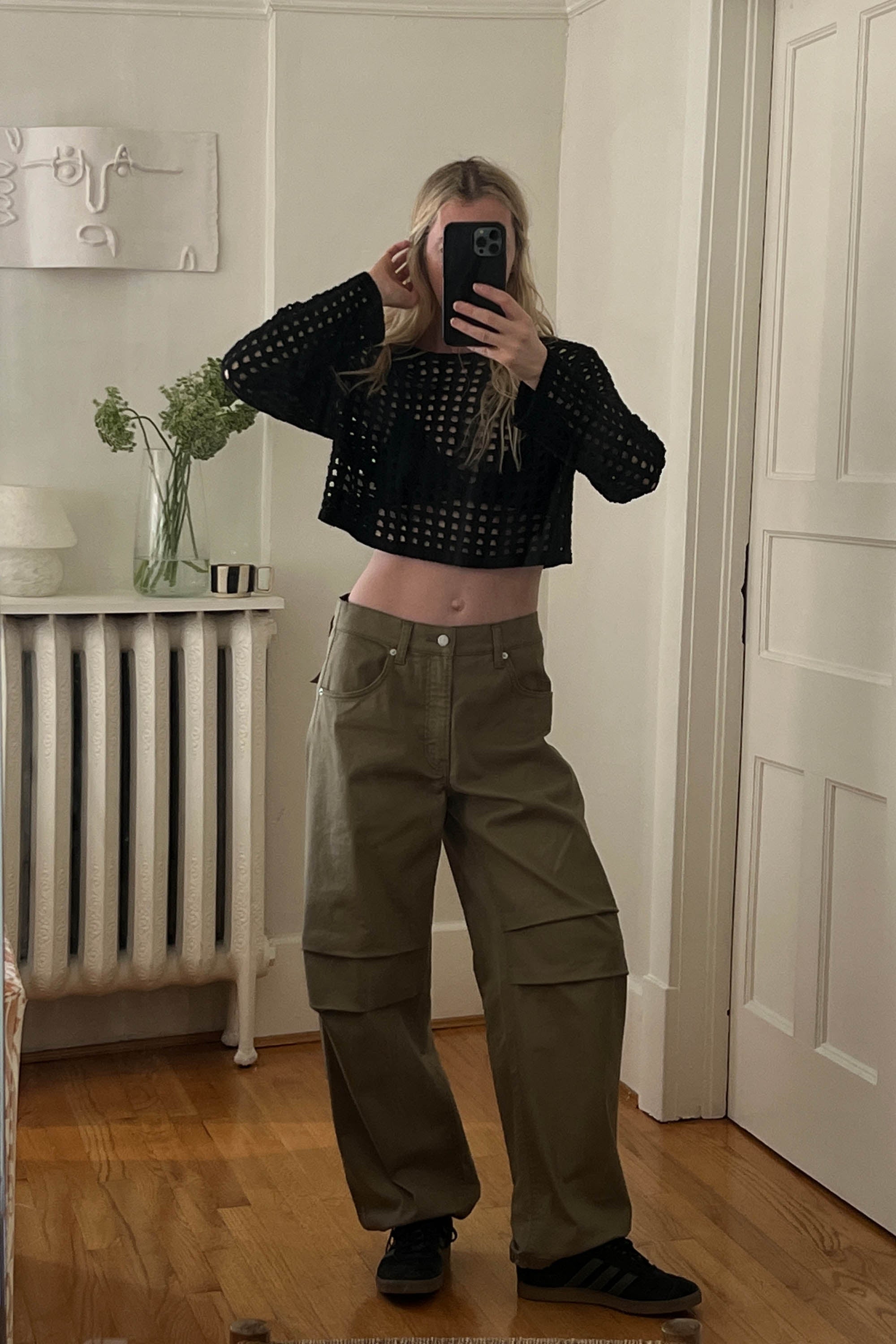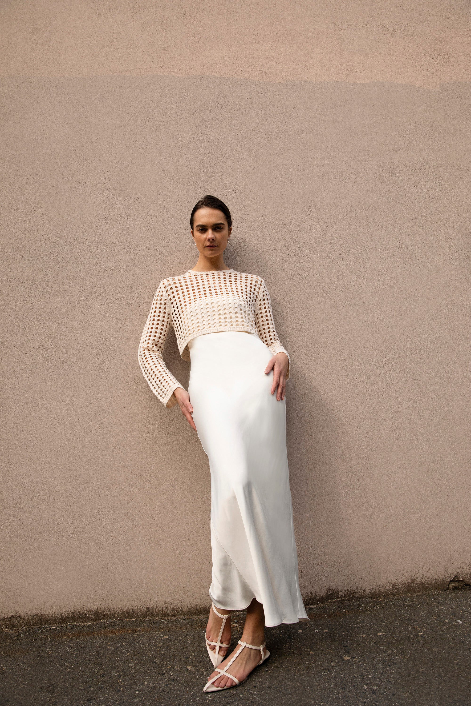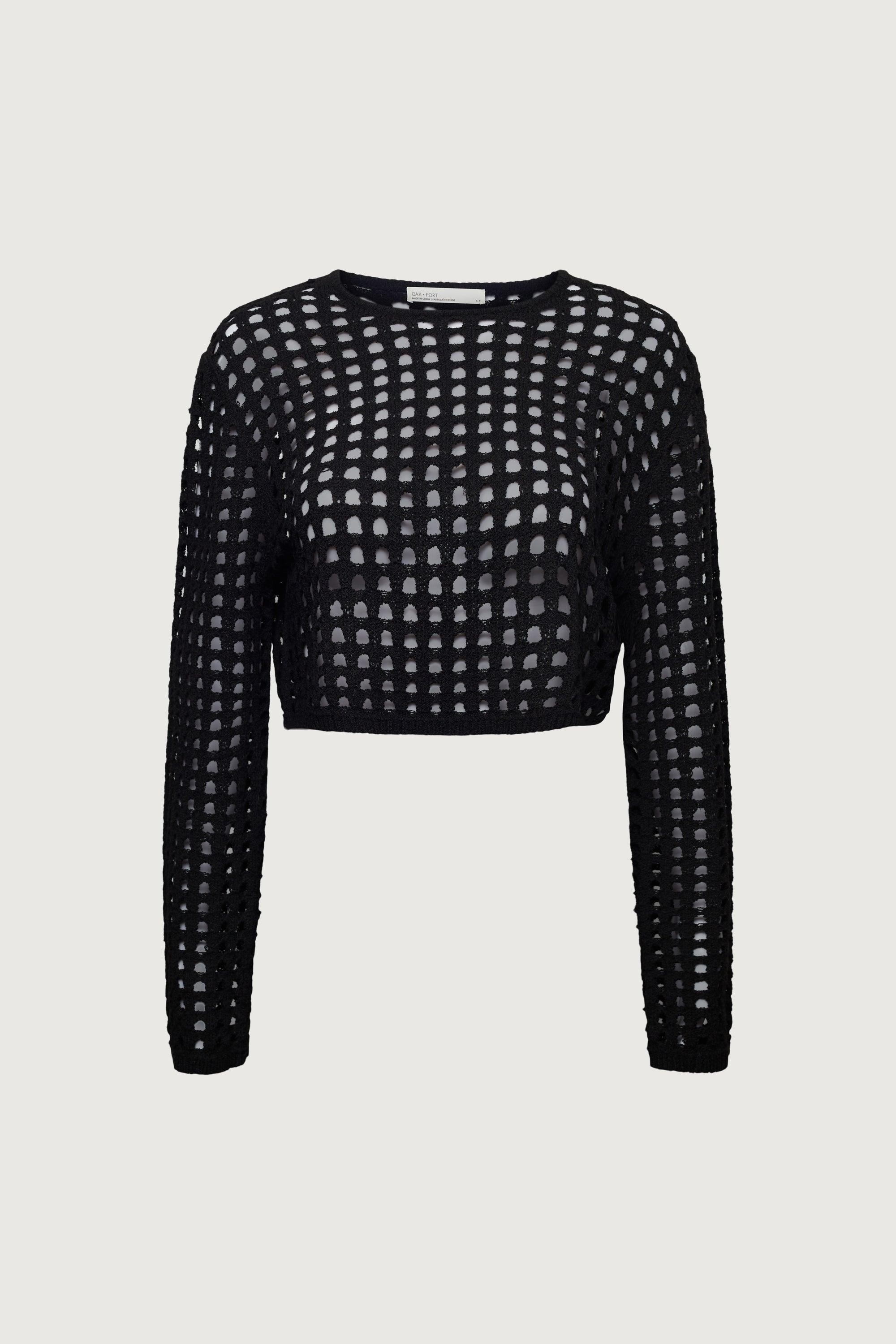 This cropped crochet sweater is the perfect addition to your Spring and Summer wardrobe. It a ribbed neckline and subtle bell sleeves. Wear yours with a mini skirt and sandals.