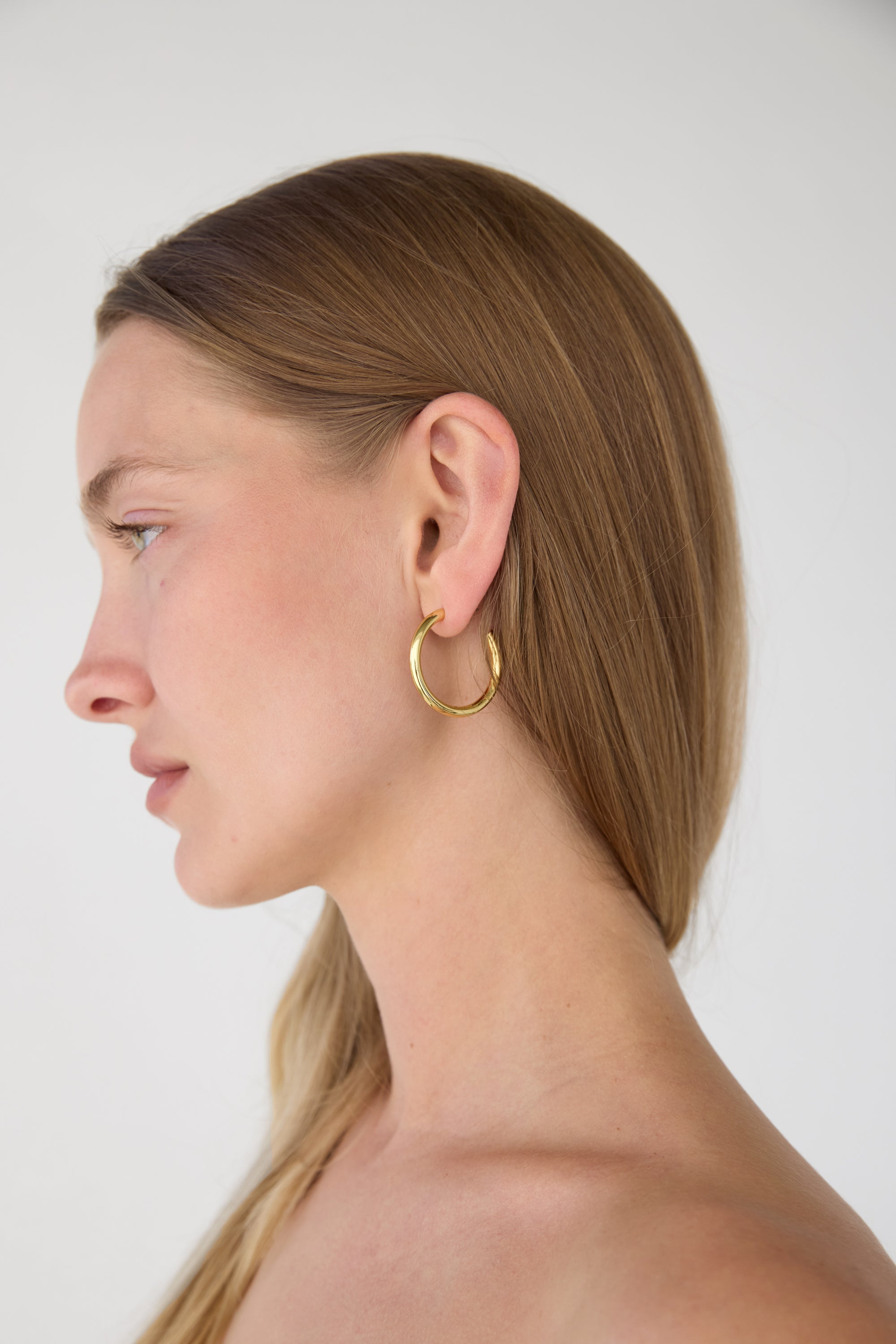 These thick hoop earrings feature an open silhouette with a high shine finish. A simple pair to take from day to night, try styling this piece with a turtleneck sweater and jeans or switch to a wide-leg jumpsuit for an elegant occasion.
