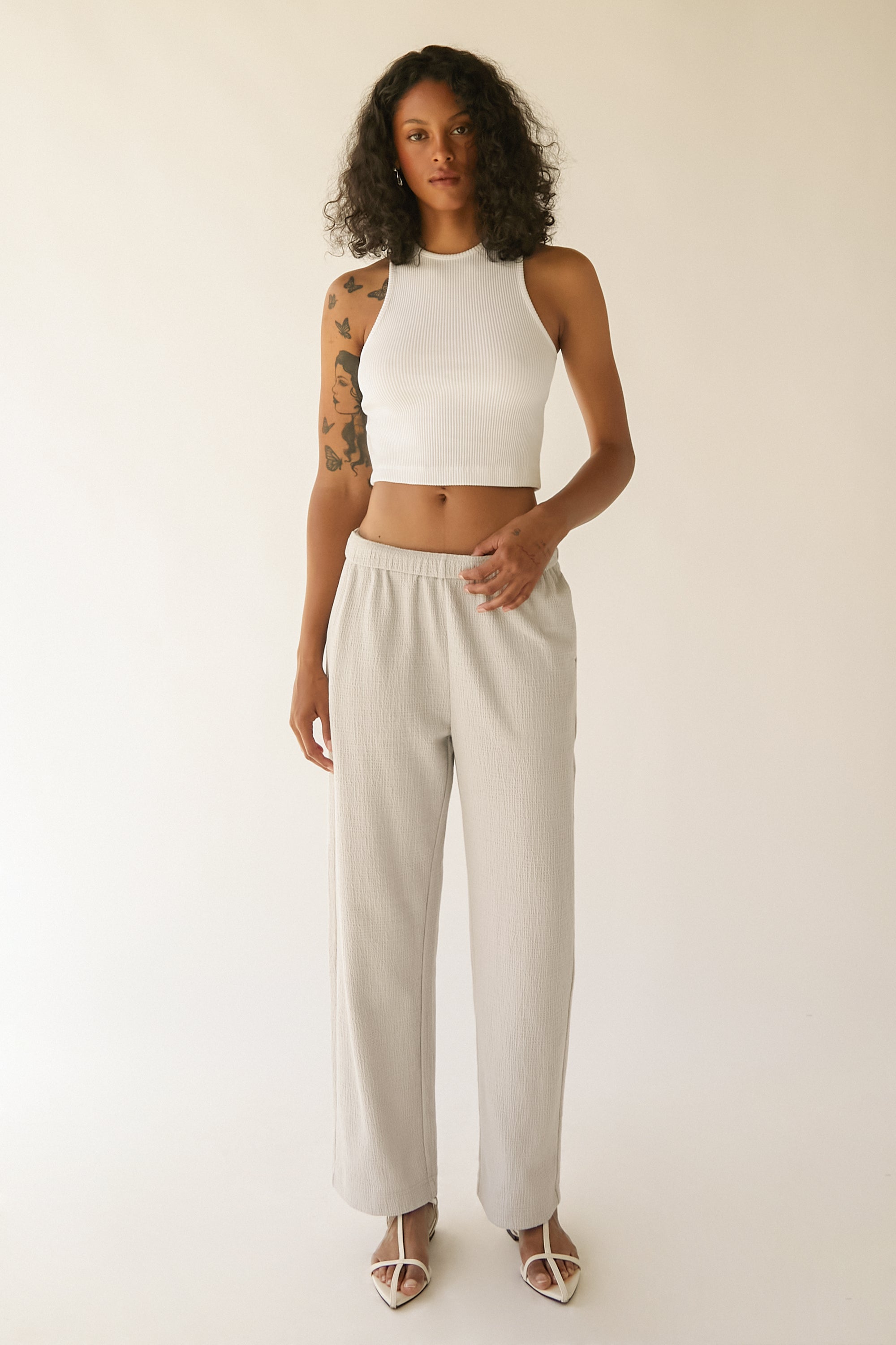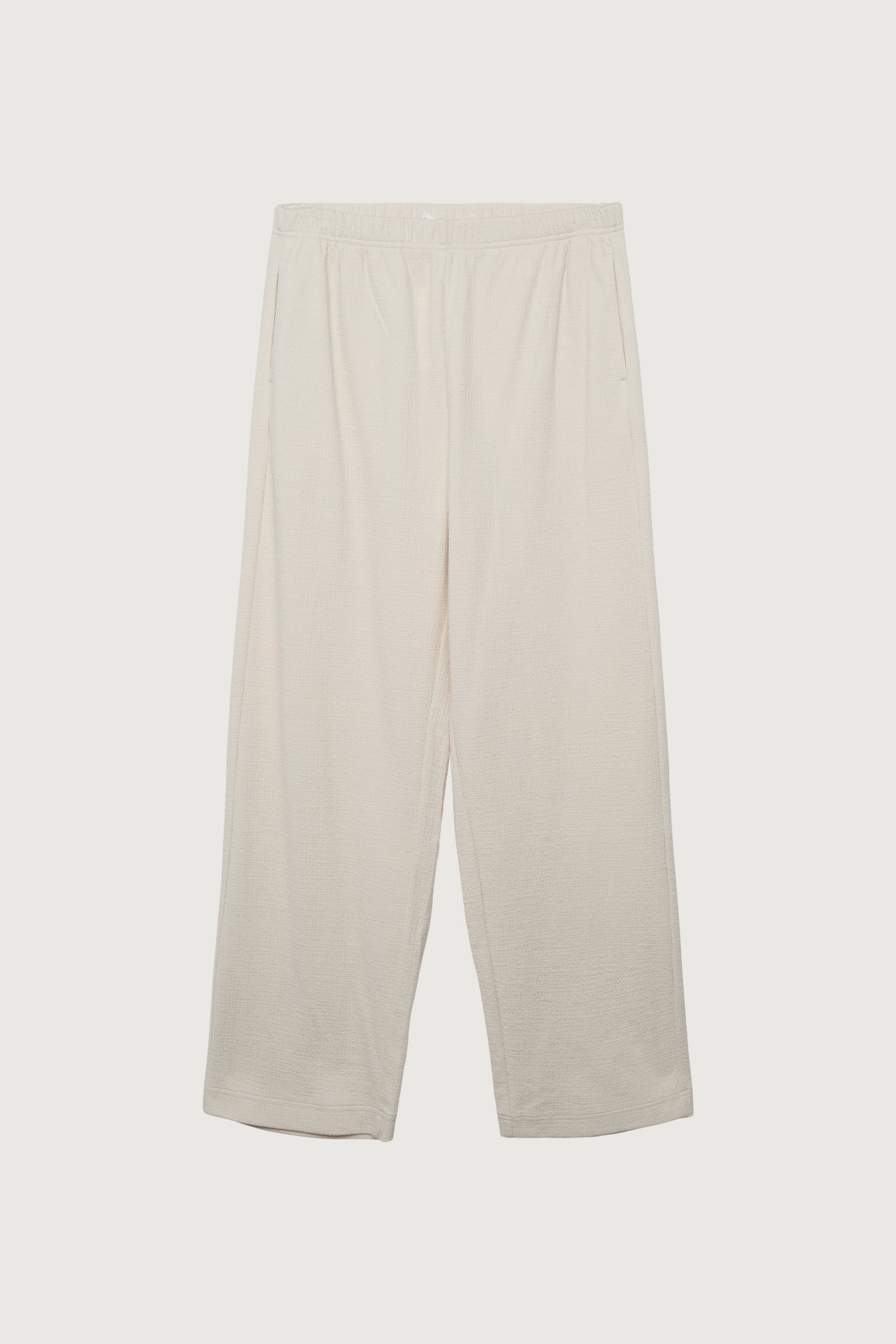 These elastic waist pants are cut from a textured, jacquard knit cotton blend in a relaxed, straight leg cut with a high-rise waist. Super lightweight and comfortable to wear all day. Pair it with with matching OVERSIZED KNIT SHIRT (KT-6318-W).
