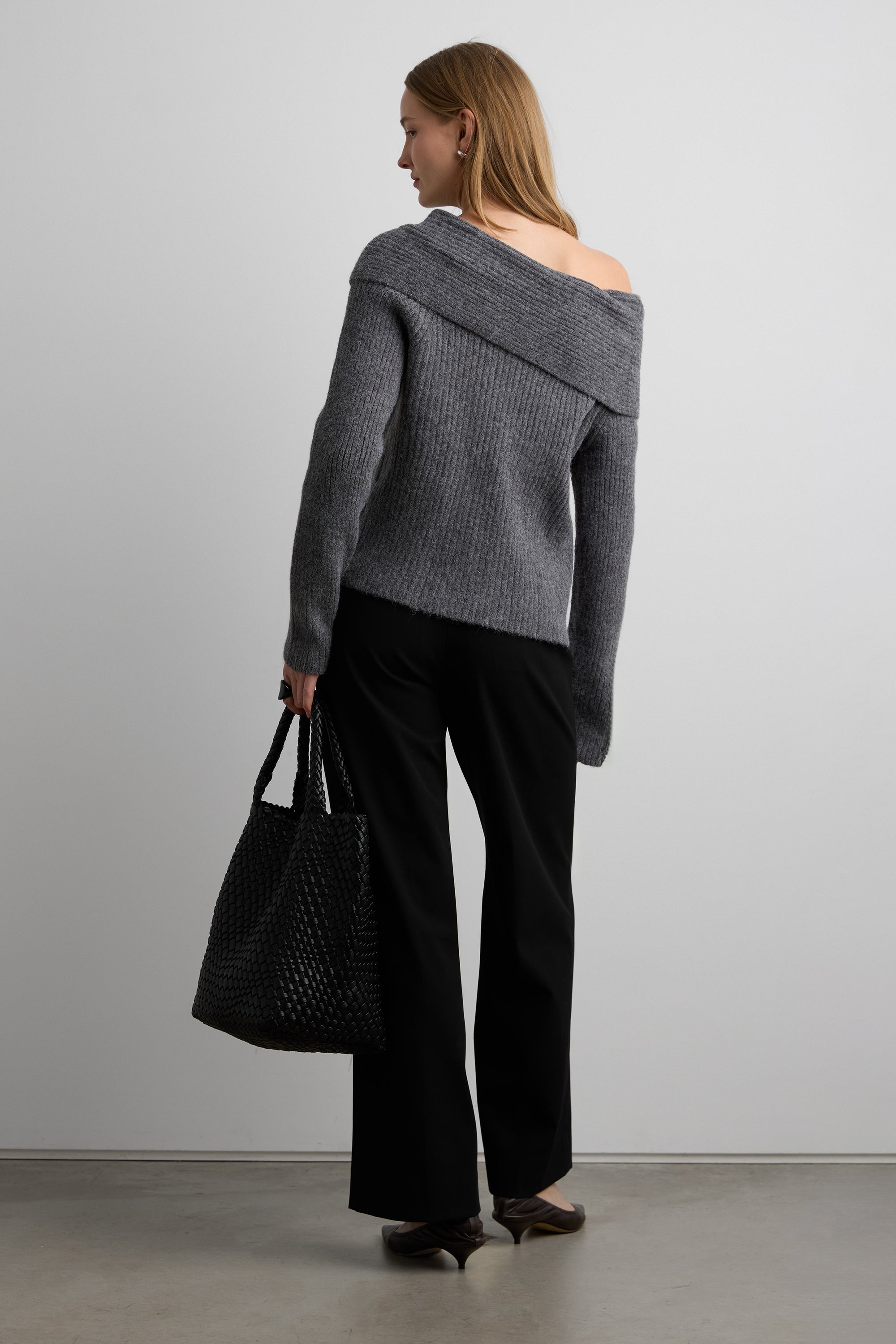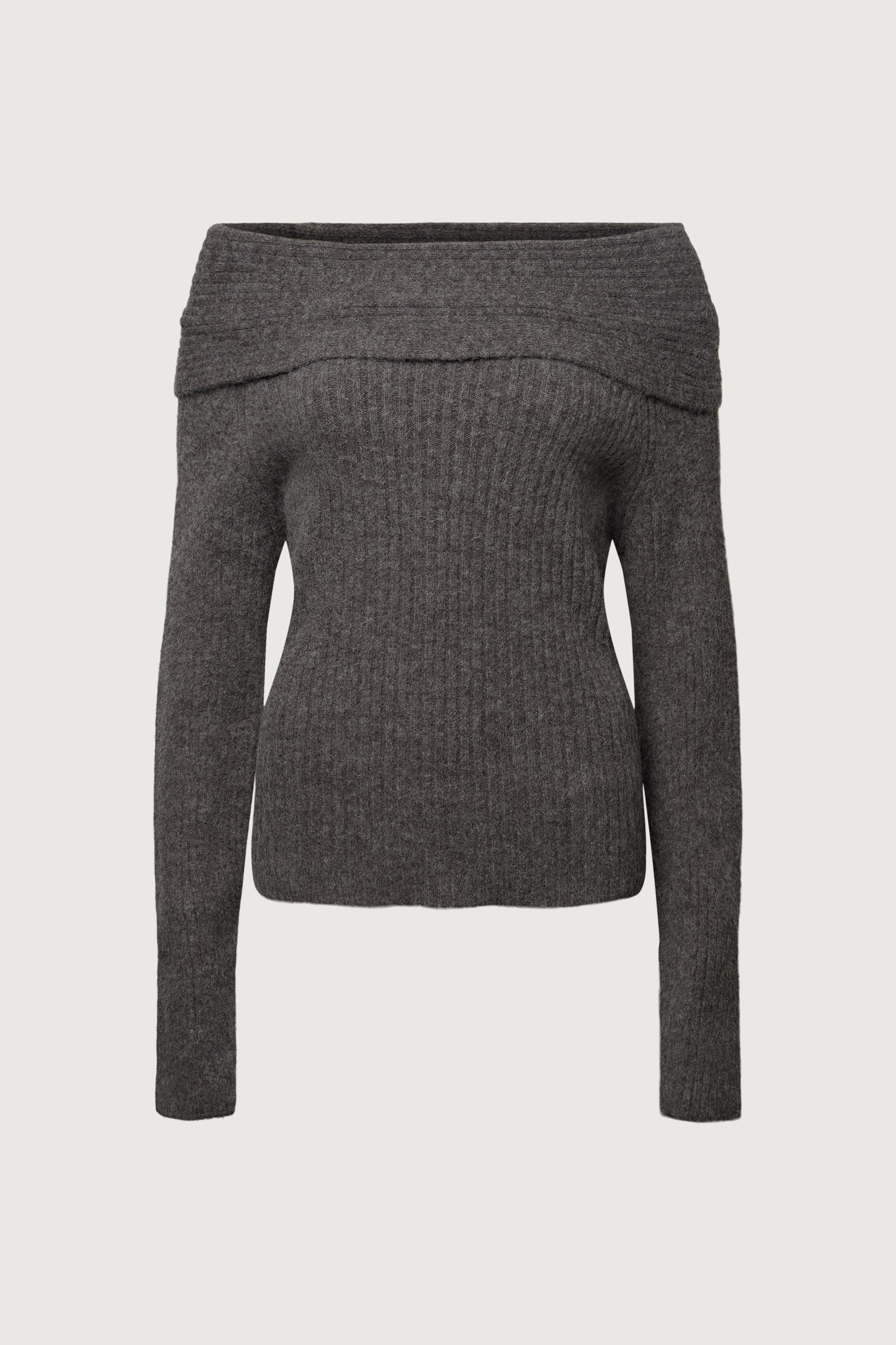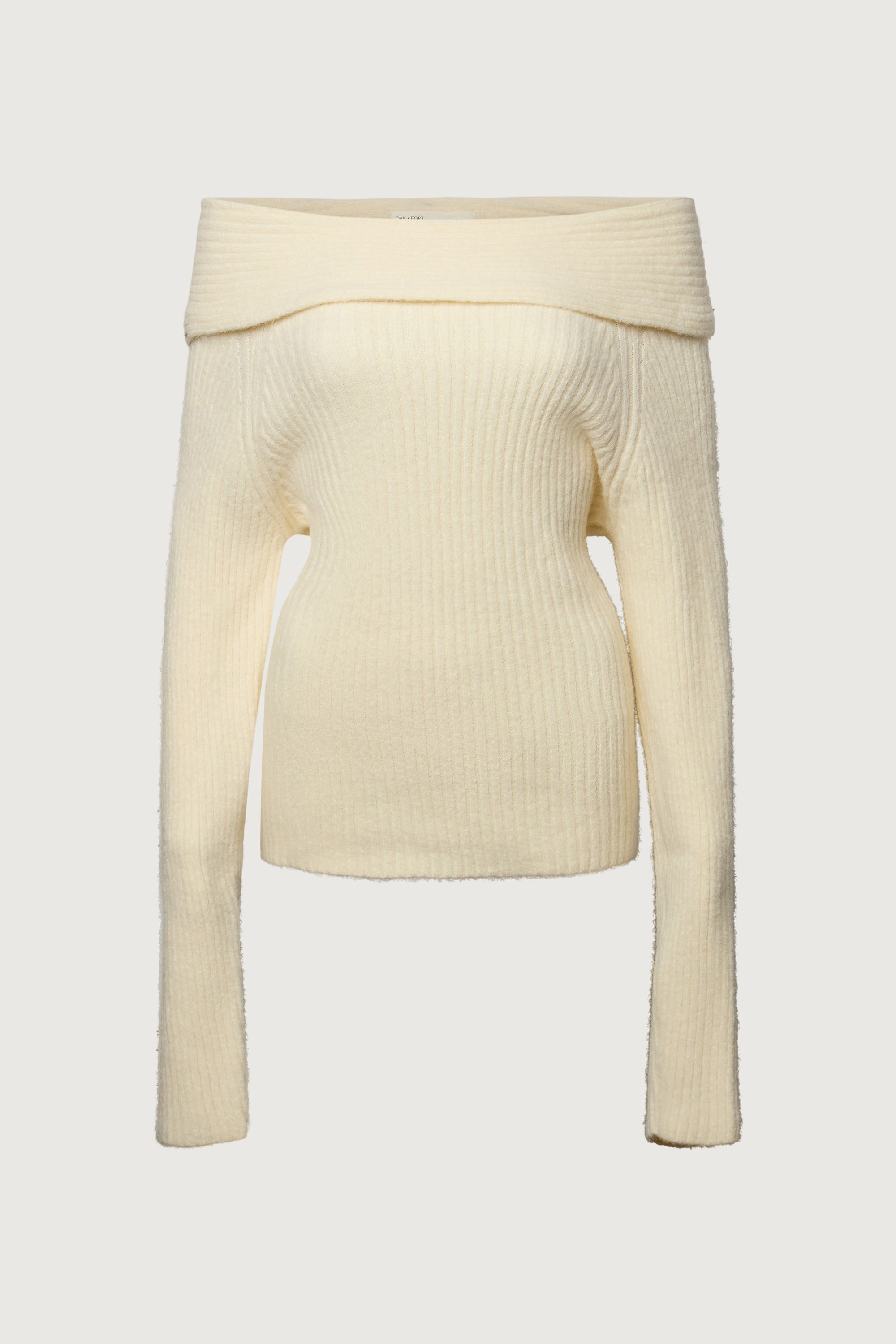 A ribbed knit sweater designed with an fold-over neckline that can be styled off-shoulder or draped for a relaxed silhouette. A refined piece that transitions effortlessly from day to evening.