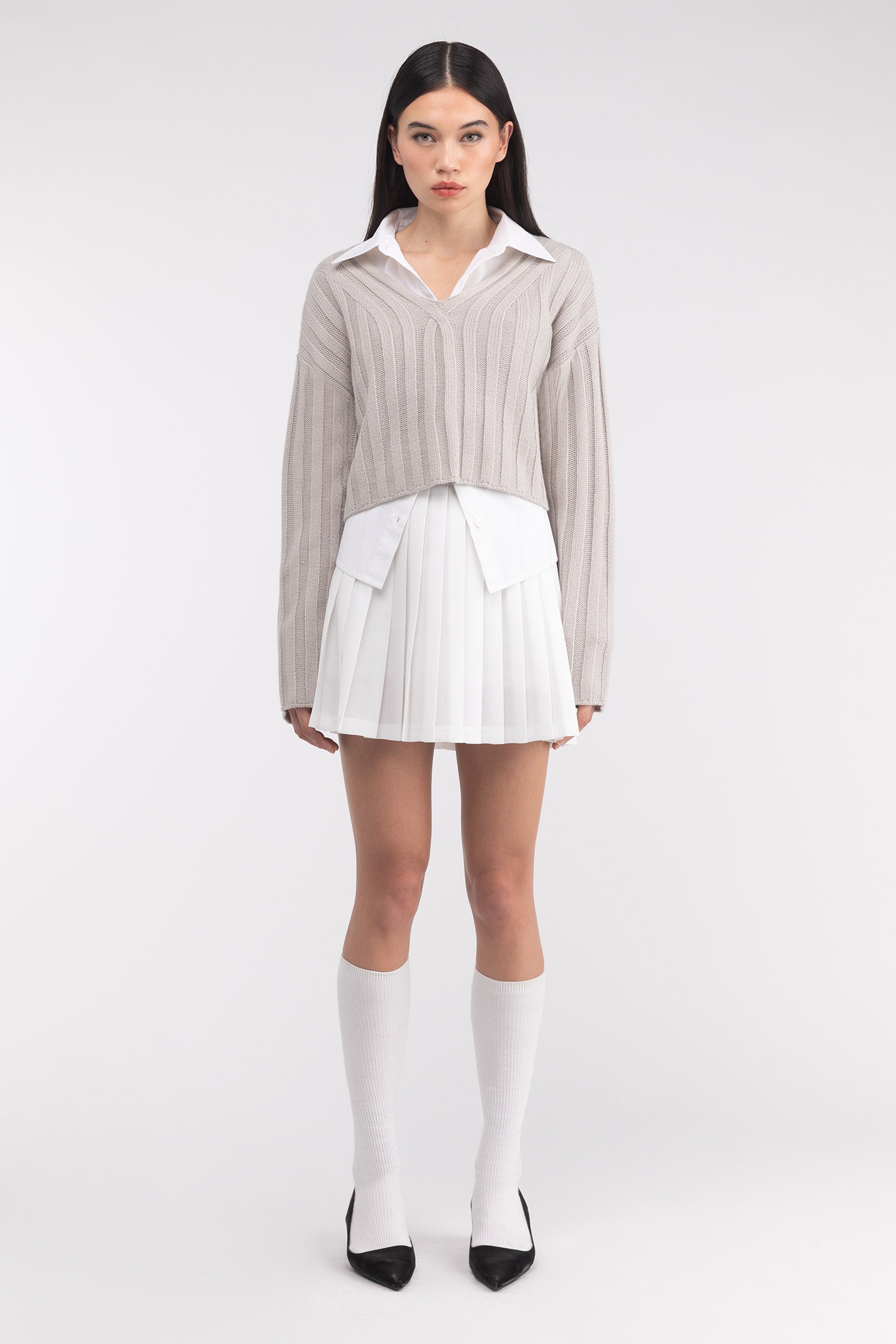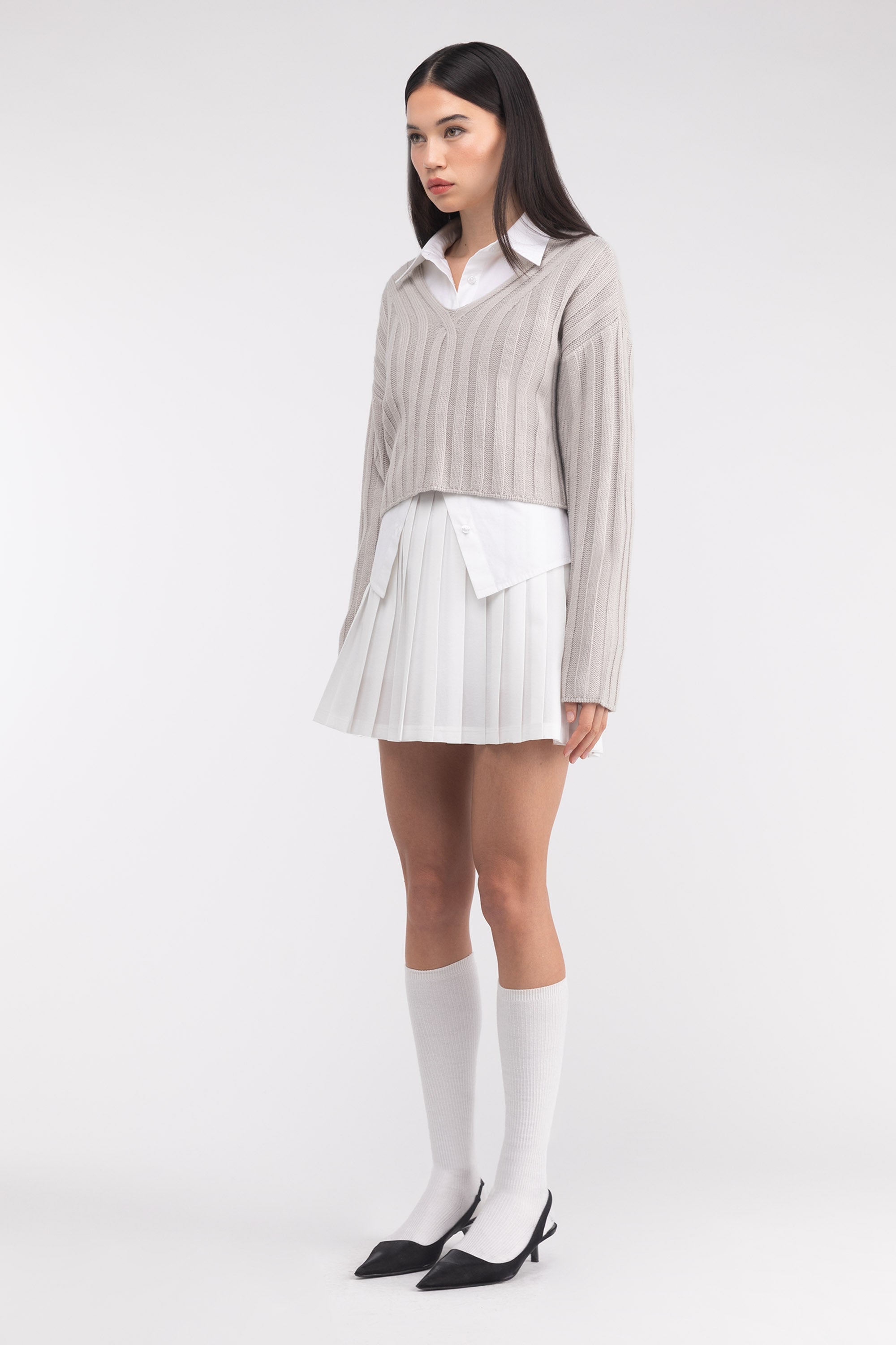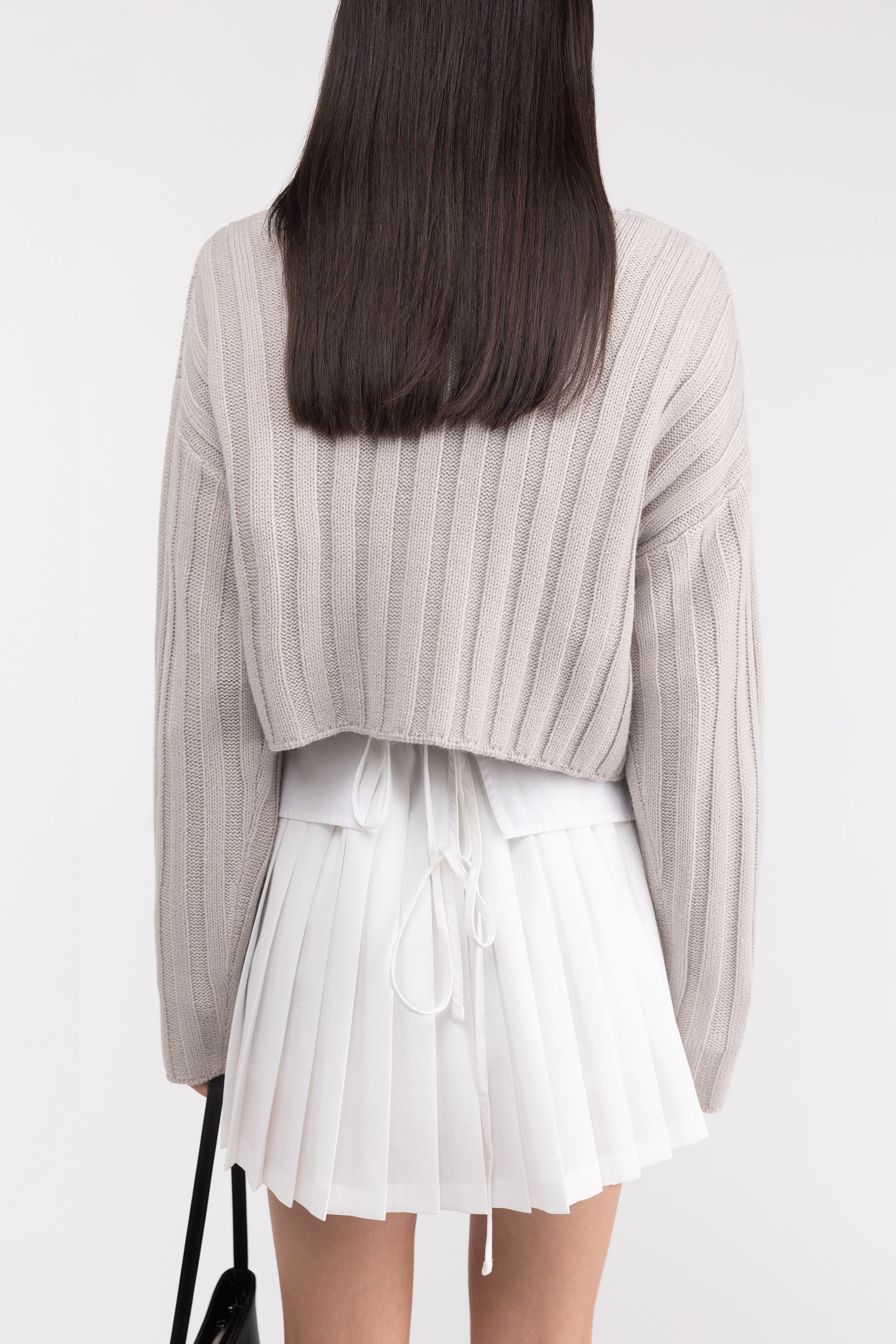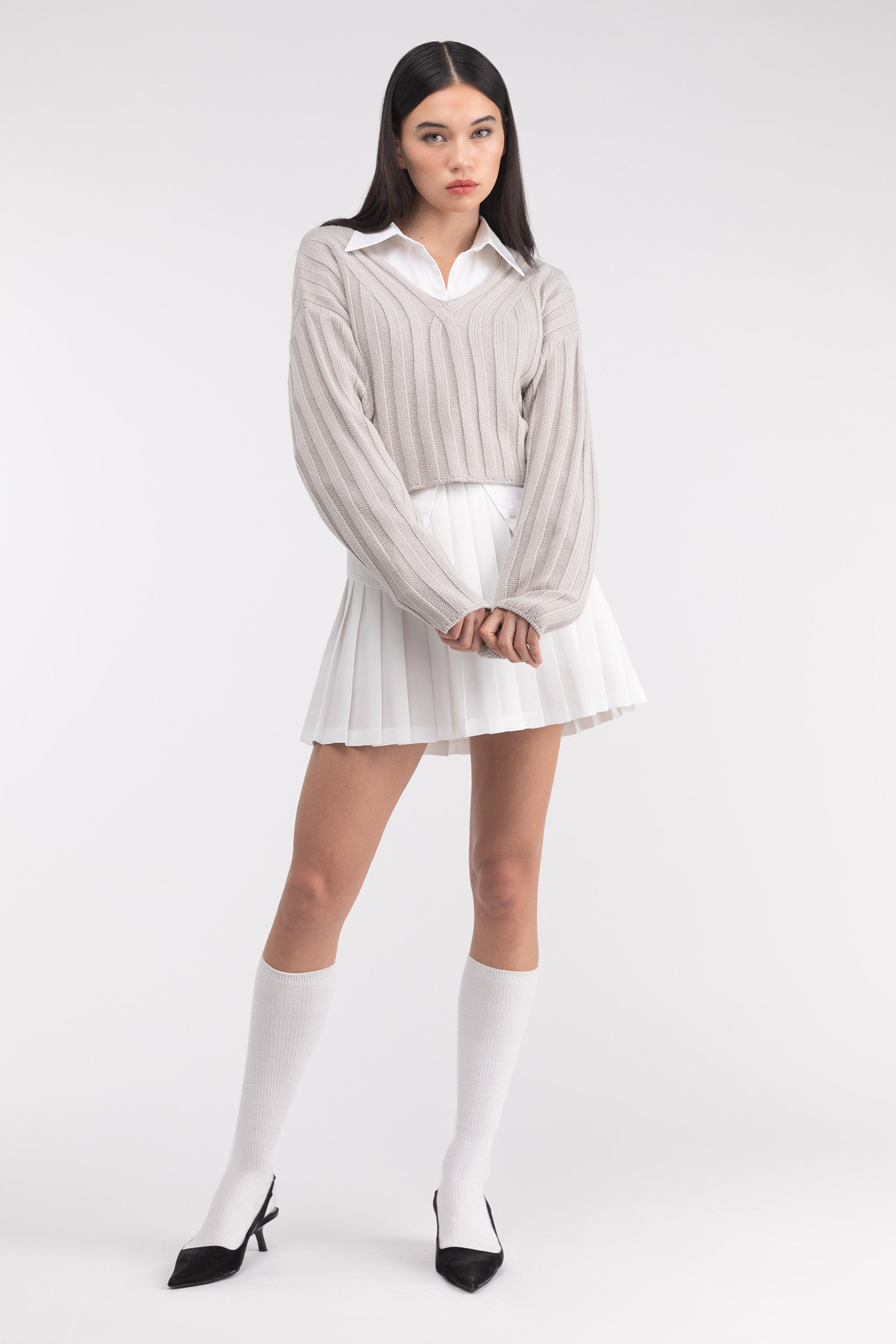 This cropped sweater is made in a relaxed fit and has a unique ribbed knit design. It has dropped shoulders and a subtle V-neckline. Wear yours with a mini skirt and boots.