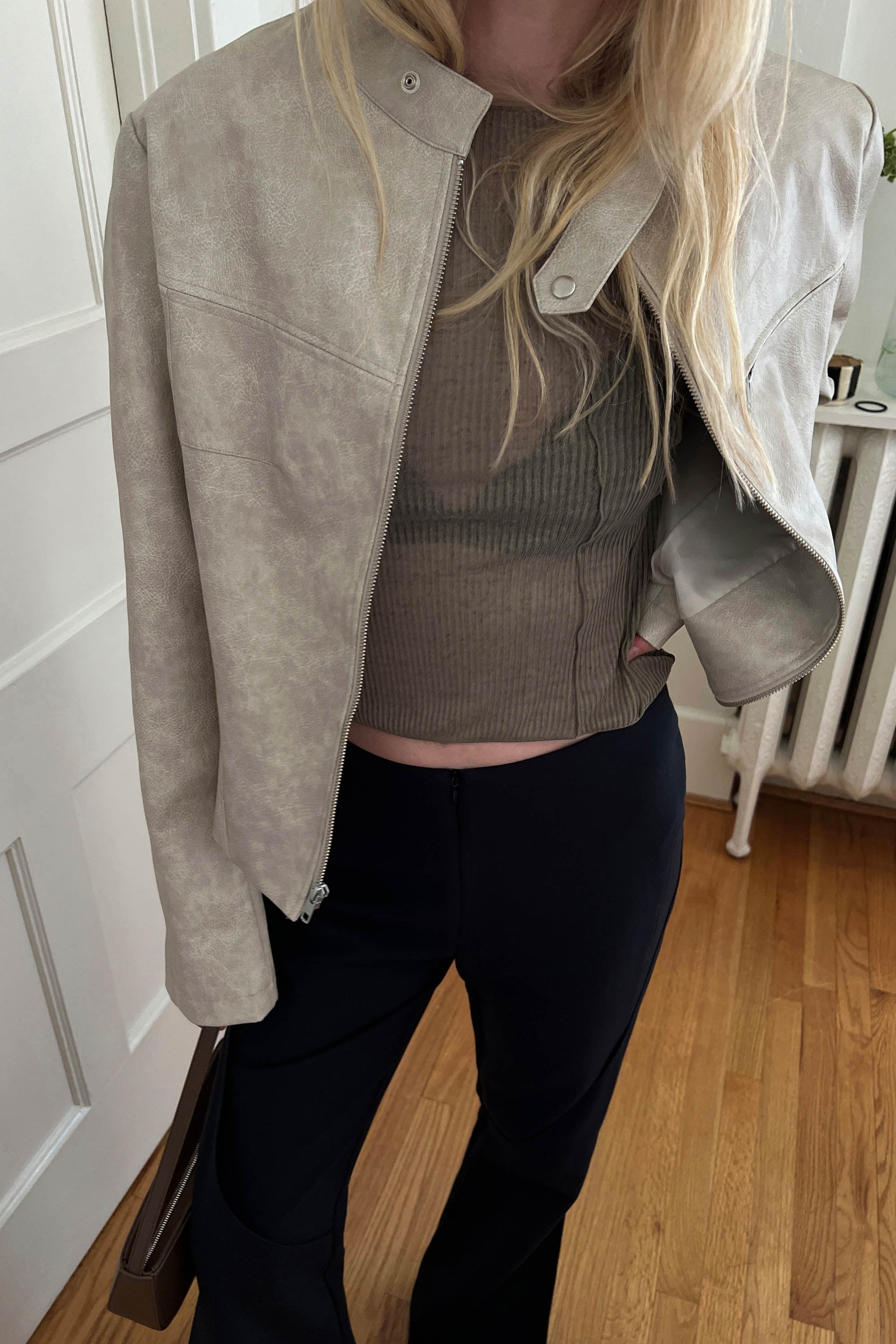 LAYERED DETAIL CONTRAST STITCH VEGAN LEATHER BOMBER