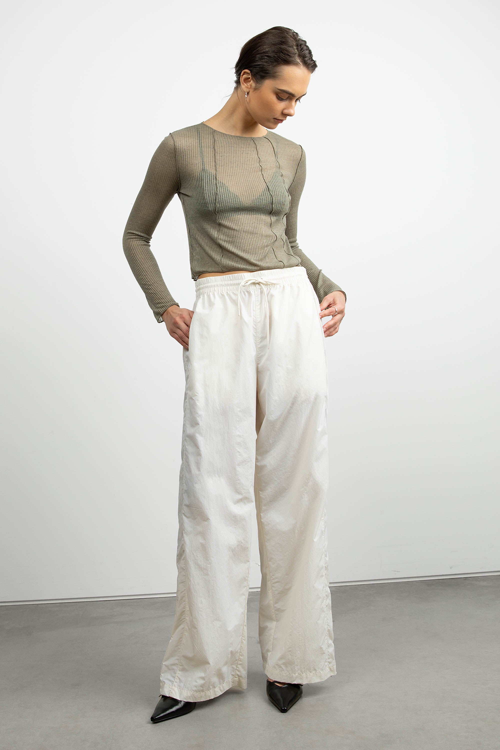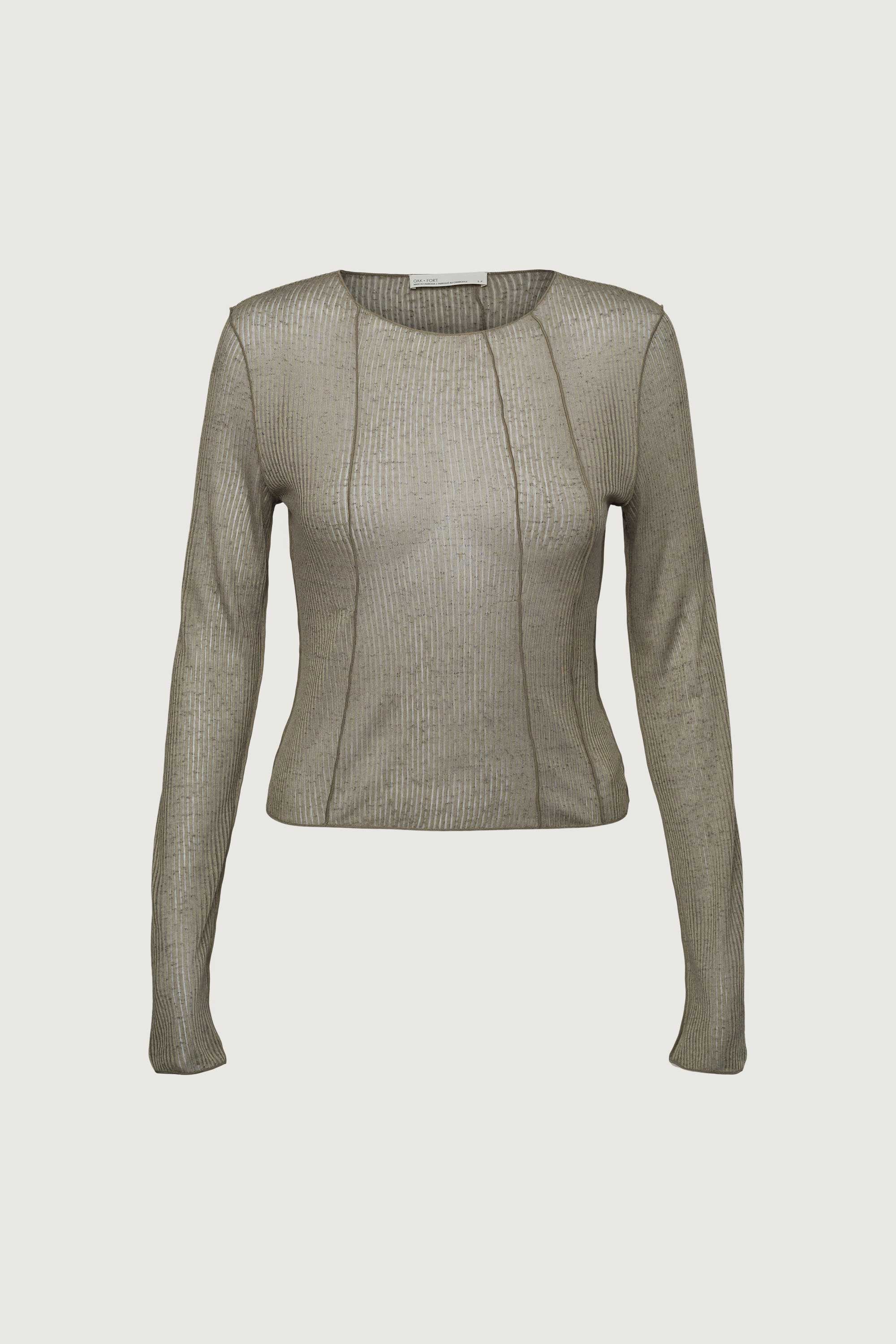 Lightweight rib-knit. Exposed seams. Asymmetric hem.