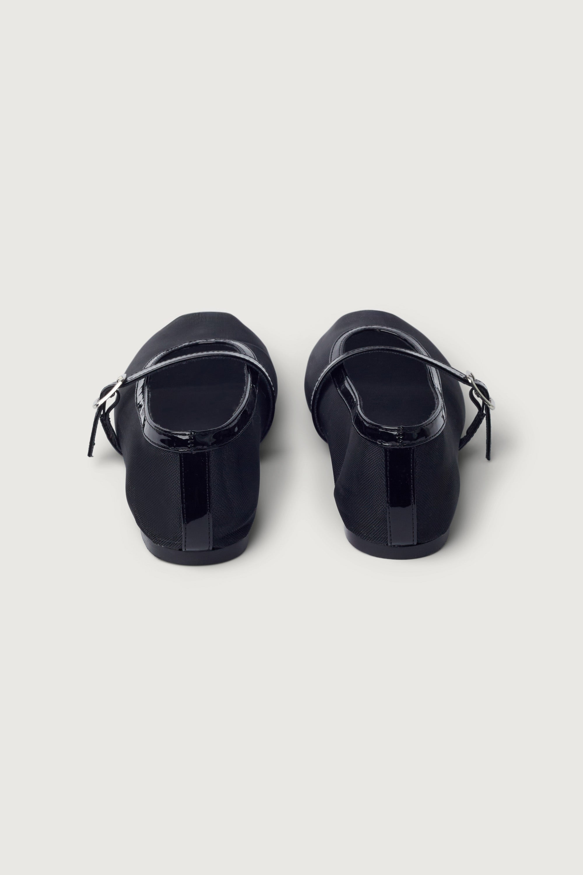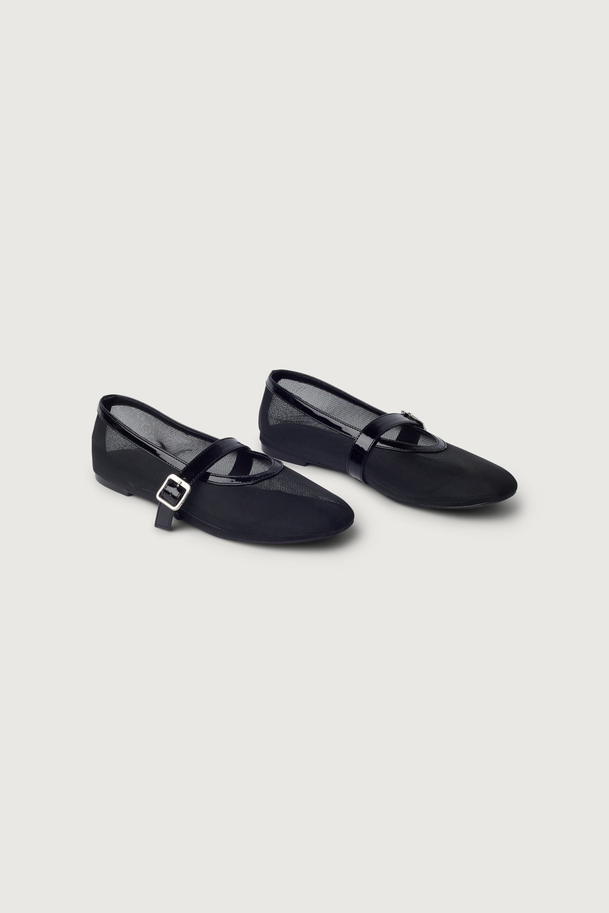 Ballet flat. Sheer mesh. Adjustable buckle strap.