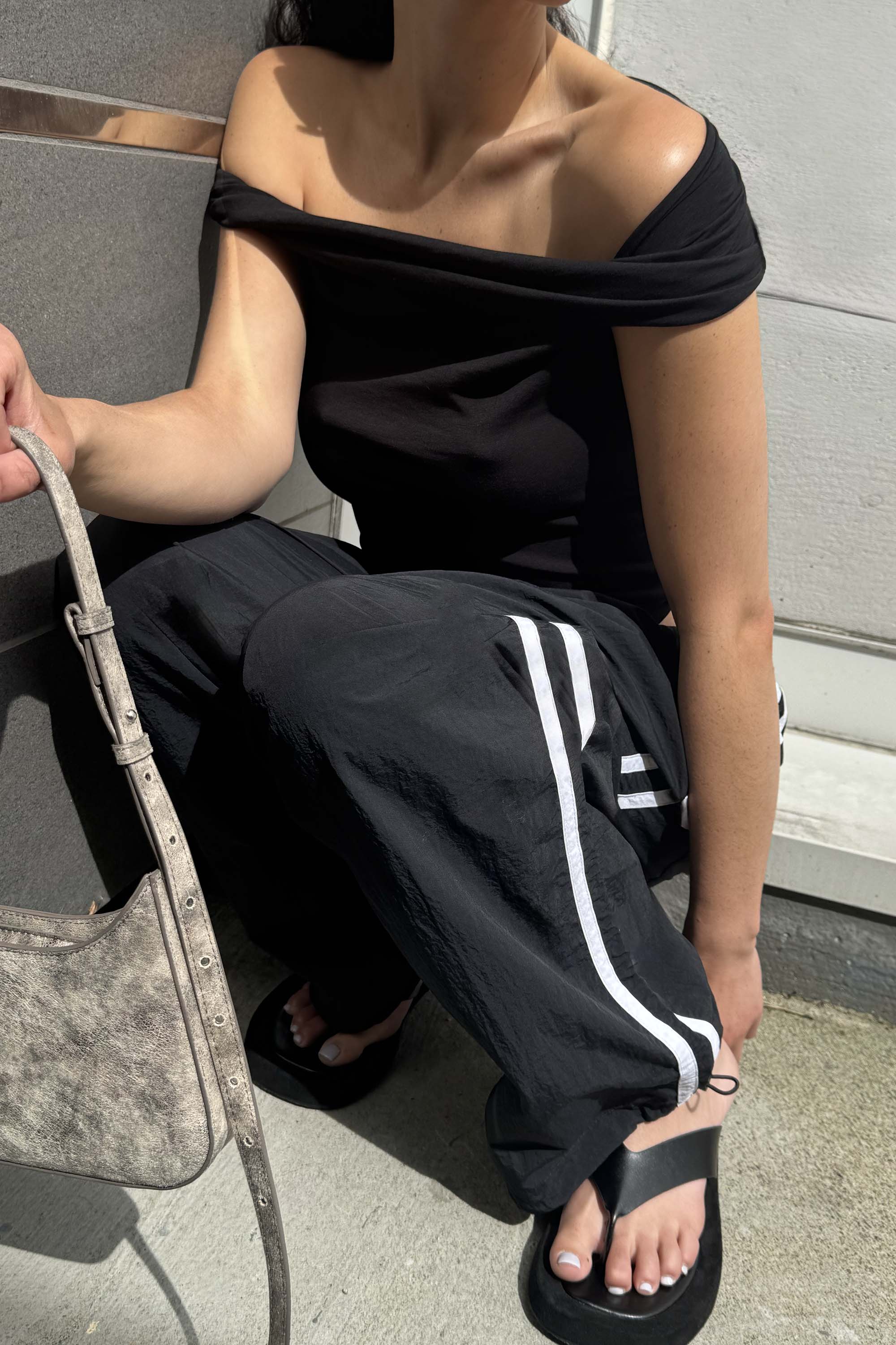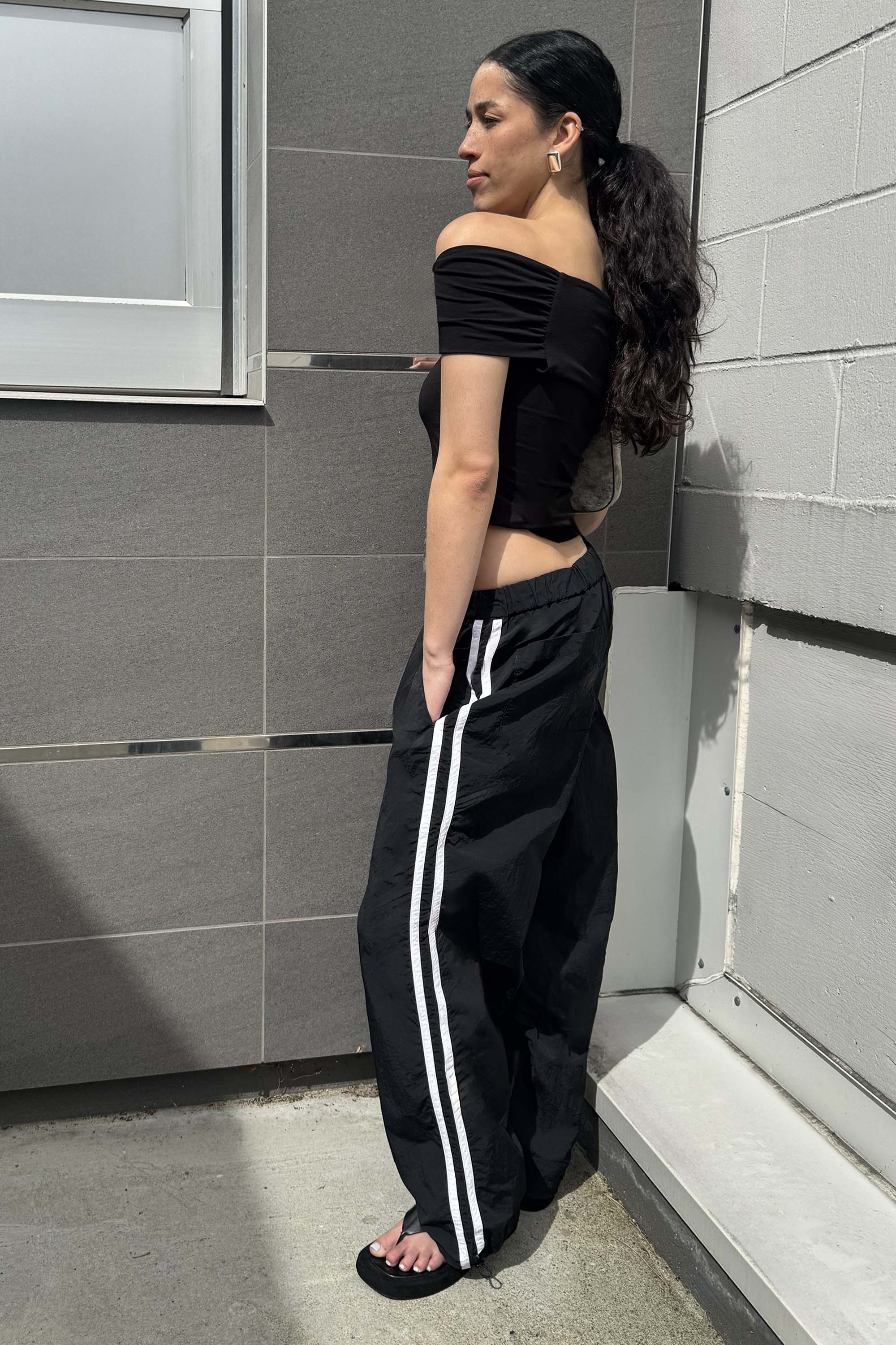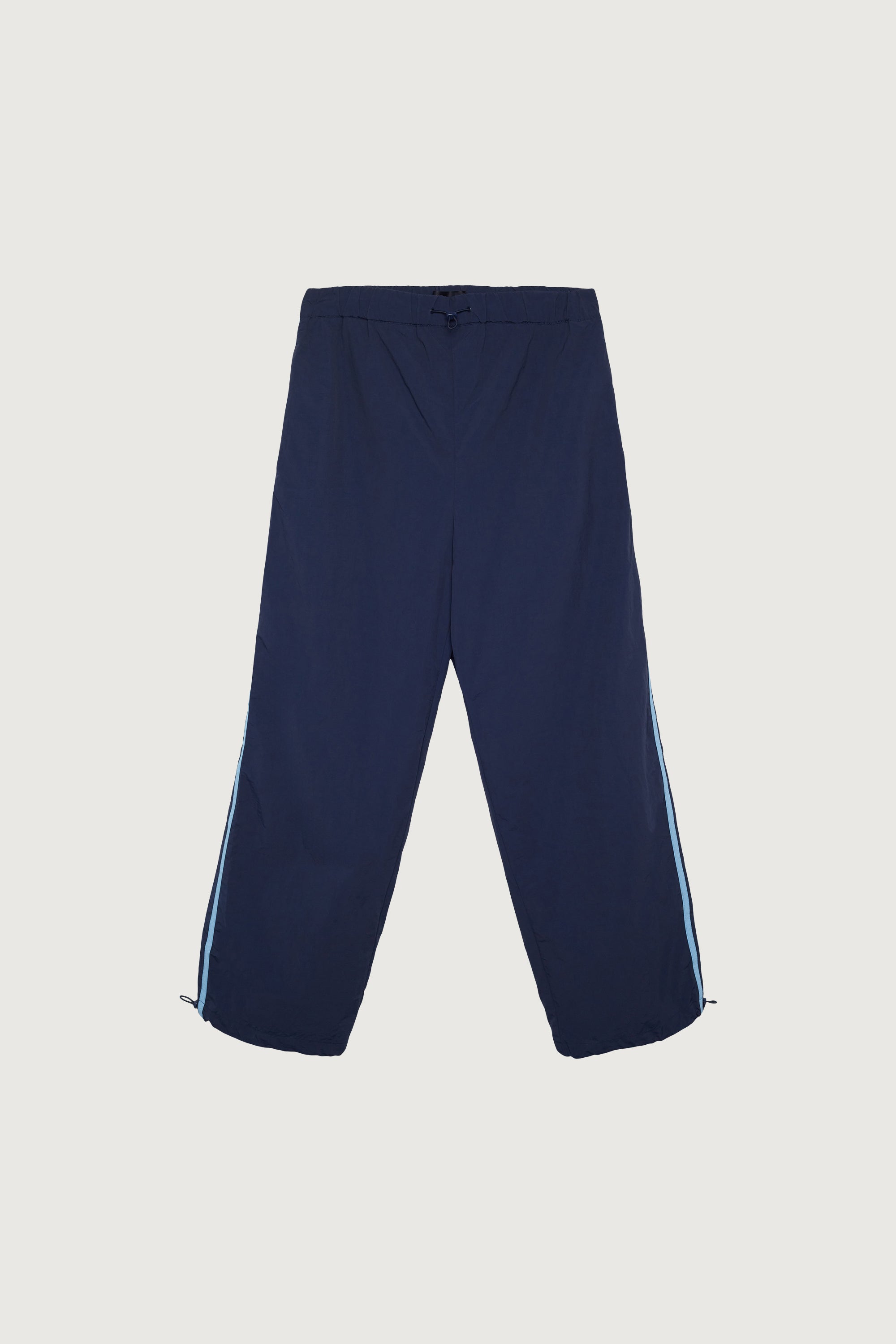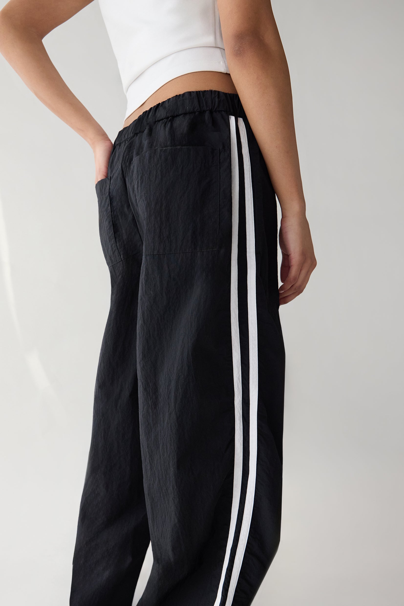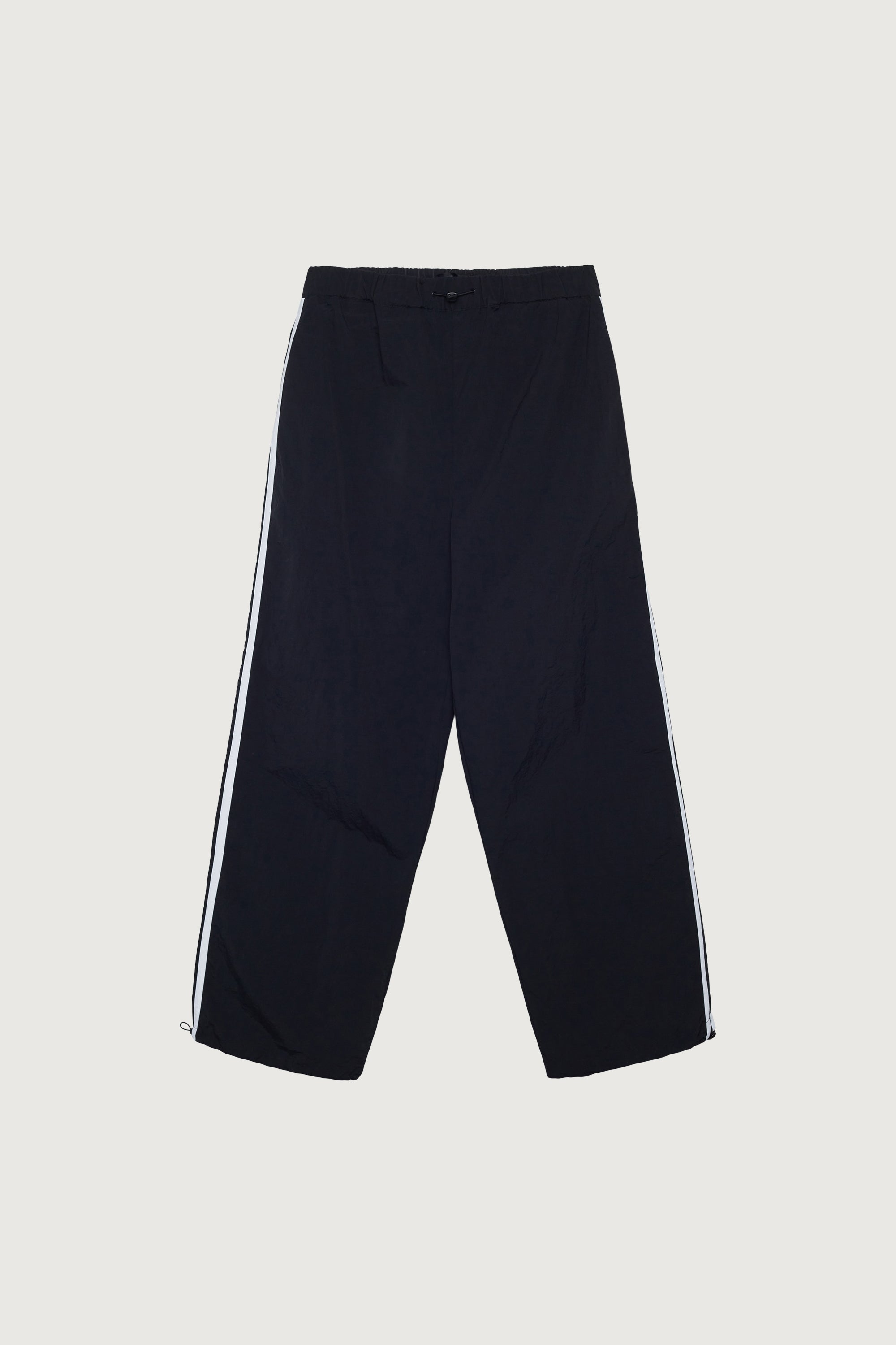 Oversized fit. Nylon. Adjustable elastic waist cord. Shockcord hem. Side and back pockets. 30" inseam.