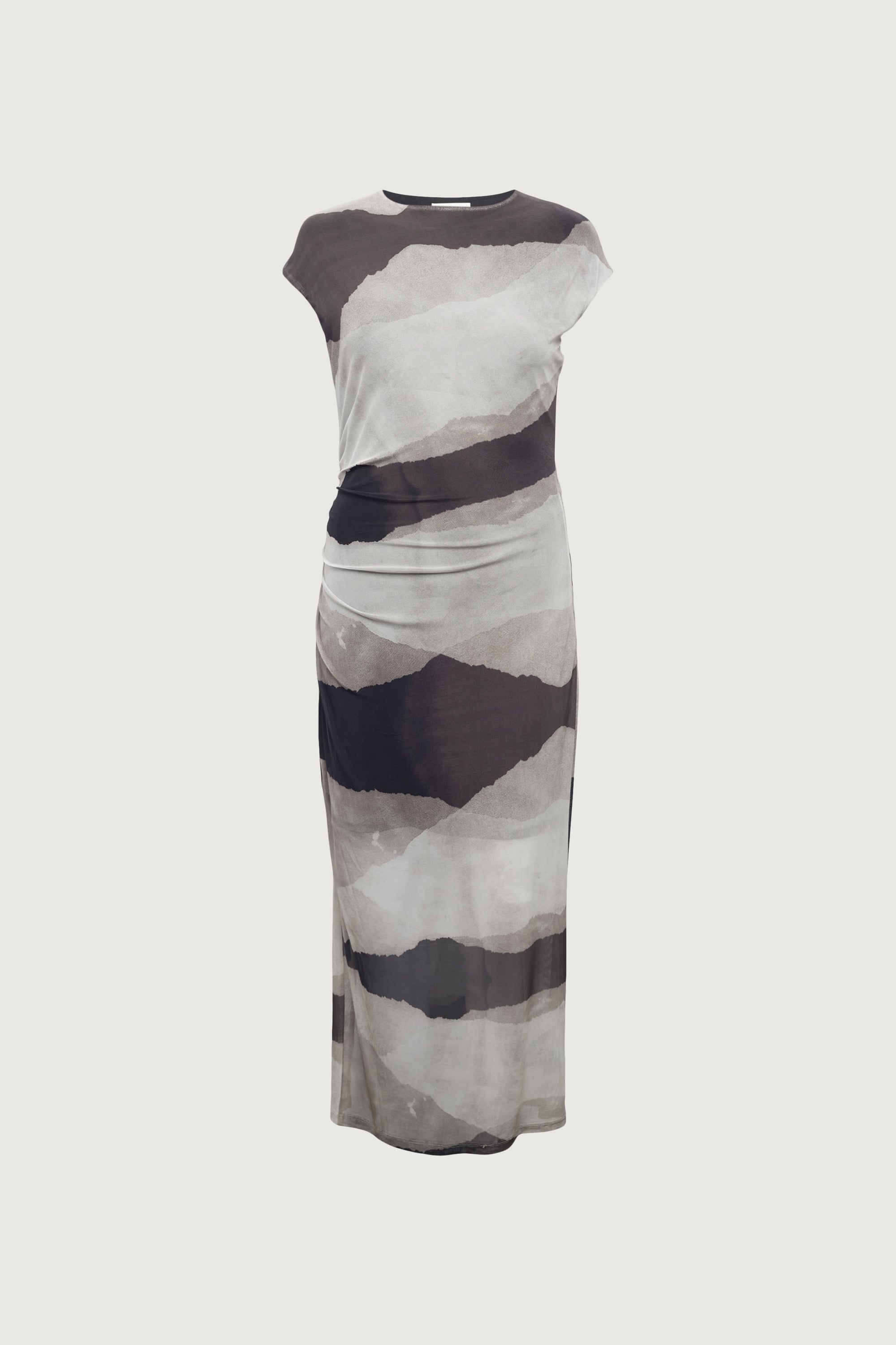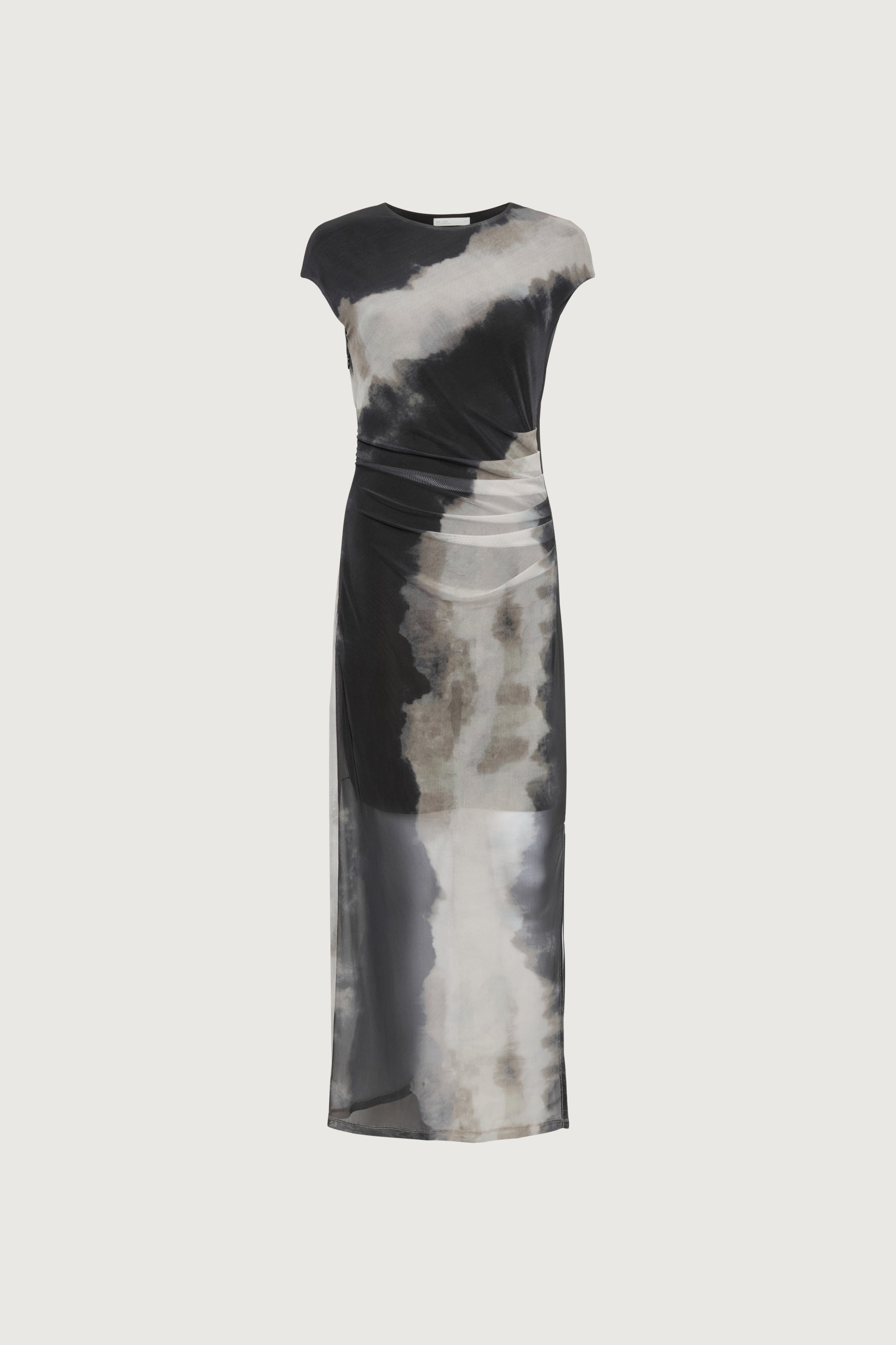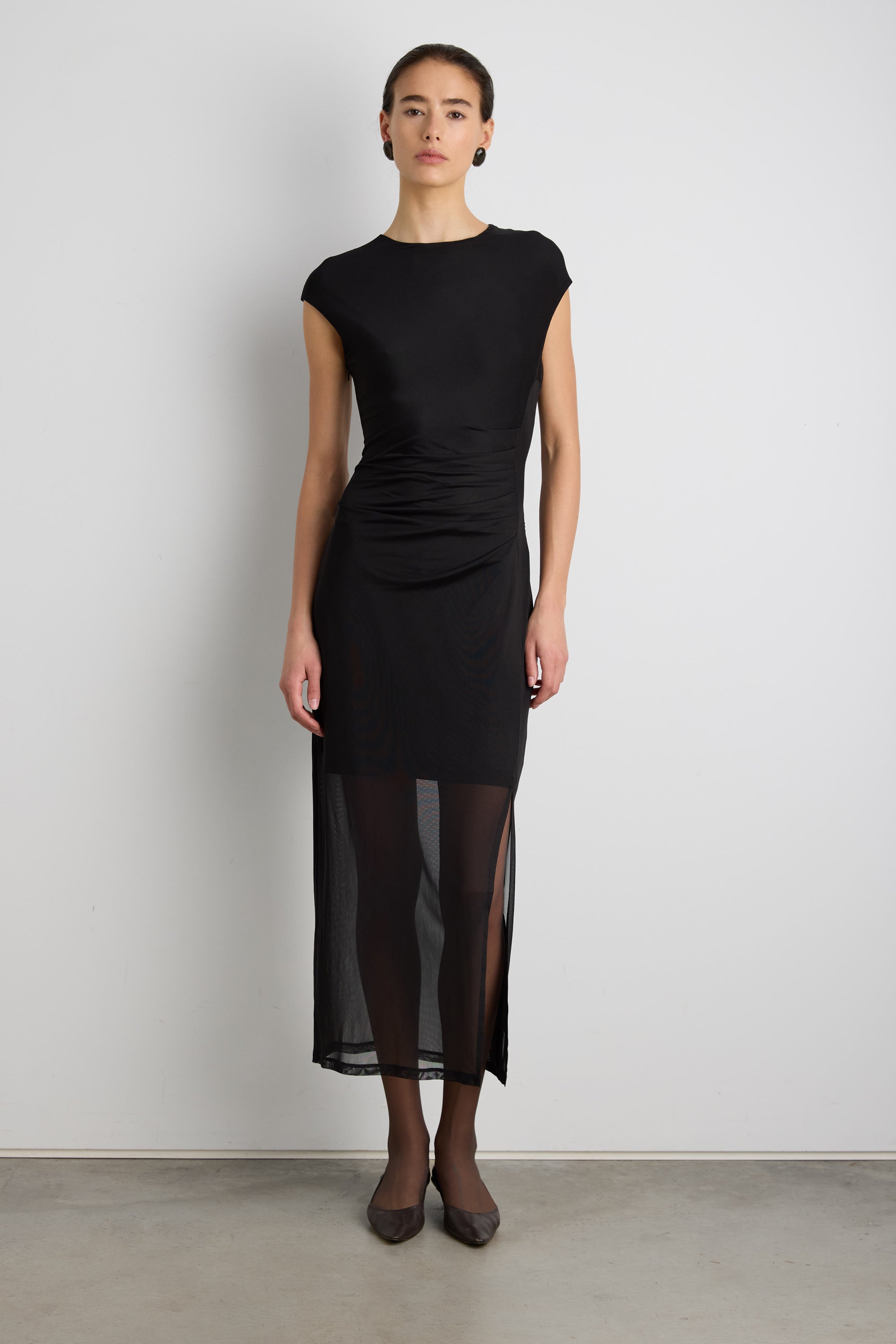 This sheer mesh patterned dress is made in a body-hugging silhouette and is lined half way to show off the legs. It's detailed with a high-neckline, a ruched side and a front slit. The perfect transitional dress you can wear with heels or knee high boots.