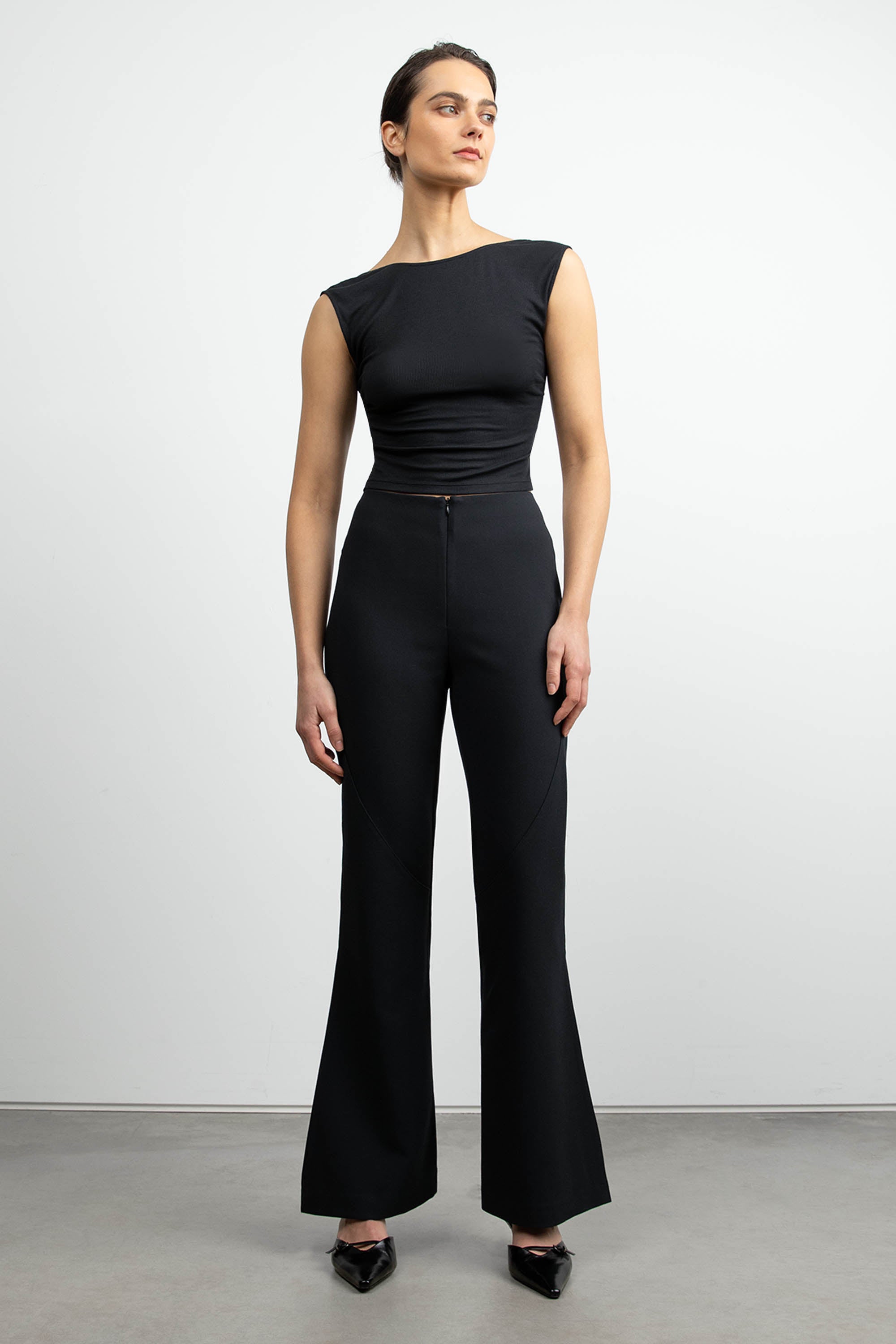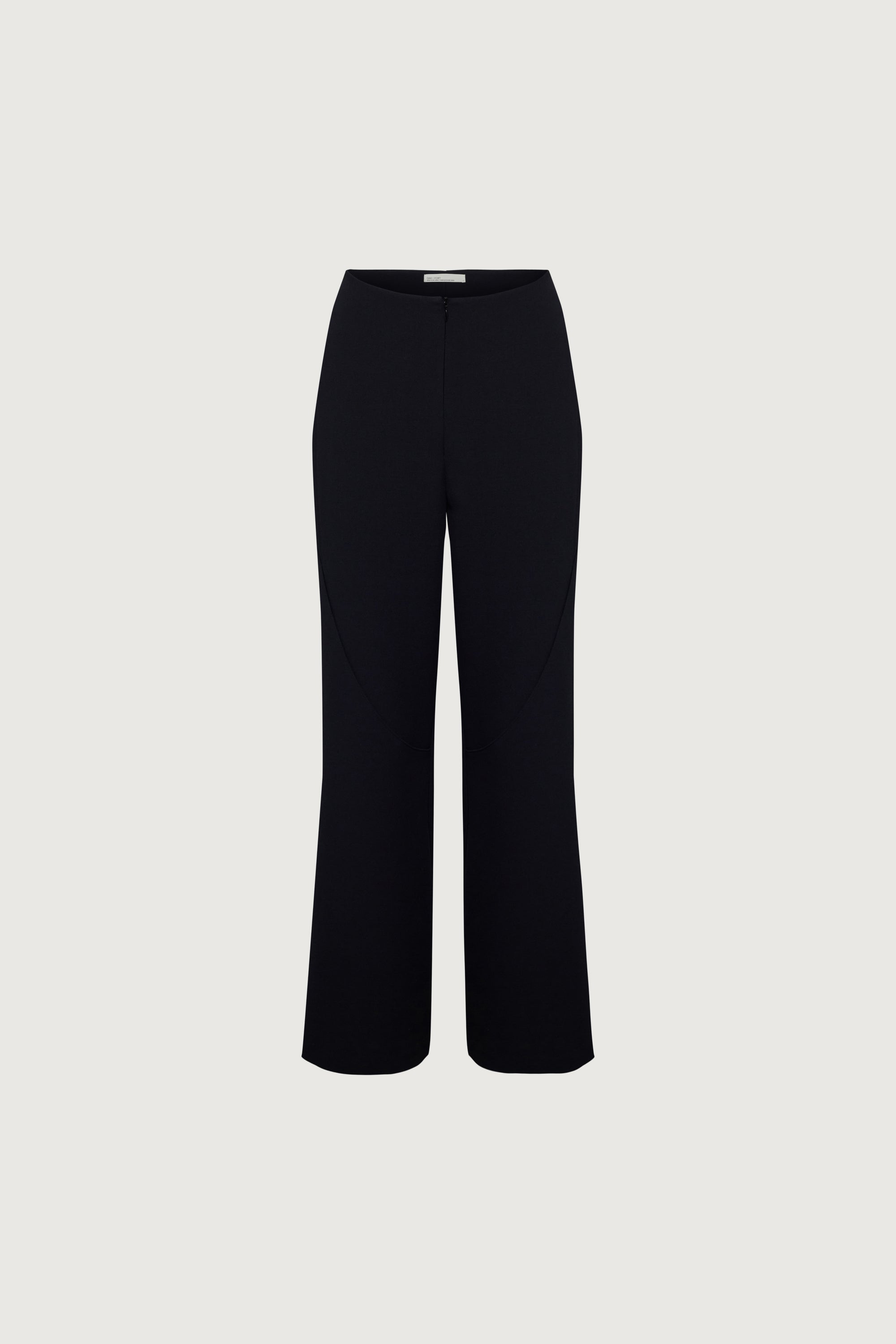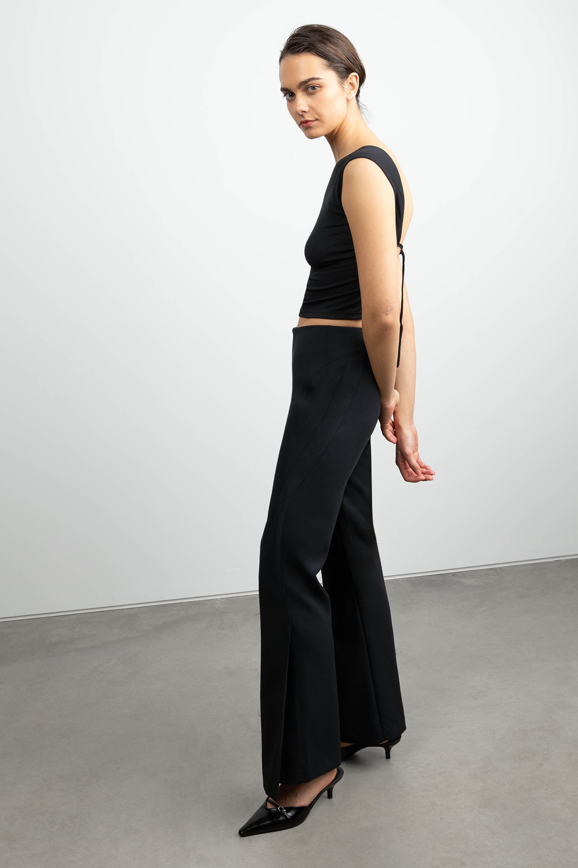 These mid-rise suiting pants are fitted at the waist and have a flared leg. It's detailed with a front zip closure and has a layered panel effect. A classic to own, wear yours with an open back top and pointed heels.