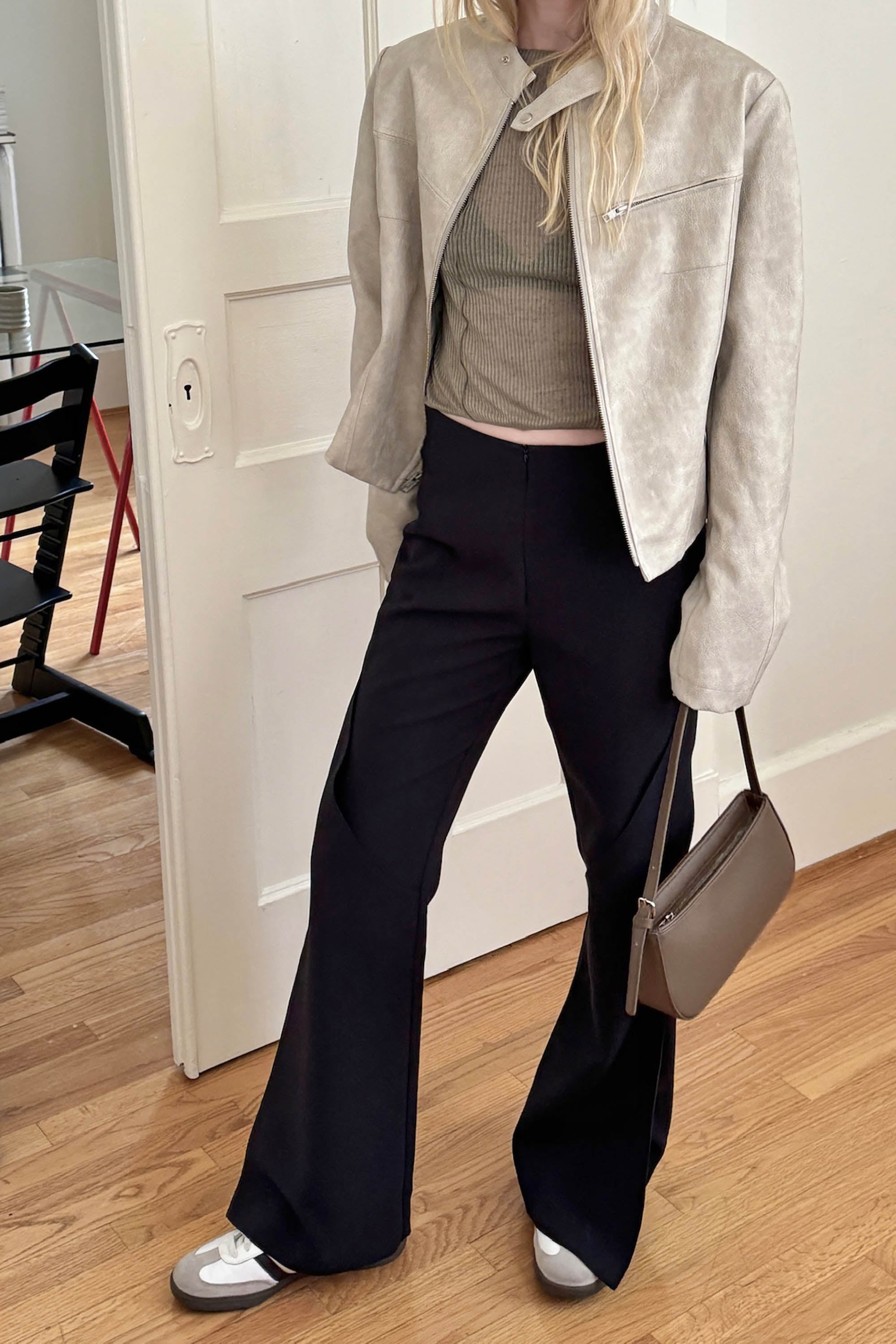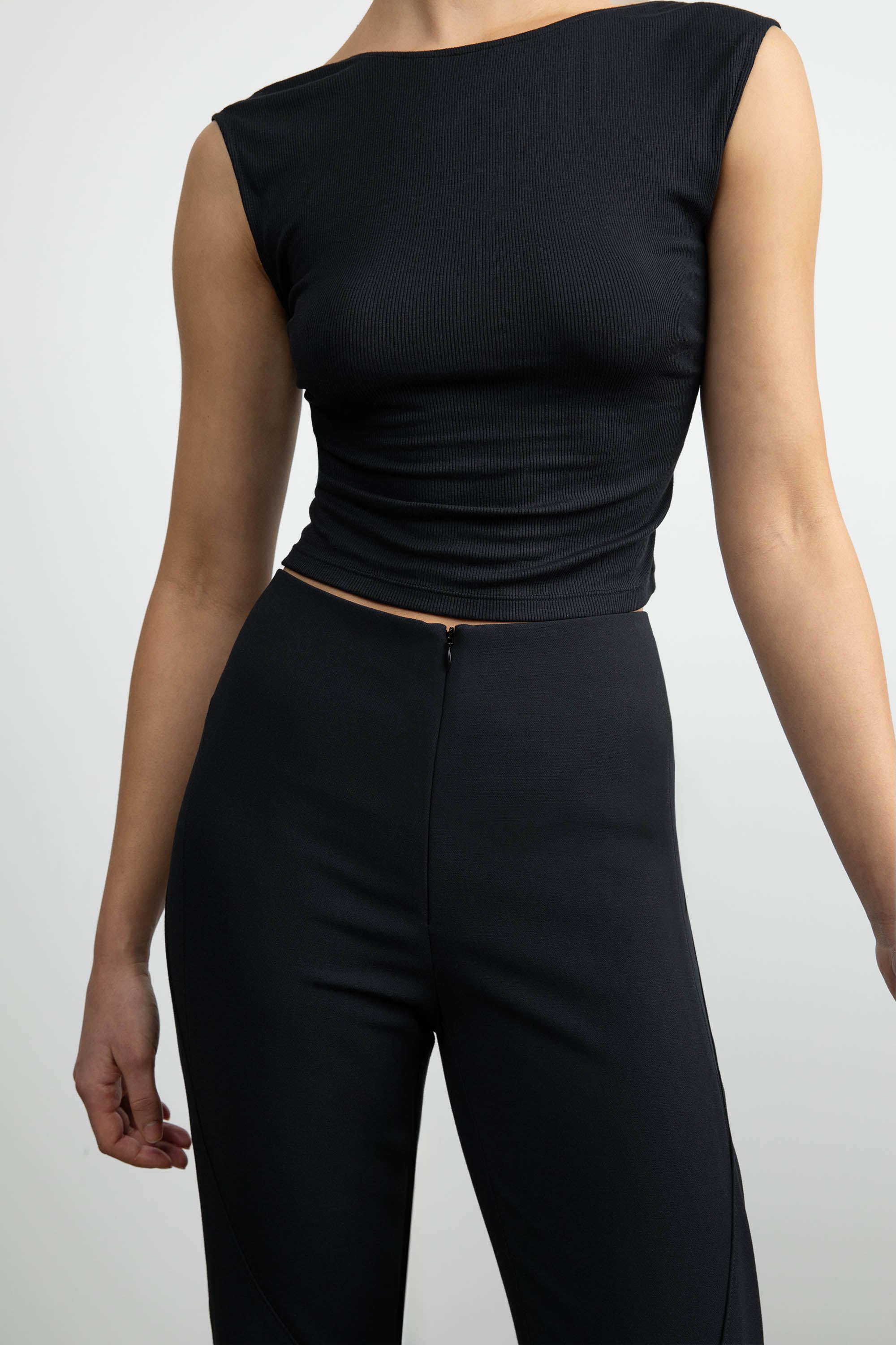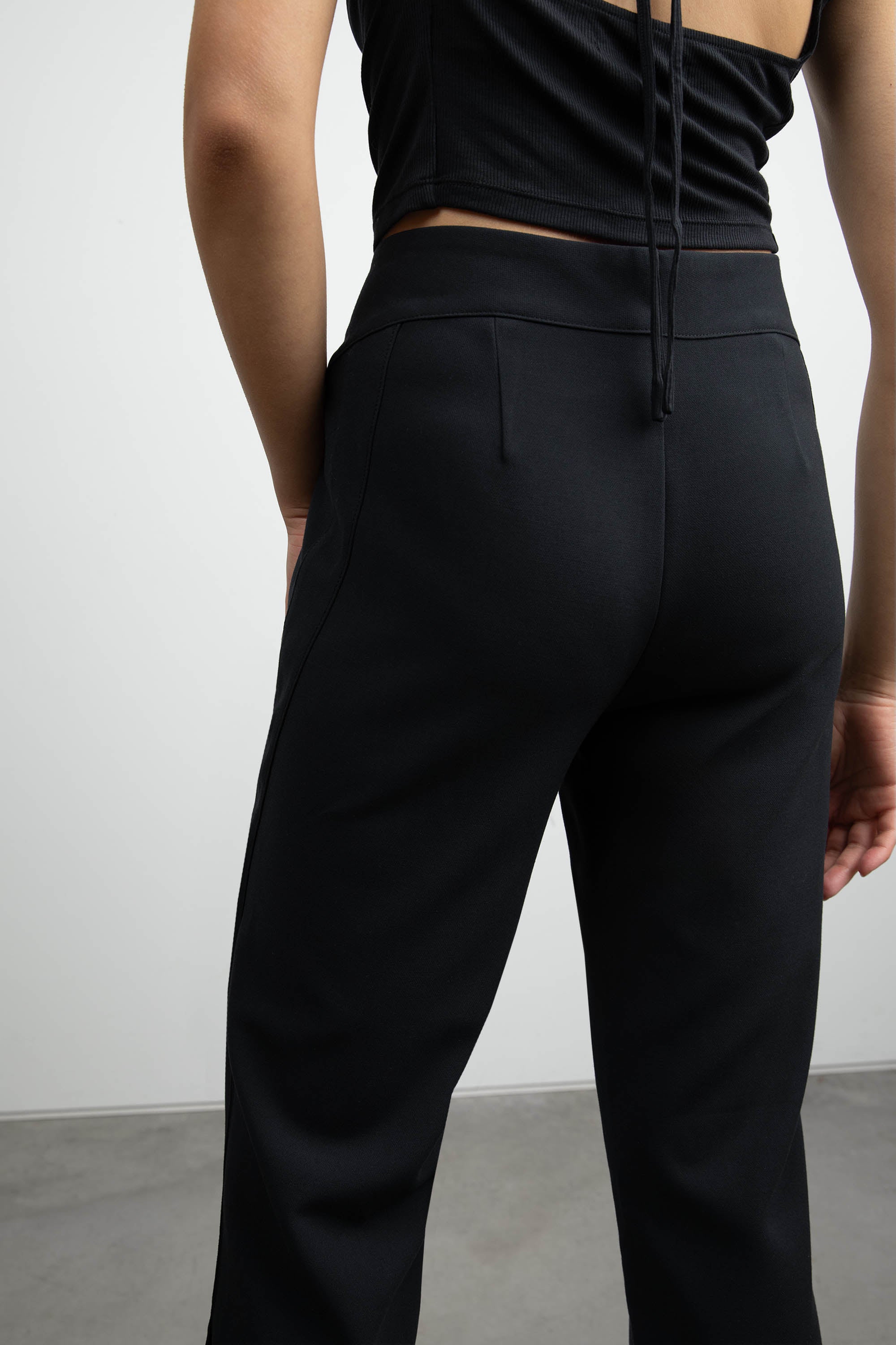 These mid-rise suiting pants are fitted at the waist and have a flared leg. It's detailed with a front zip closure and has a layered panel effect. A classic to own, wear yours with an open back top and pointed heels.