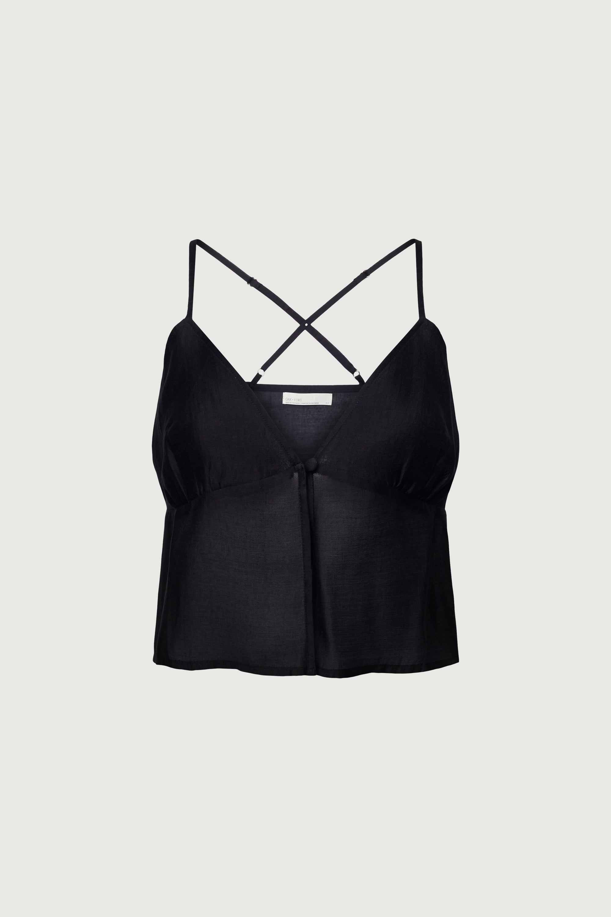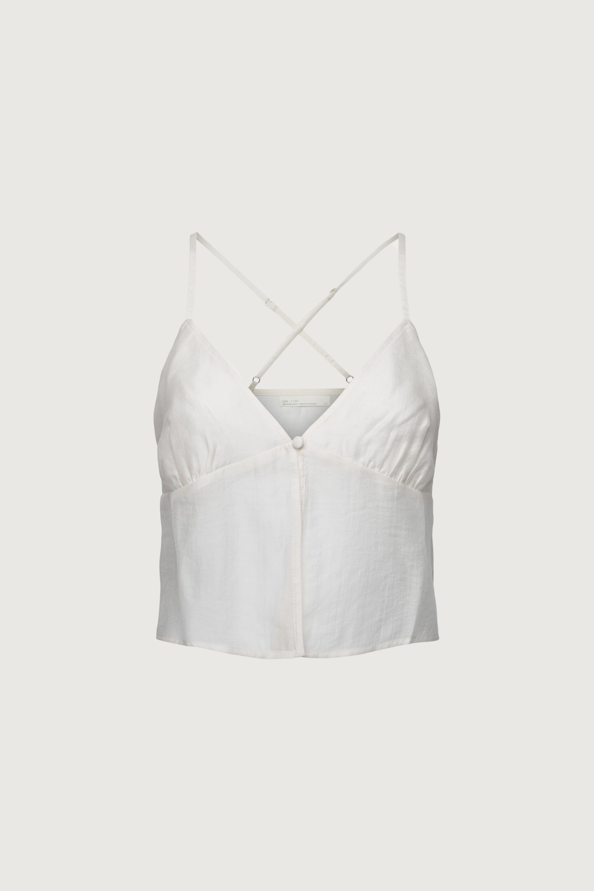 This cropped tank is made in a classic fit with a button front detail, a subtle sheer design and an open back with criss-cross straps. A summer staple you can wear with any bottoms from mini skirts to high-rise trousers.