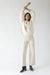 Long length. Mid-rise elasticated waist at the back. Full zip and button front closure.