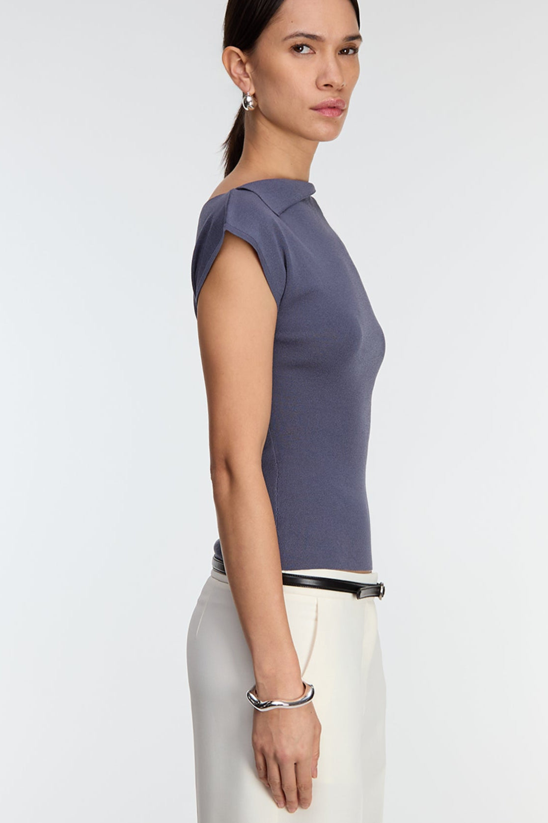 Asymmetrical off the shoulder cap sleeve sweater in grisaille — main image